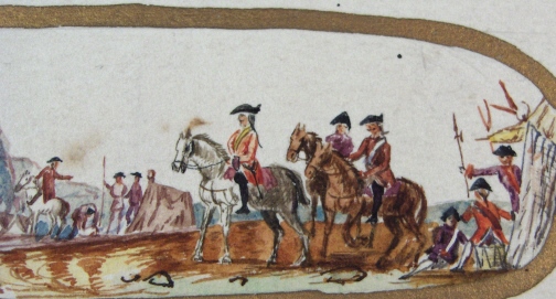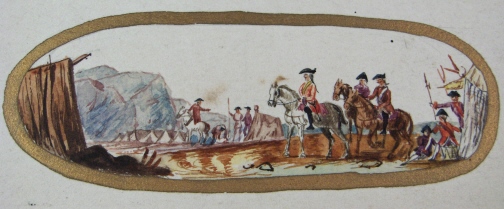 This is what I believe to be a very rare original template on paper that the porcelain painters did in watercolors before actually painting these on porcelain. It would date to pre 1750 since the flowers are still the woodcut type and this template was for a Meissen miniature design. It is a battle scene with soldiers in tents and on horses. Gold rim around the design and the rest of the paper has the woodcut style flowers on it. Meissen crossed swords mark on the bottom of the paper as well as a black number 6. I bought these designs from a lady who had a large collection of them but other than that I have almost never seen these outside museums. The paper is 6 inches tall and 9 inches wide with the design being about 4 inches by 1.5 inches. I will eventually have these framed to show off on the wall. It is in good condition with a bit of staining one would expect over 200 plus years with paper. Please email me for more information or other pictures.