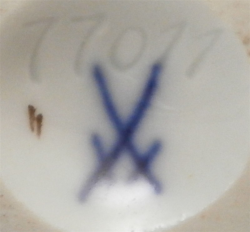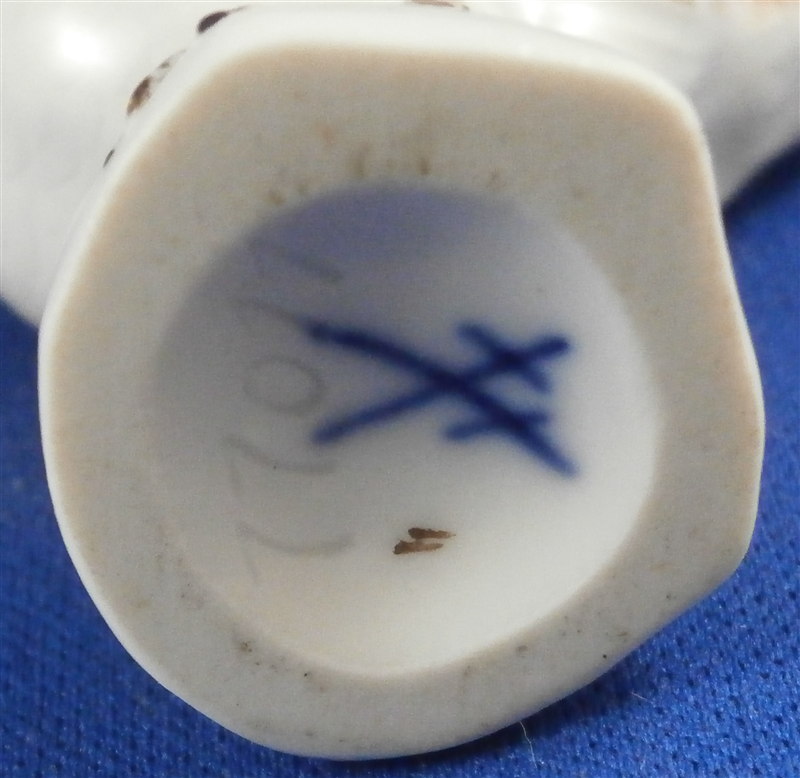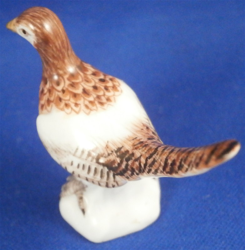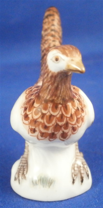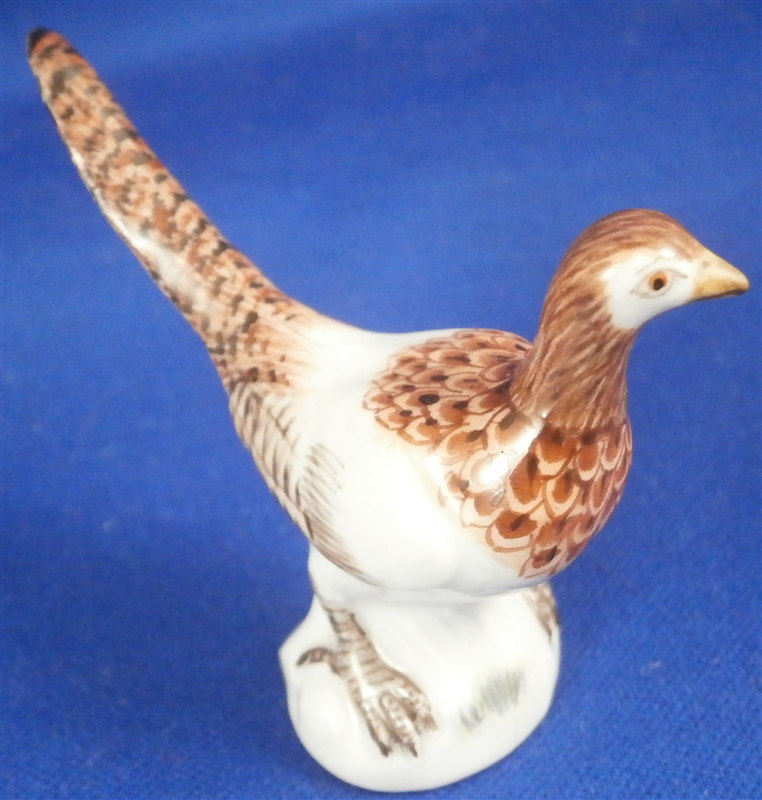 This is a miniature figurine of a female pheasant aka hen made by Meissen in the 20th century. The bird is very well modelled and painted with it sitting on a little base with grasses painted on. The pheasant is hand painted with lots of detail and really quite nice looking with its tail up in the air. Amazingly it is in perfect condition. The piece is marked with the blue swords underneath as well as the usual impressed numbers of the period. Also a painter's mark 11 in brown. The bird is 1.75 inches tall including its tail, 2.25 inches deep and 0.875 inches wide. Please email me for more information or other pictures.