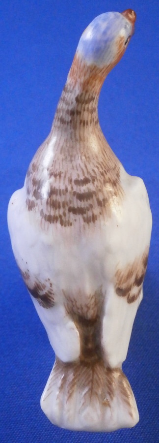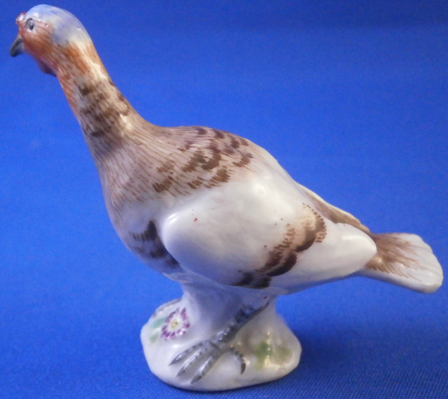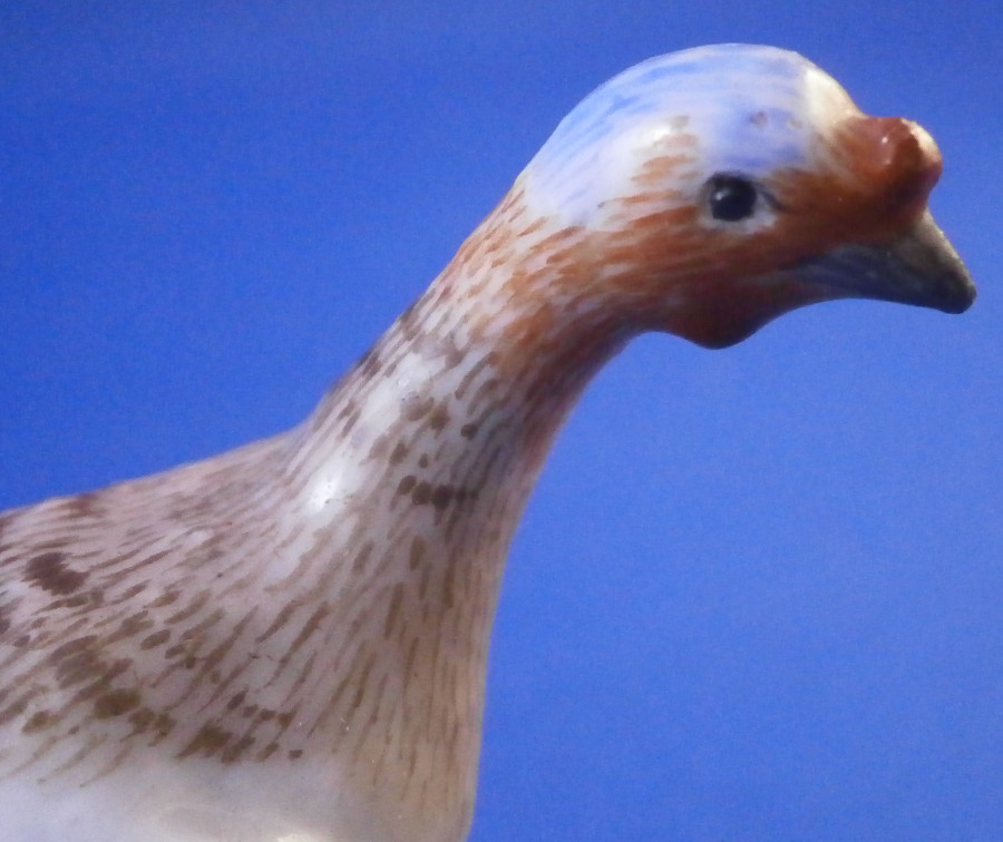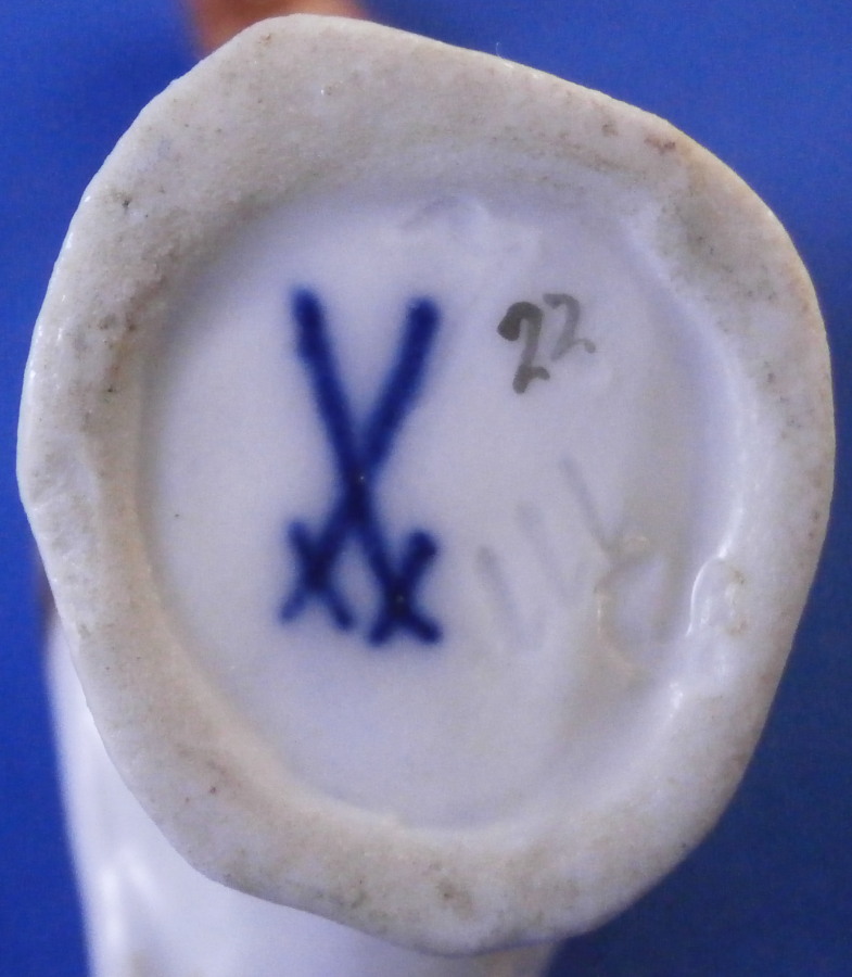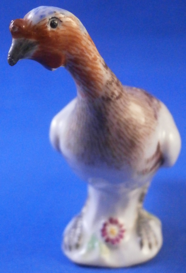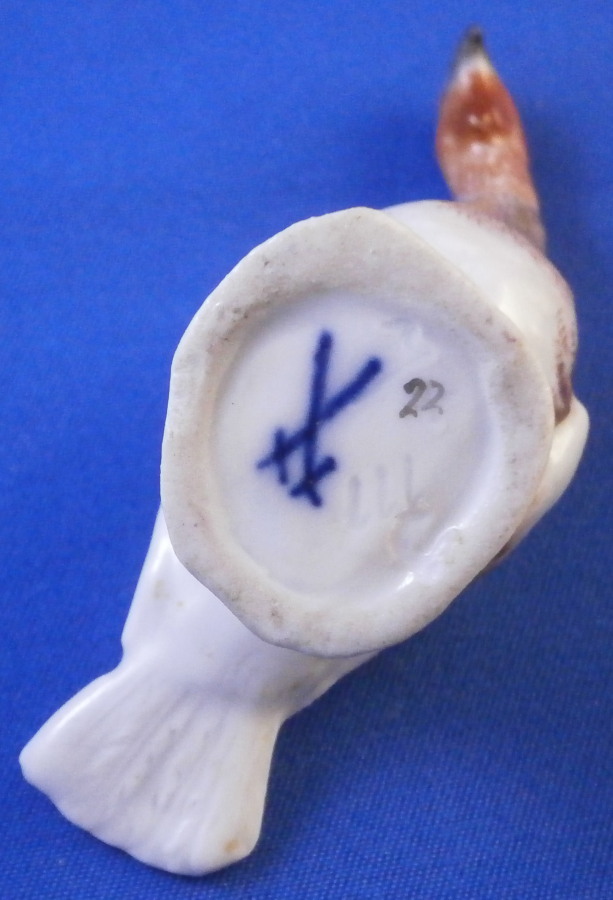 This is a miniature lady / female turkey (aka hen ) made by Meissen in the late 19th or early 20th century. Nicely modeled and hand painted as one would expect from the top maker! She is standing on a little base painted with some grass and a flower to the front. The figure is in perfect condition which is always nice. It is marked underneath with the under glaze blue crossed swords mark as well as the usual impressed marks as well as a painters mark in form of a black 22 as shown. The bird is 2 inches tall, 1 inch wide and 2.375 inches long. Please email me for more information or other pictures.