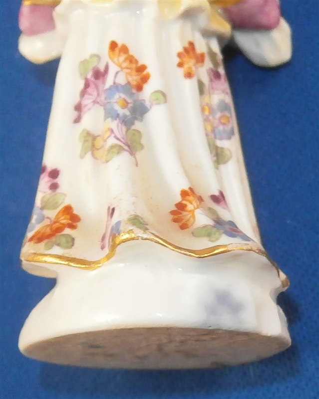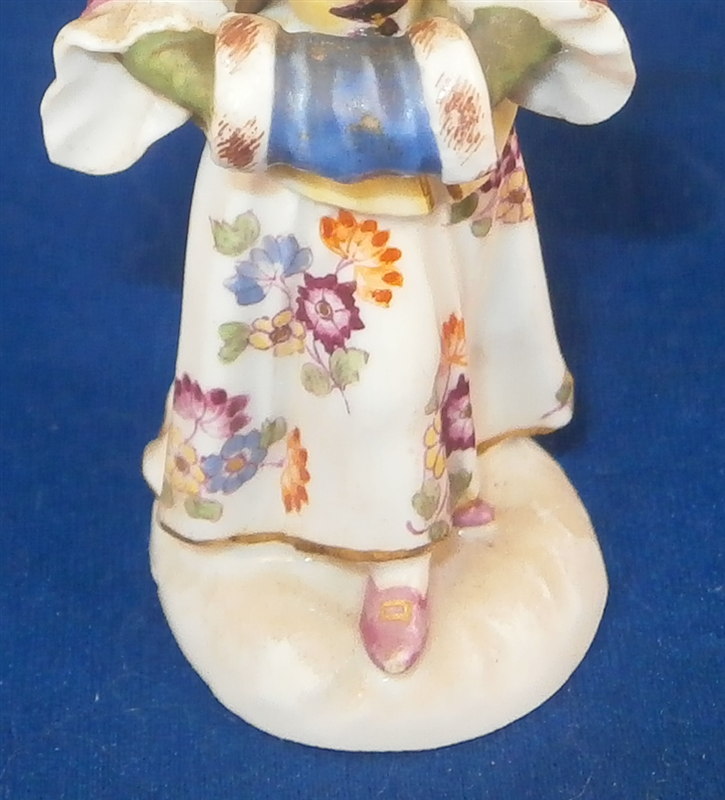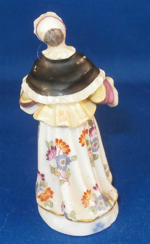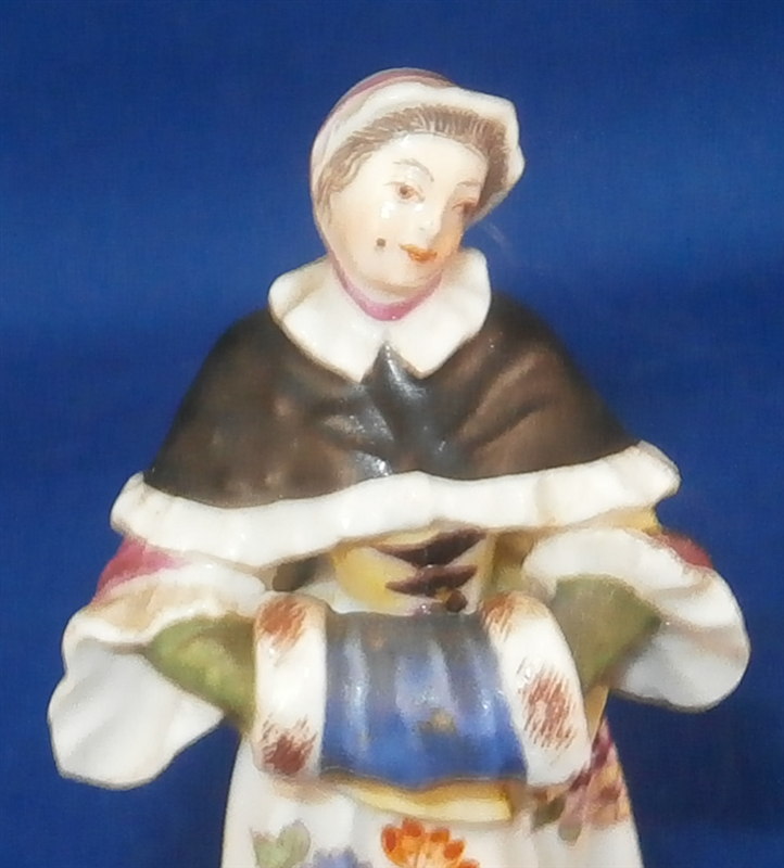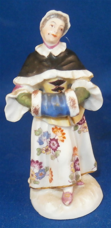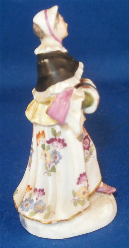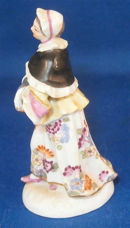 This is a superb and rare true miniature figurine made by Meissen in the 1750's. These are the earliest miniatures you can find by them and they are really fun pieces to look at and even though they are tiny they show the typical Meissen quality! The figure is of a lady dressed in winter clothing with her hands in a muff to keep them warm. The skirt has some amazing flowers on it and the mudd has fur painted on the sides plus lots of more amazing detail. A well modeled piece and extremely well painted even down to the beauty mark on her face like the Cindy Crawford of her days :) She is in perfect condition with just two spots of wear to the black covering her shoulders. Very minor and she displays perfectly! The figurine is 2.375 inches tall, 1.25 inches wide and 1.125 inches deep. She is marked on the back of the base as shown and quite obviously Meissen! Please email me for more information or other pictures.