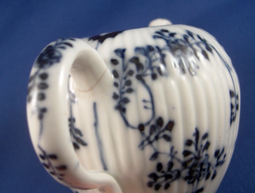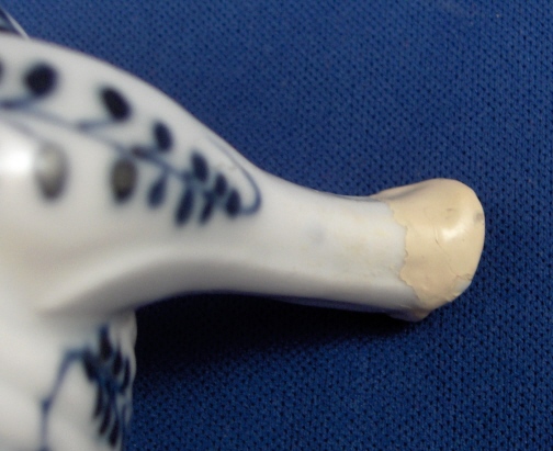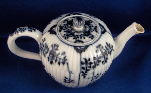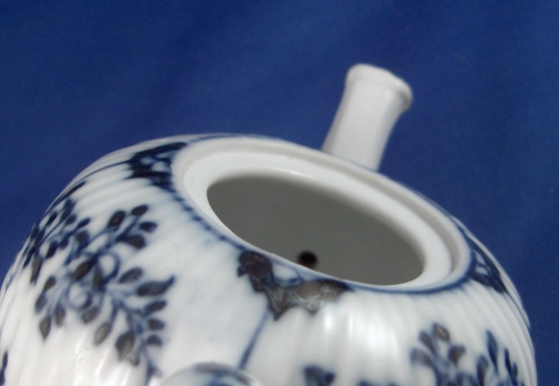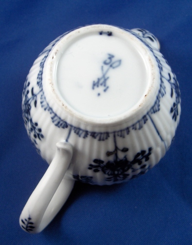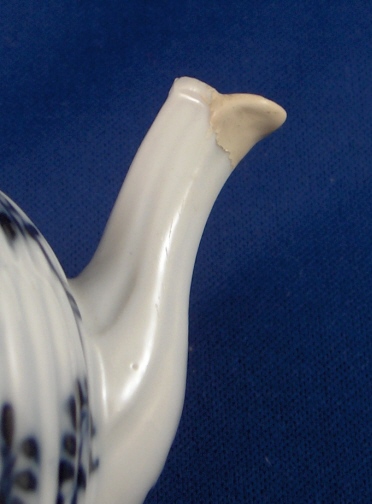This is a rare early miniature teapot made by Meissen in about 1735. It is in great condition with a hairline on the top of the handle where it attached to the body and a restored chip to the bottom of the spout. The pot is handpainted with the very old blue when Meissen still had issues with the color and the paste has a relief design to it. The old blue had an odd sheen to it when held at the right angle to the light which I tried to show in a picture. Marked with the straight blue crossed swords to the bottom with the lines at the ends and a dot below (not between like the 1760's mark!). There is also a painters mark to the footring but I cannot make it out and the number 30 in underglaze blue. Also an X incised and a 3 (?). The pot is 3 inches tall, 3.125 inches wide and 5.375 inches long. Please email me for more information or other pictures.