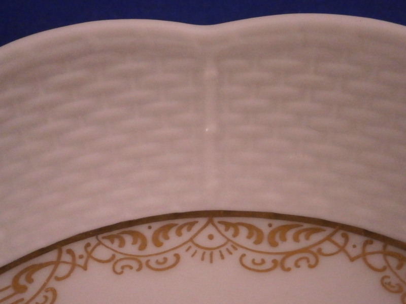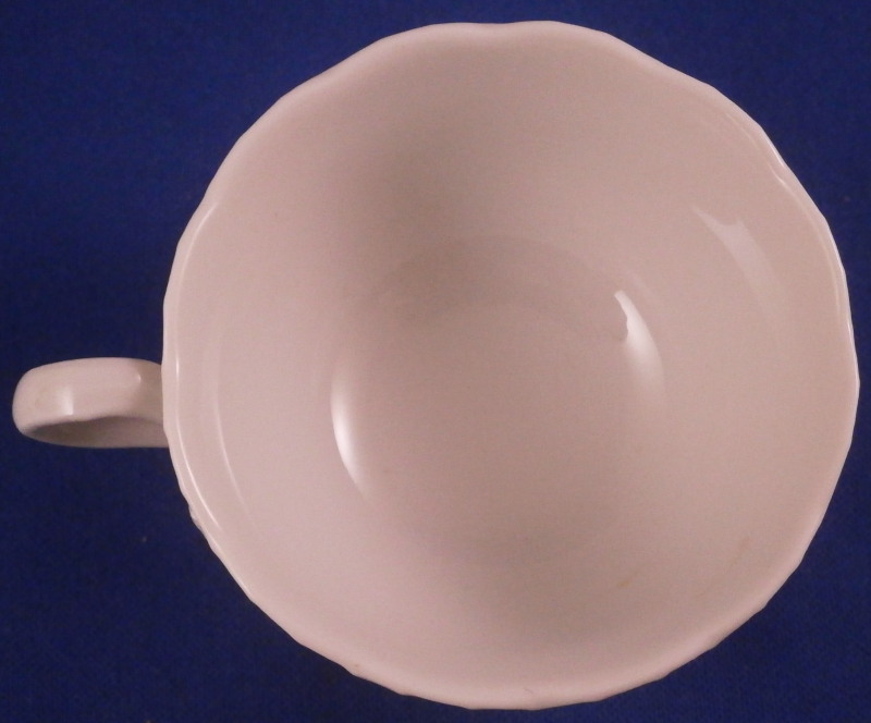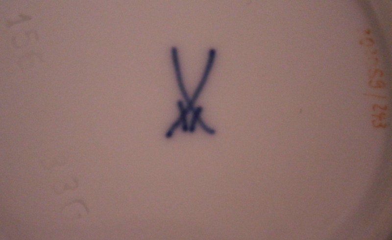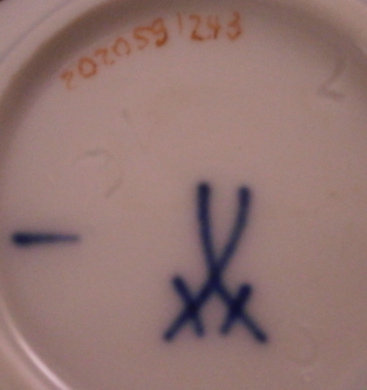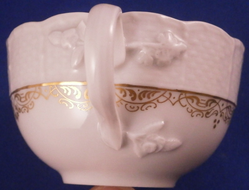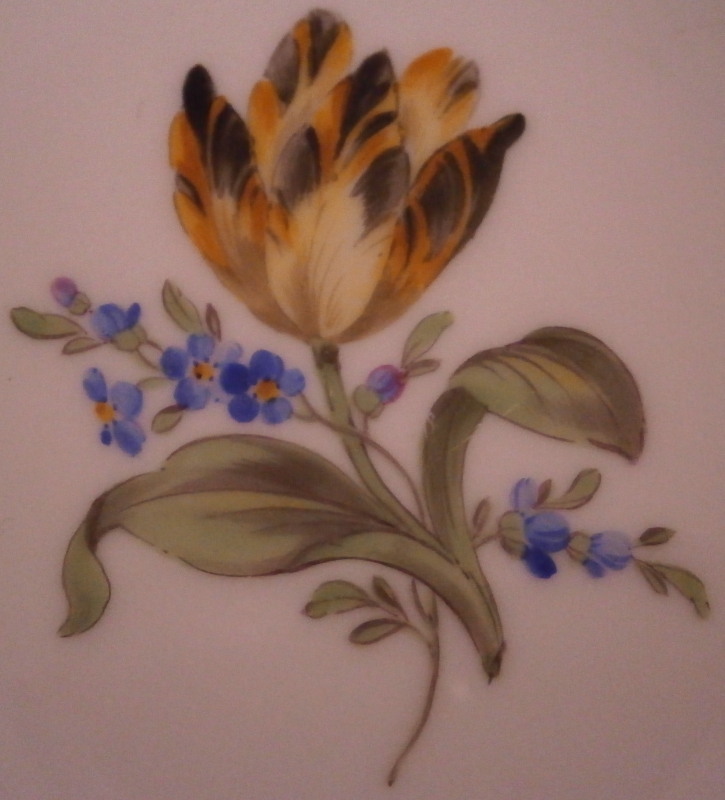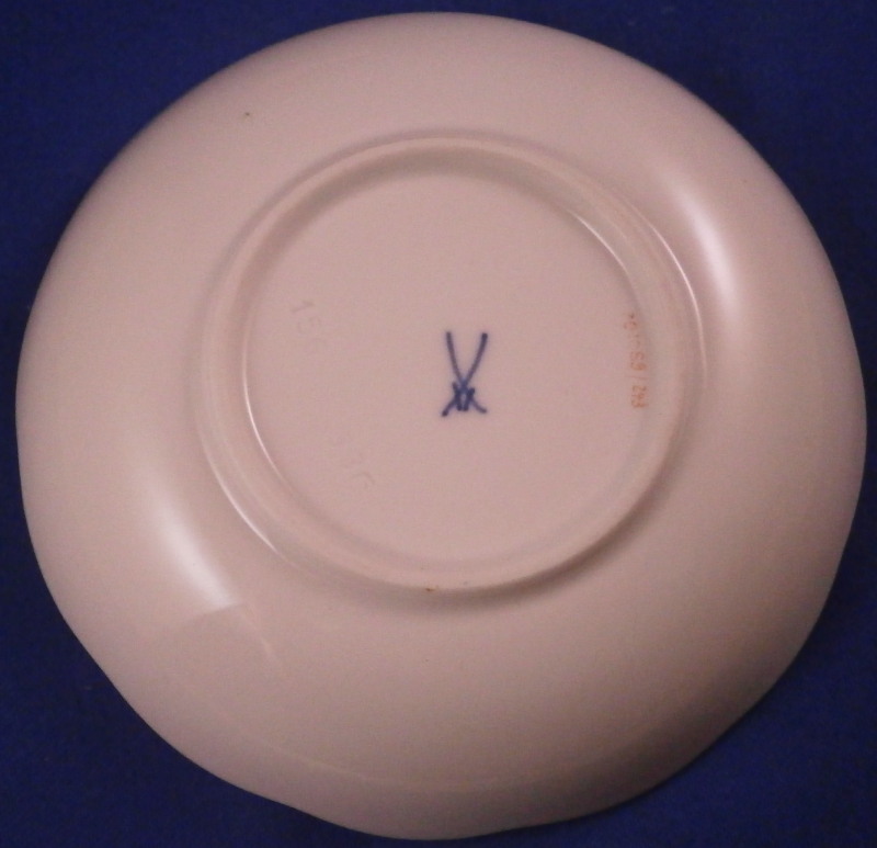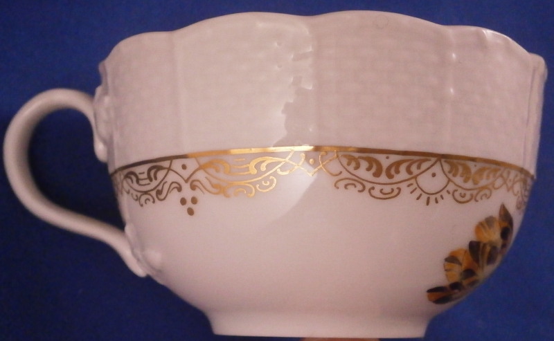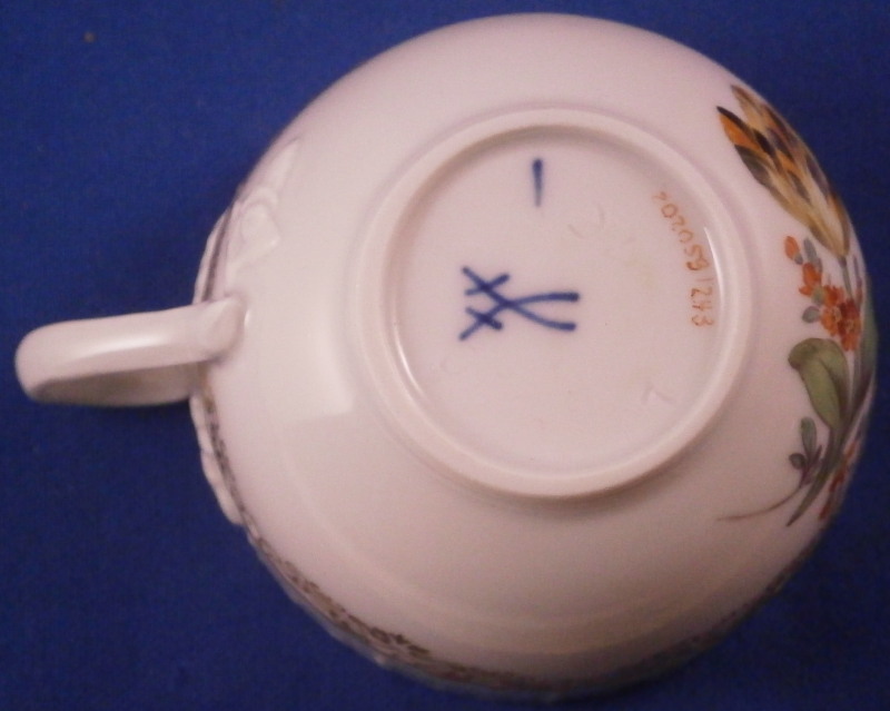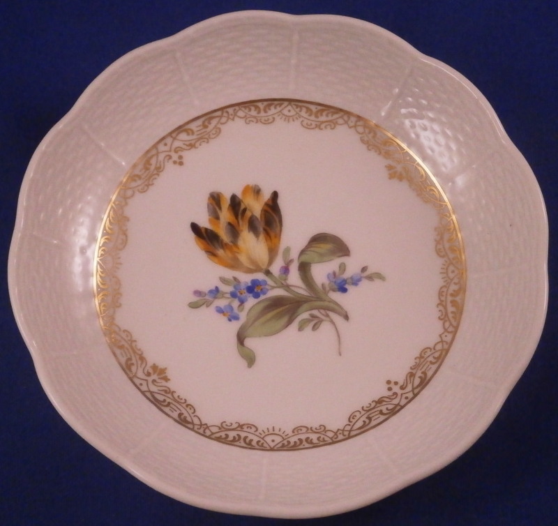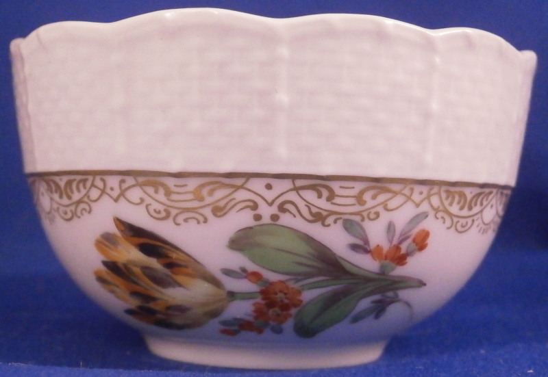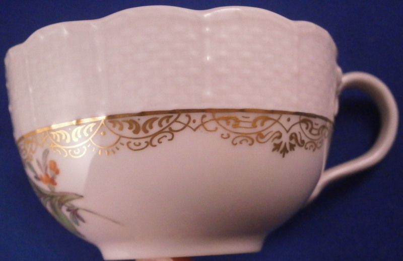 This is a nice cup and saucer made by Meissen in the 20th century. A nice modern twist on an 18th century shape with the gold trim around the center instead of the edge. The rim of each piece has a basket weave design to the paste and the center of the saucer as well as the front of the cup has a nice floral arrangement hand painted on it including a superb tulip. The set is in perfect condition. The saucer is 1 inch tall and has a diameter of 4.75 inches. The cup is 1.625 inches tall and has a diameter of 2.75 inches. Both are marked underneath with the under glaze blue crossed swords as well as the usual impressed numbers / letters common to Meissen pieces of this period and some red numbers as well. Please email me for more information or other pictures.
