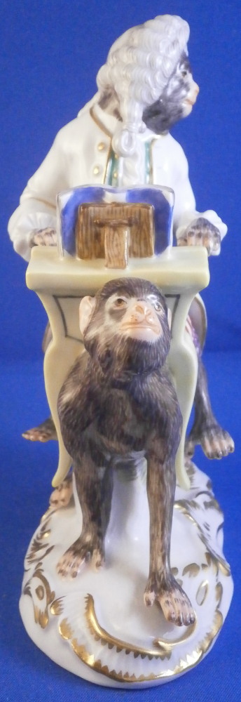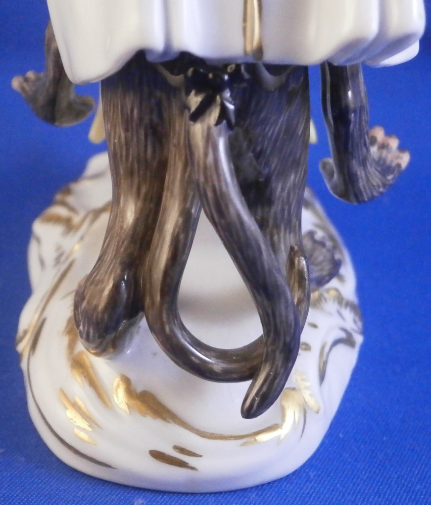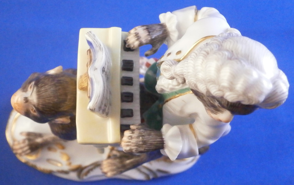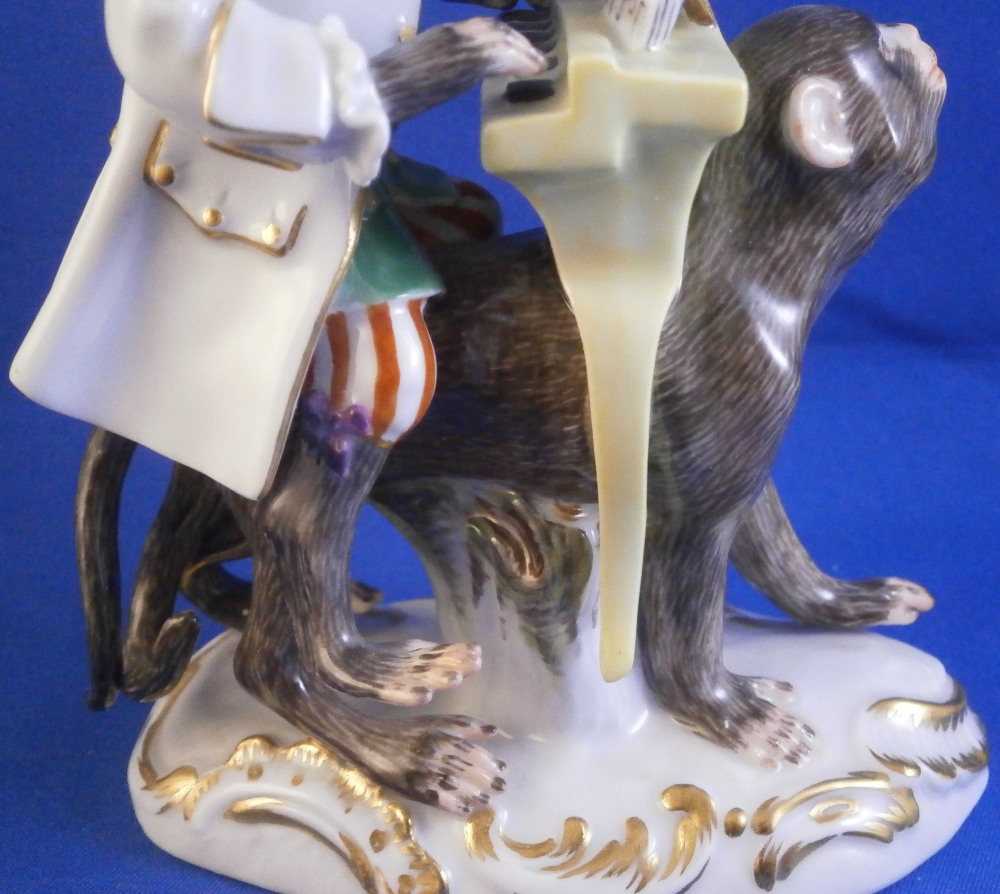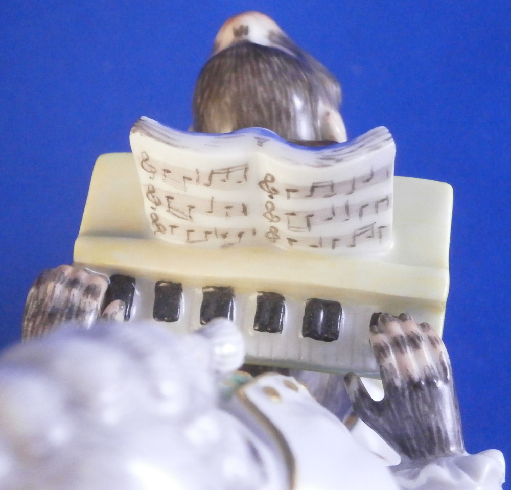This is a fun figurine of a piano player from the monkey band series made by Meissen in the alter 20th century. A very well executed figurine of a popular topic. Very well modeled and hand painted perfectly. It is a really nice example and in perfect condition which is not all that common for this model! The one monkey is sitting on top of another monkey that is on all fours with the piano in the front. The piano player is wearing a wig and is nicely dressed while the other monkey just has fur painted on it. All on a nice base with some nice gold scrolls all around. It's a great looking figure and one of the main ones from this series. Quite hard to find! The figurine is just over 5 inches tall, 2.125 inches wide and 3.75 inches long. This piece is marked underneath with the under glaze blue crossed swords mark as well as the unsual impressed numbers and a painter's mark as shown. These figures from this band are so much fun to look at and the monkey band players are some of the most collected figures in porcelain even today. Please email me for more information or other pictures.
