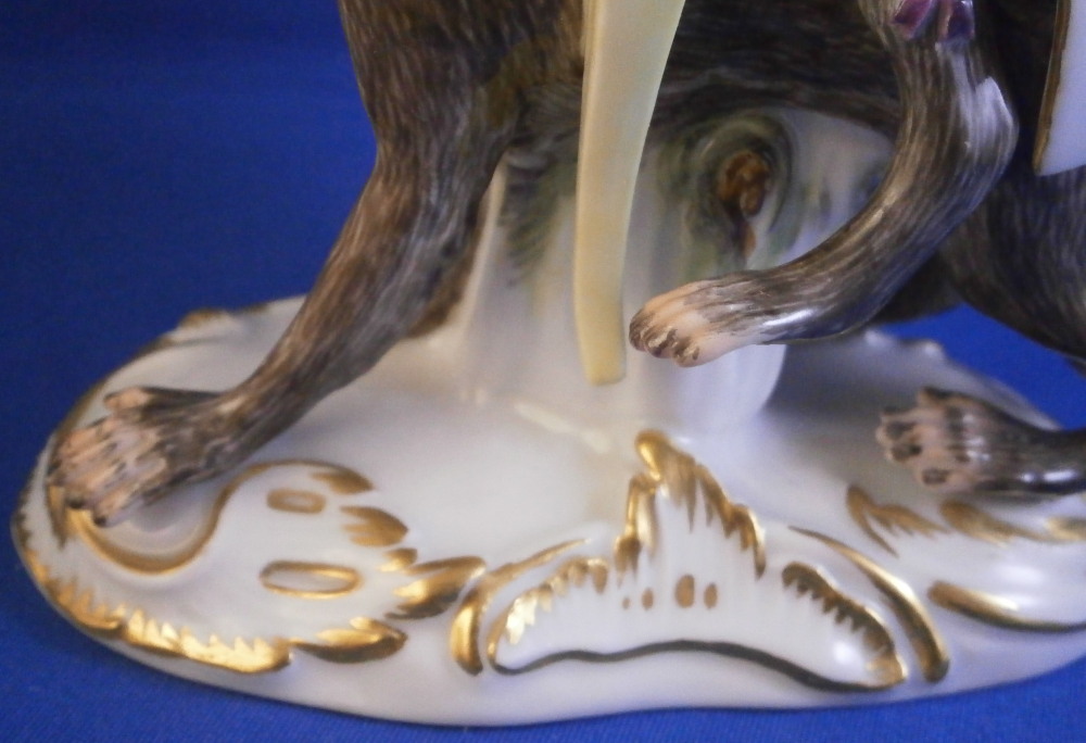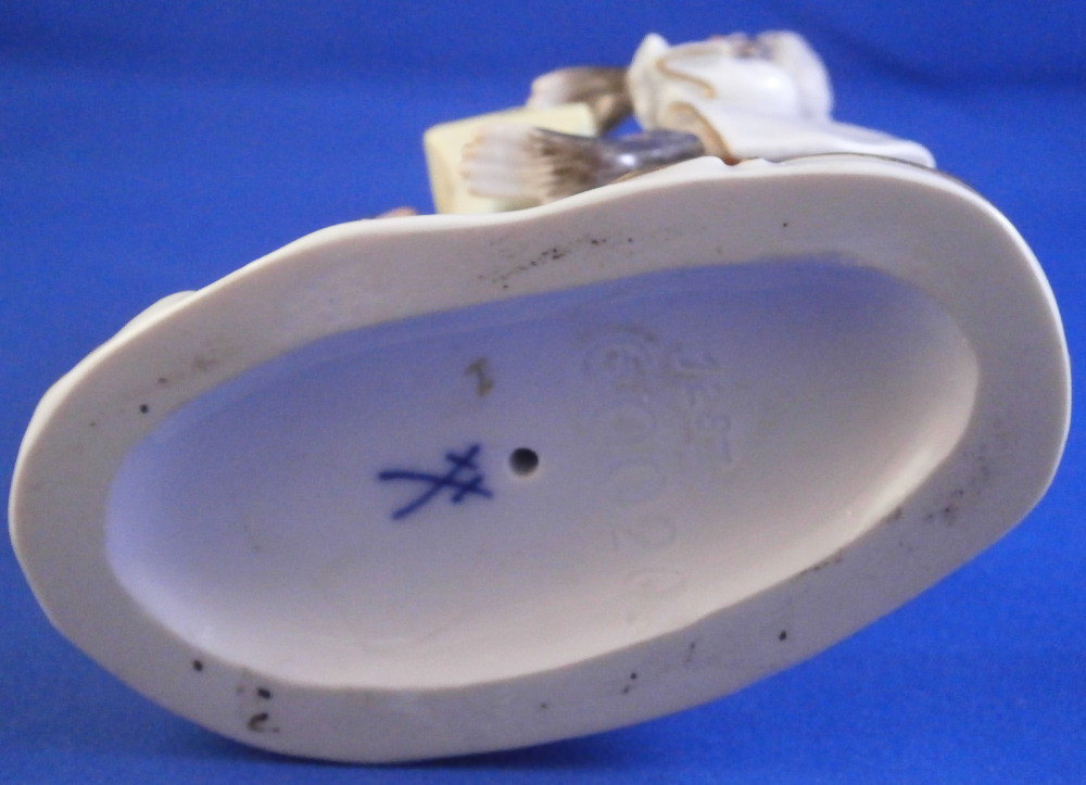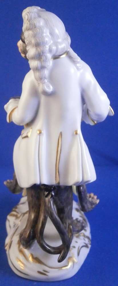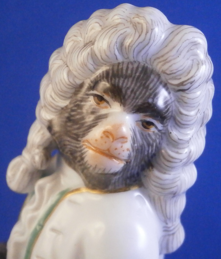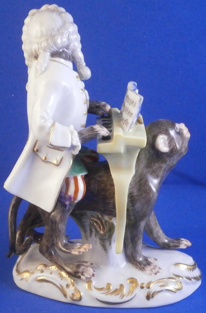 This is a fun figurine of a piano player from the monkey band series made by Meissen in the alter 20th century. A very well executed figurine of a popular topic. Very well modeled and hand painted perfectly. It is a really nice example and in perfect condition which is not all that common for this model! The one monkey is sitting on top of another monkey that is on all fours with the piano in the front. The piano player is wearing a wig and is nicely dressed while the other monkey just has fur painted on it. All on a nice base with some nice gold scrolls all around. It's a great looking figure and one of the main ones from this series. Quite hard to find! The figurine is just over 5 inches tall, 2.125 inches wide and 3.75 inches long. This piece is marked underneath with the under glaze blue crossed swords mark as well as the unsual impressed numbers and a painter's mark as shown. These figures from this band are so much fun to look at and the monkey band players are some of the most collected figures in porcelain even today. Please email me for more information or other pictures.