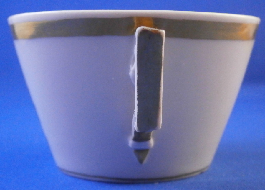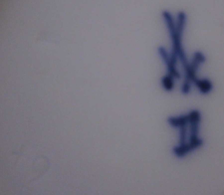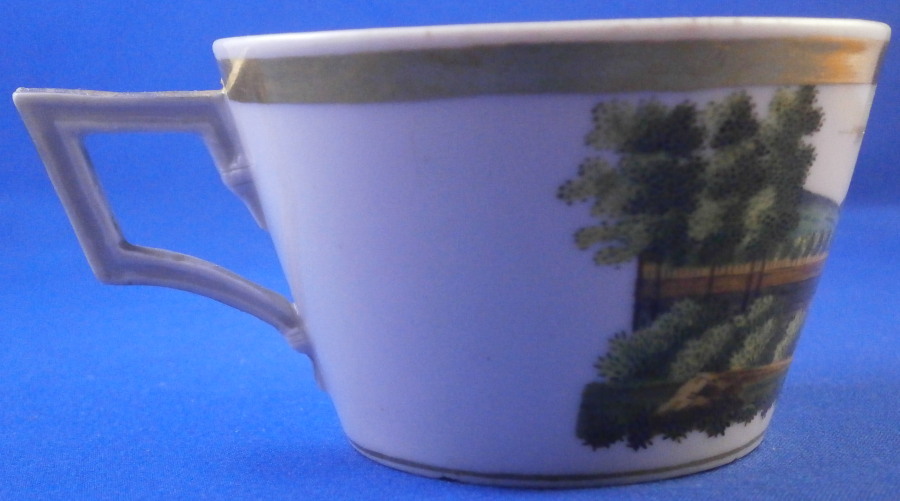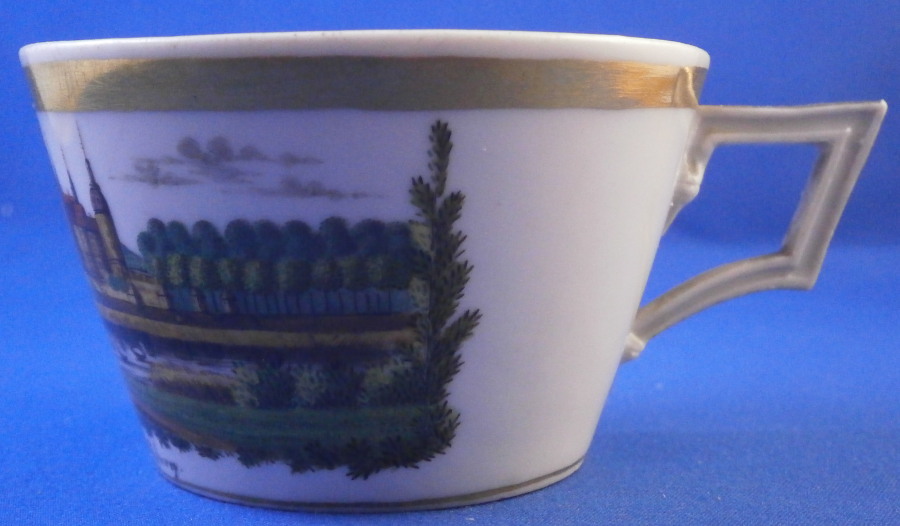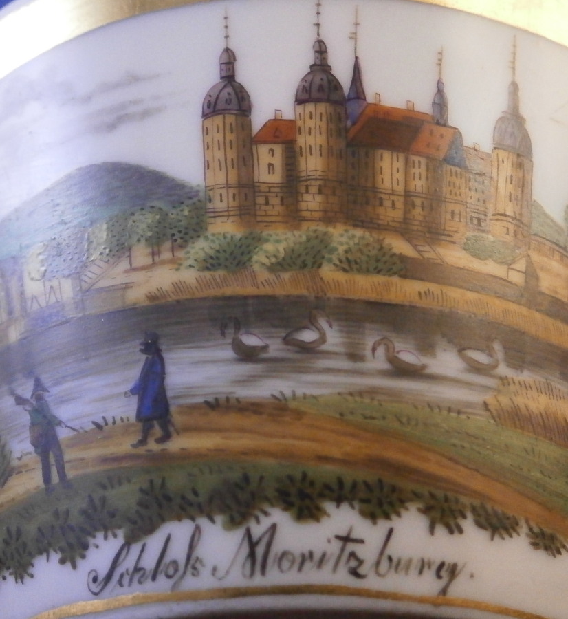 This is a cup made by Meissen in in the early 19th century. This Roman numeral II mark was a way to identify different types of porcelain pastes and was used from the later 18th century all teh way until 1815. The cup is hand painted with a really nice scene depicting the castle Moritzburg which is in the municipality of Moritzburg in the district of Meissen in Saxony, Germany, between Meissen and Dresden . So a fitting scene for a Meissen cup! The scene includes the caslte as well as water in front with some swans on it, two people and lots of greenery. It's nicely done with the rest of the cup having some simple gold trim and a typically shaped handle for this time period. The piece is in great condition with a very minor touch of wear to the gilding, a few minor firing flaws and a small chip to the foot that does not take away from the piece! The cup is 1.875 inches tall and has a diameter of 3.25 inches and is marked underneath with the under glaze blue crossed swords, the Roman numeral II as well as the usual impressed numbers. Please email me for more information or other pictures.
