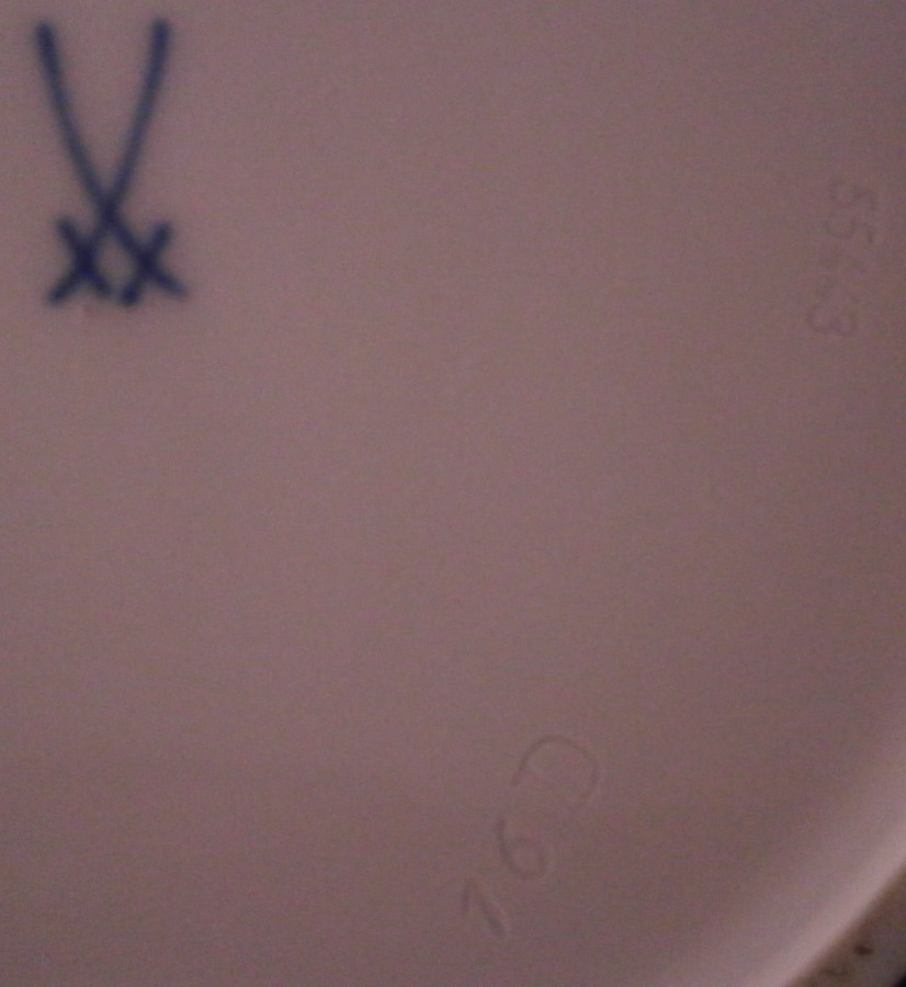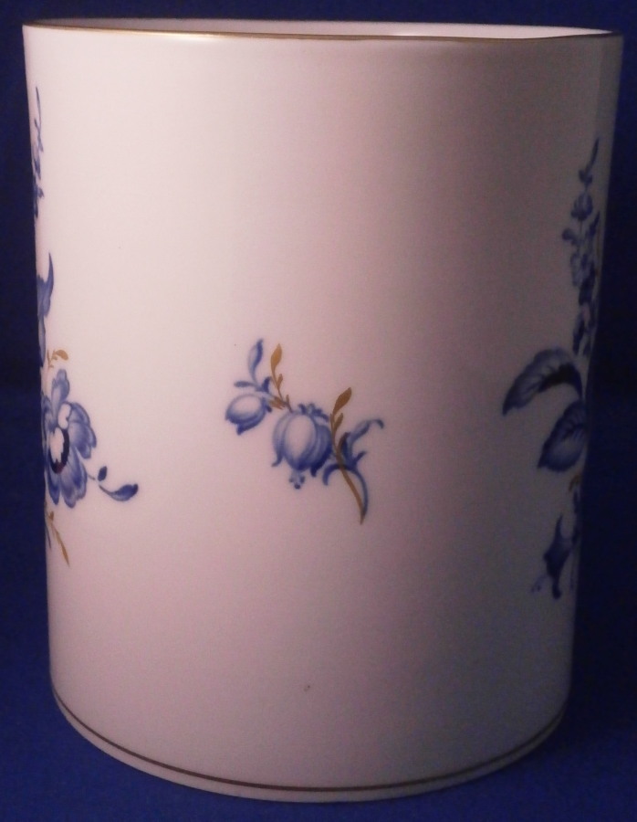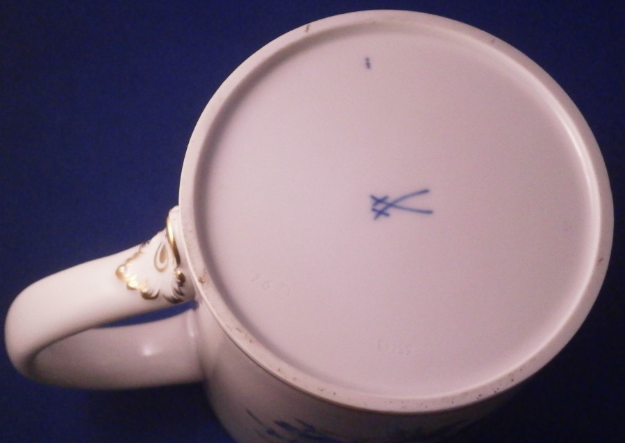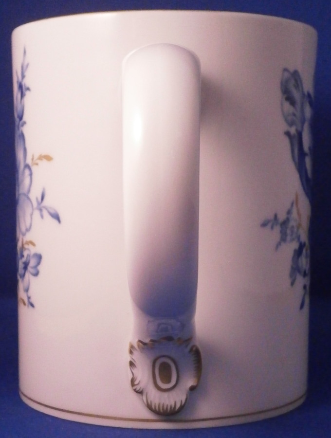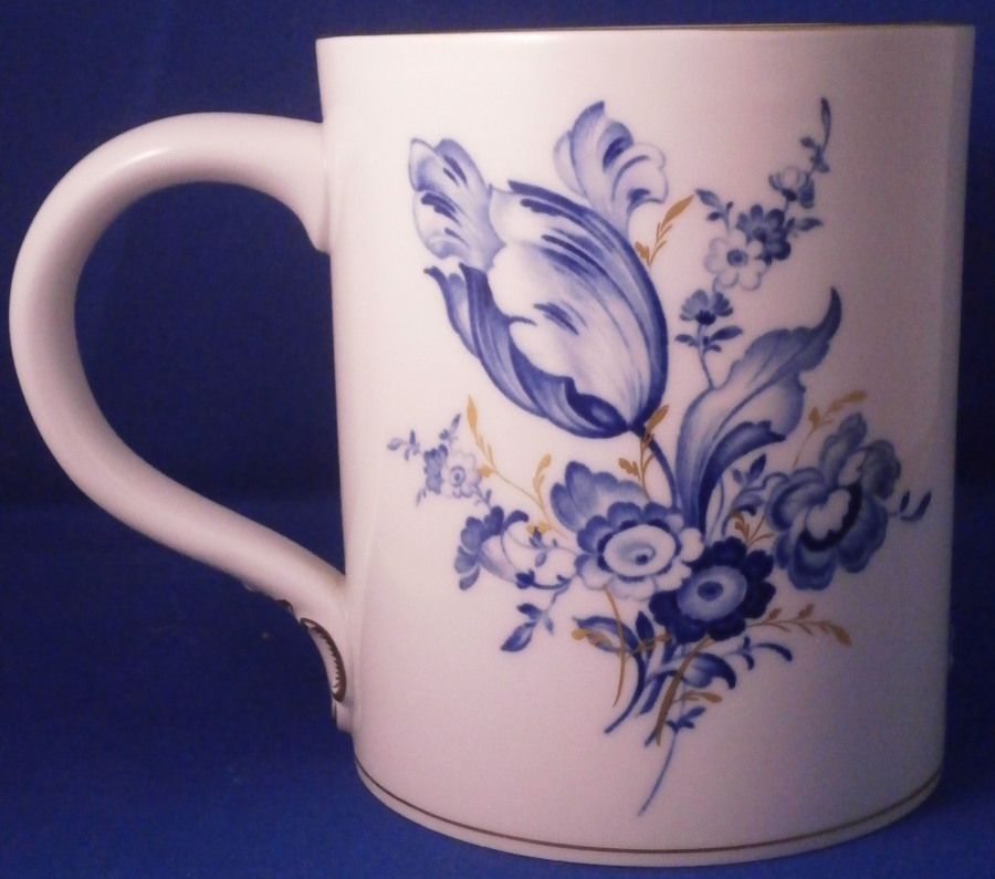 This is a great mug made by Meissen in the later 20th century. Not a size you see often by them at all and perfect for my morning coffee or water during the day. A bit bigger than a normal mug which I really like. I have another one that I use all the time. The cup is decorated with a nice floral arrangement on both sides with some gold highlights, a smaller flower to the front and a nice simple handle with a gold design to the bottom terminal. Gold trim to the top edge. These types of mugs are almost impossible to find - I am always looking for them for myself. The piece is 4.75 inches tall and 4 inches in diameter with the handle sticking out about 2 inches from that. It is marked underneath with the crossed swords in under glaze blue as well as a blue line along the edge and the usual impressed numbers. The blue line along the edge has two cuts across it to denote it being a second choice piece - not sure why - nothing obvious to me. The mug is in perfect condition. Please email me for more information or other pictures.
