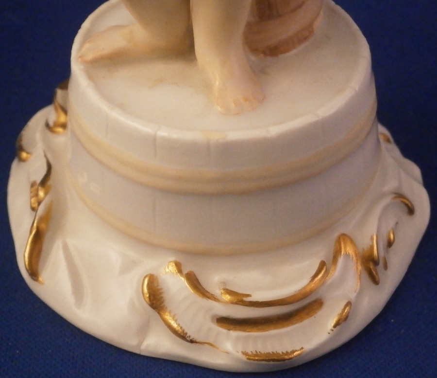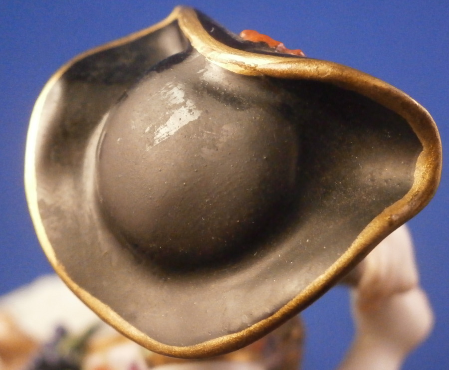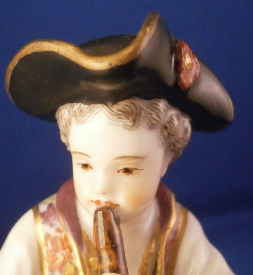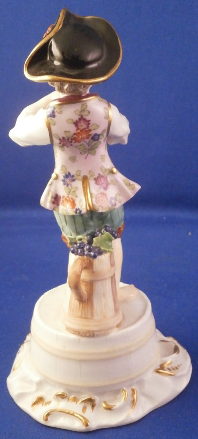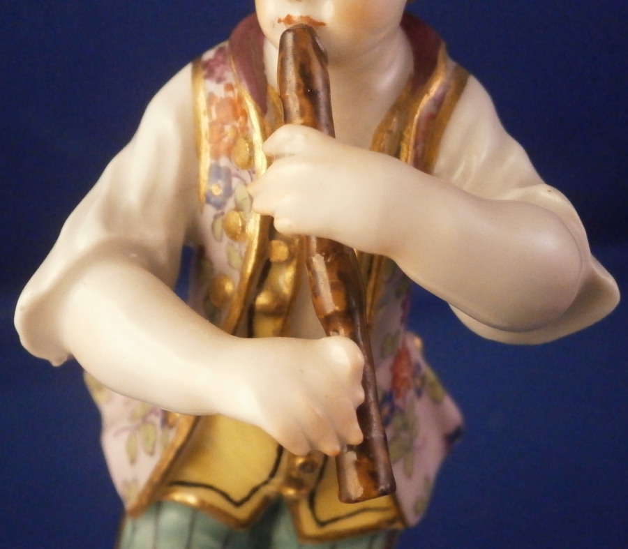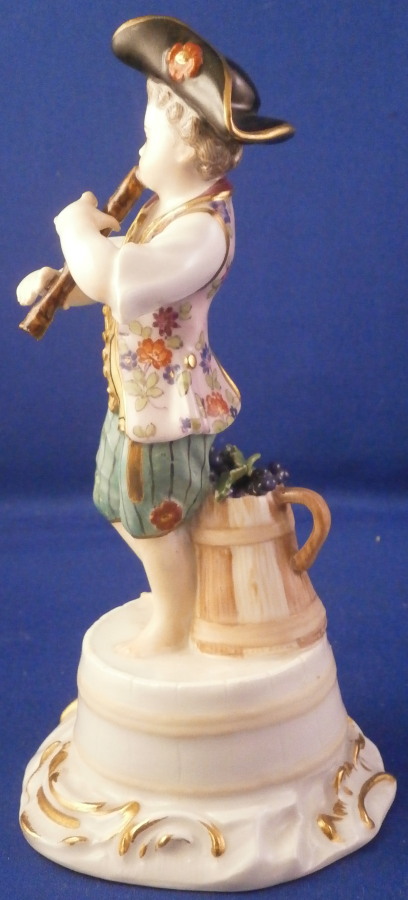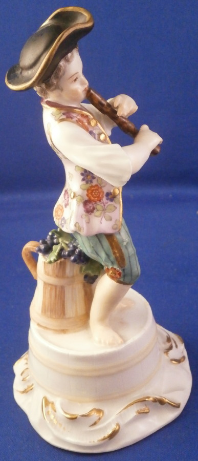 This is a figurine made by Meissen in the late 19th or early 20th century. It is of a musician playing a flute while standing on an upside down hald barrel with a base under it with gold scrolls all around. A wooden pitcher filled with grapes and leaves is behind him. The young gentleman is dressed in fancy clothes and wearing a hat. Nice subject with nice modeling and hand painted superbly. The figure displays very well but has been restored on his hat, through his legs and butt with some flaking to the color on his pants. It's not obvious since the hands and flute are fine which is a bit surprising really. The pants could be improved upon by a good restorer! The figurine is marked underneath with the crossed swords in under glaze blue as well as the usual incised and impressed numbers and a red painter's number 69. as shown. The figure is 5.75 inches tall and the base is about 3 inches in diameter. Please email me for more information or photos.