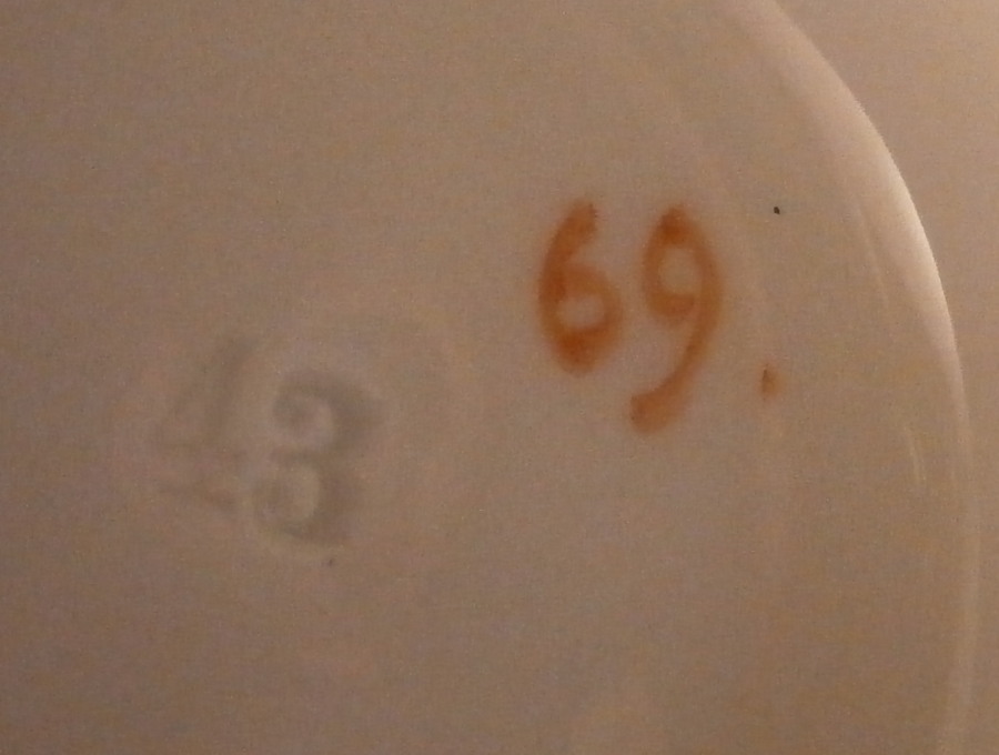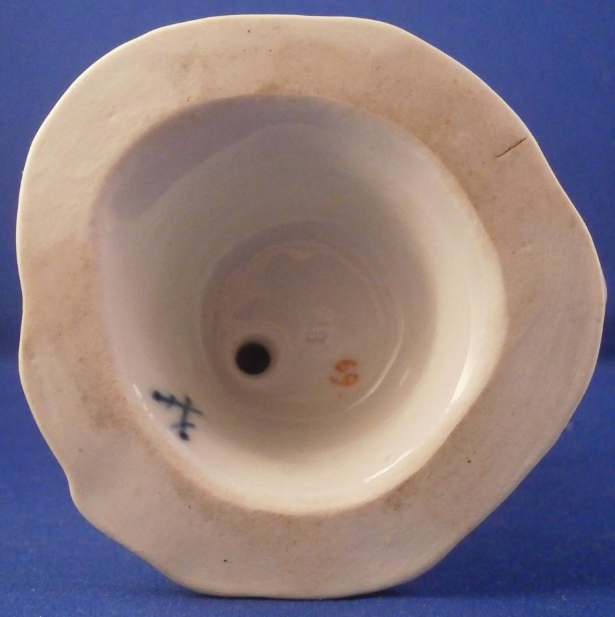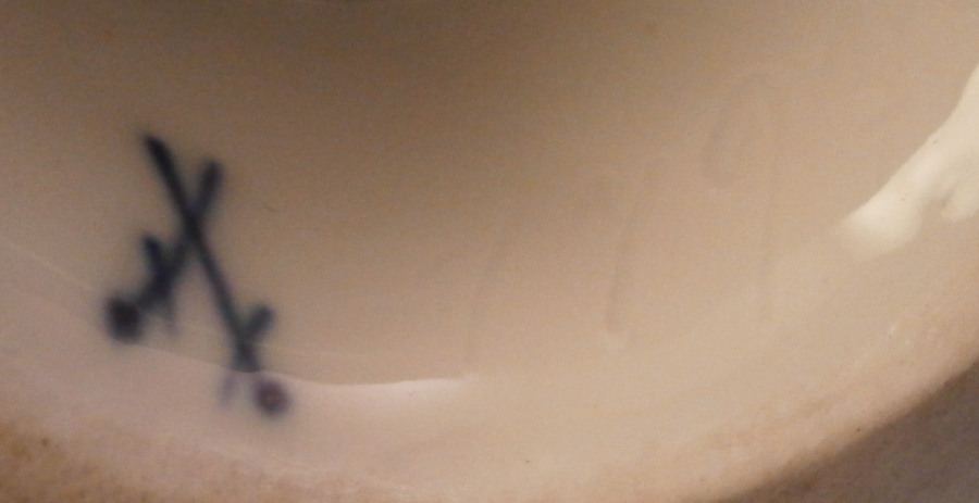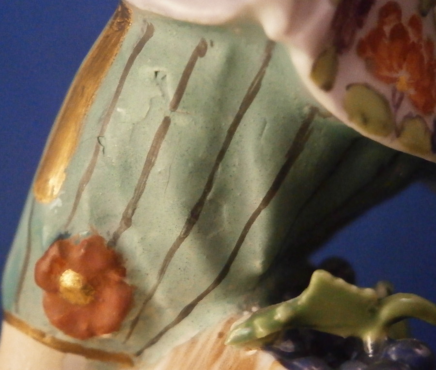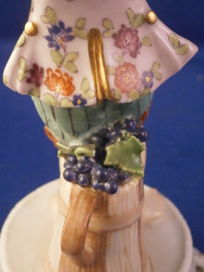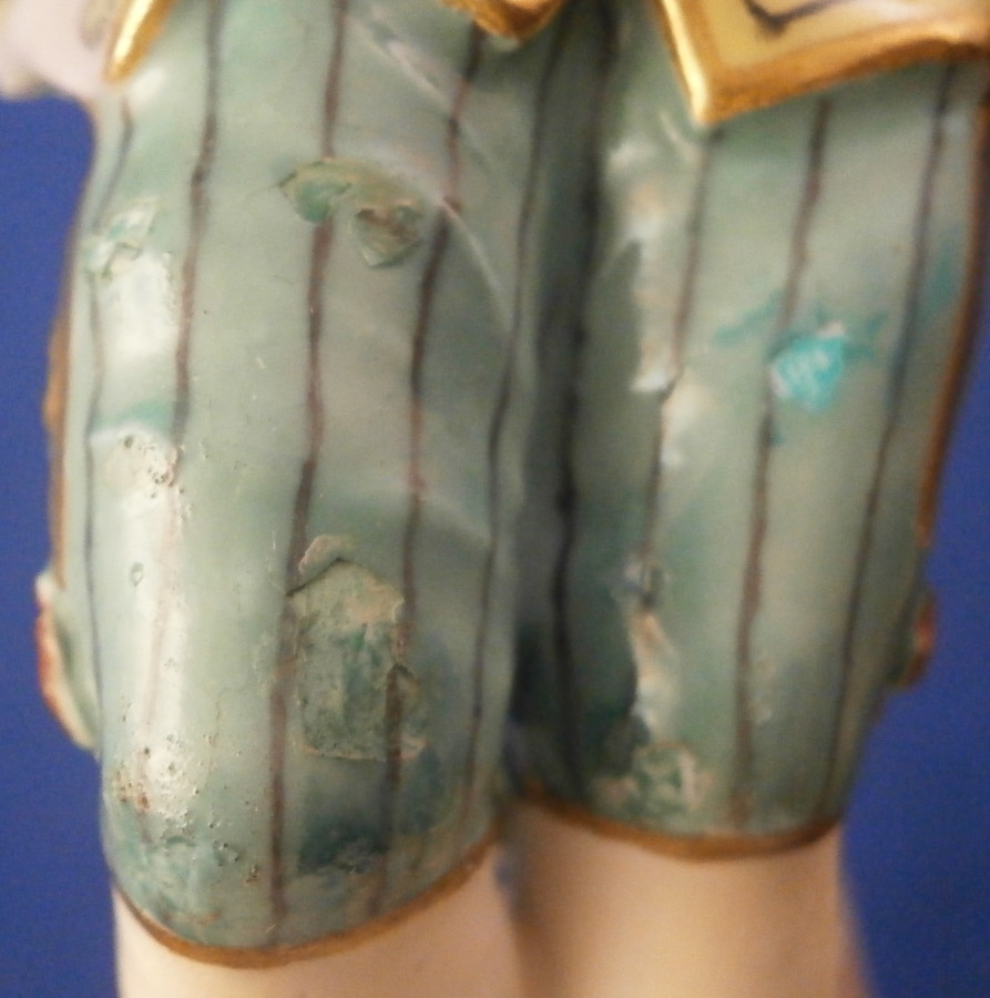 This is a figurine made by Meissen in the late 19th or early 20th century. It is of a musician playing a flute while standing on an upside down hald barrel with a base under it with gold scrolls all around. A wooden pitcher filled with grapes and leaves is behind him. The young gentleman is dressed in fancy clothes and wearing a hat. Nice subject with nice modeling and hand painted superbly. The figure displays very well but has been restored on his hat, through his legs and butt with some flaking to the color on his pants. It's not obvious since the hands and flute are fine which is a bit surprising really. The pants could be improved upon by a good restorer! The figurine is marked underneath with the crossed swords in under glaze blue as well as the usual incised and impressed numbers and a red painter's number 69. as shown. The figure is 5.75 inches tall and the base is about 3 inches in diameter. Please email me for more information or photos.