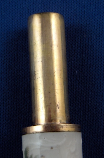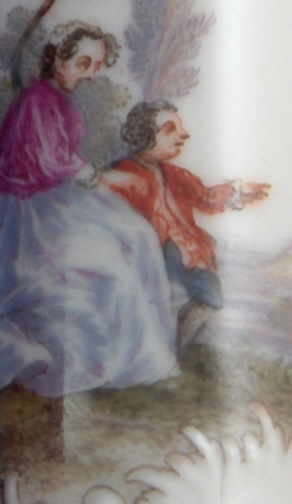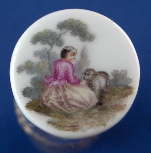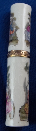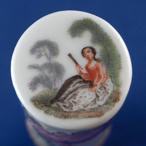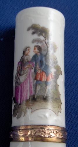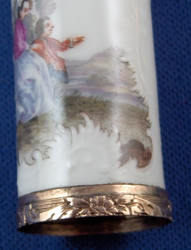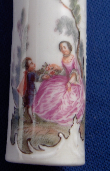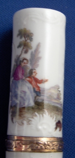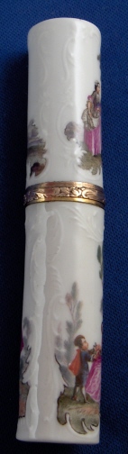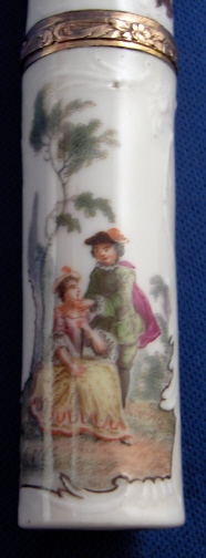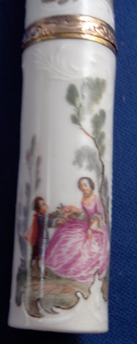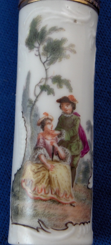 This is a rare treat - a needle case or etui made by Meissen around 1750. A much nicer version than most one sees even from Meissen! It has six handpainted top notch Watteau style scenes on it as well as some relief design to the paste. Four scenes are on the sides of the peice and are larger - all include a couple in a landscape surrounding and the last two scenes are smaller - one at the top and one at the bottom. The top one is of a lady with a sheep and the bottom one of a lady with a fan (I think). The scenes are of superb quality! Nice raised deisgn to the paste around the scenes and nice metal mounts - not sure if they are silver that has tarnished a bit, a gold wash or a low grade gold. Not clue on that stuff but certainly not something cheap! The box is in amazing condition - no problems at all except for a few tiny firing specs from the making and normal on the early pieces. The etui is not marked which is the norm! It is about 4 inches tall and 0.75 inches in diameter. Please email me for more information or other pictures.