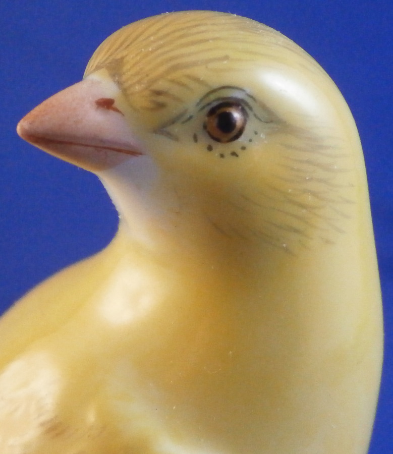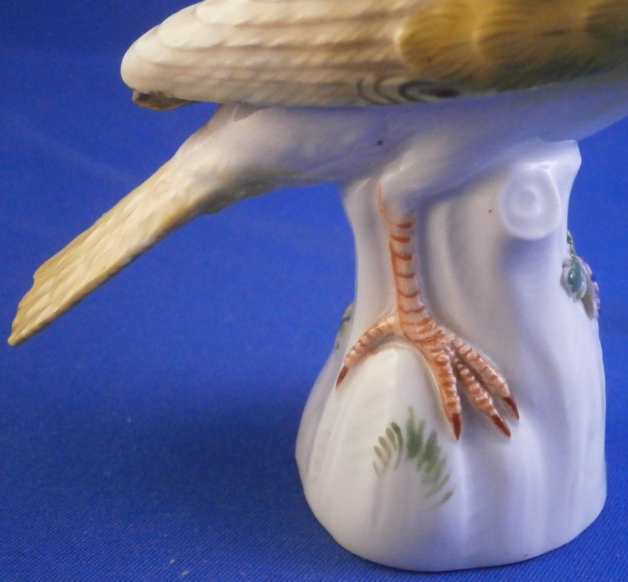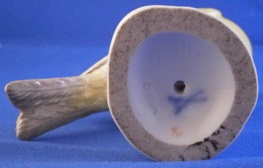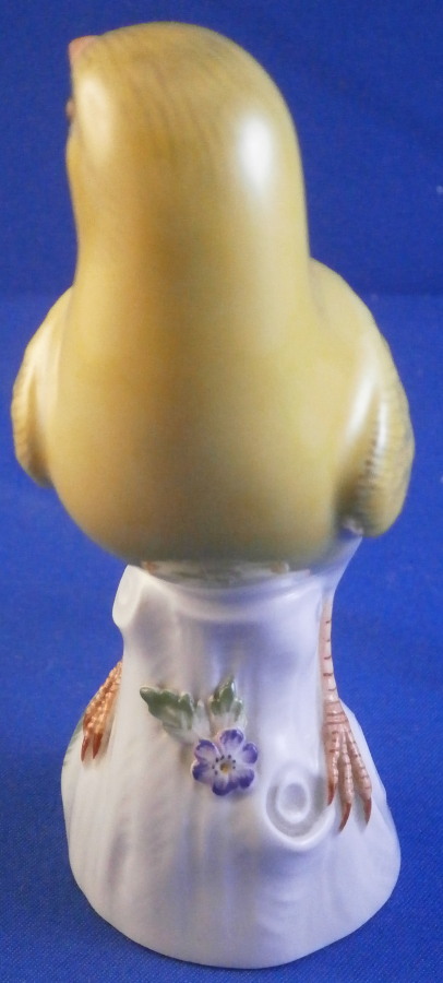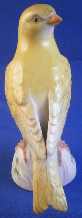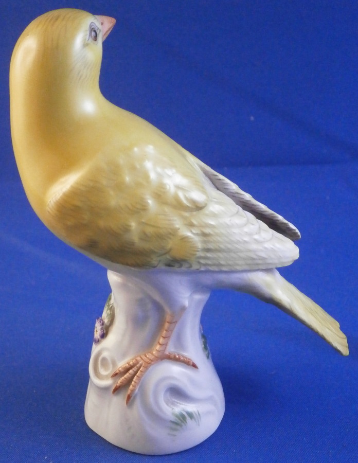 This is a figurine of a yellow canary bird made by Meissen in the 20th century. It is nicely modeled and hand painted and a little more colorful and detailed than some of the others they made. This bird here looks backwards unlike many versions that look straight ahead. The bird is sitting on top of a tree stump that has a single elegant flower on the front and a leaf on the back as well as some grasses painted to the sides. The figure is in perfect condition! It is marked underneath with the under glazed blue crossed swords mark (1st choice) as well as the usual impressed numbers, etc. as well as a red 40 as the painter's mark as shown. The bird is 3.875 inches tall, 1.5 inches wide and 3 inches deep. Please email me for more information or other pictures.