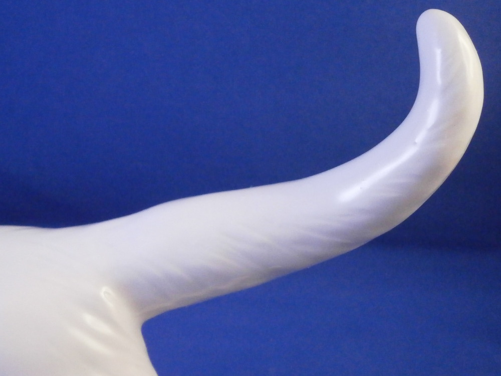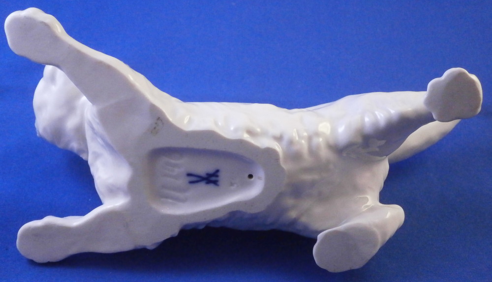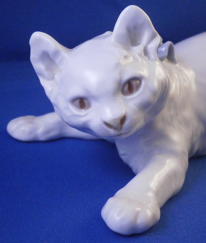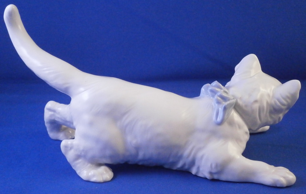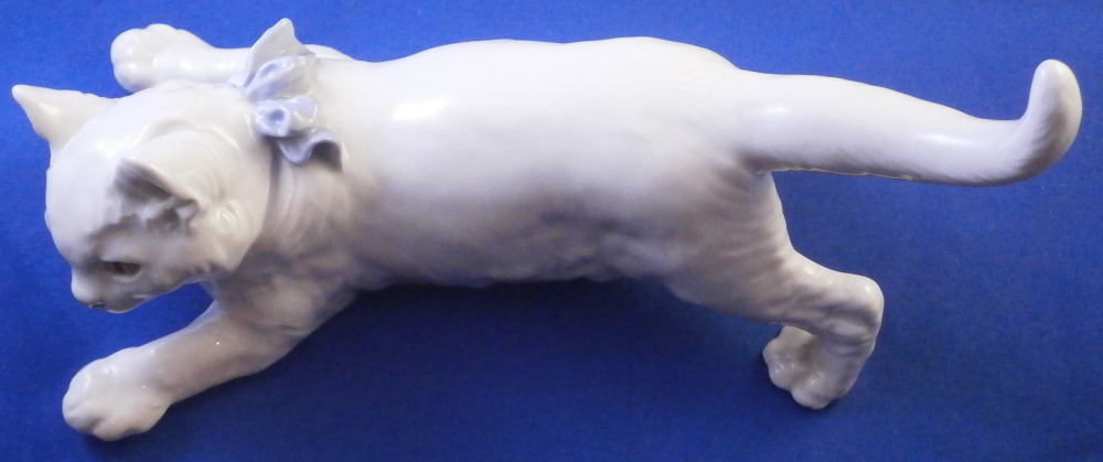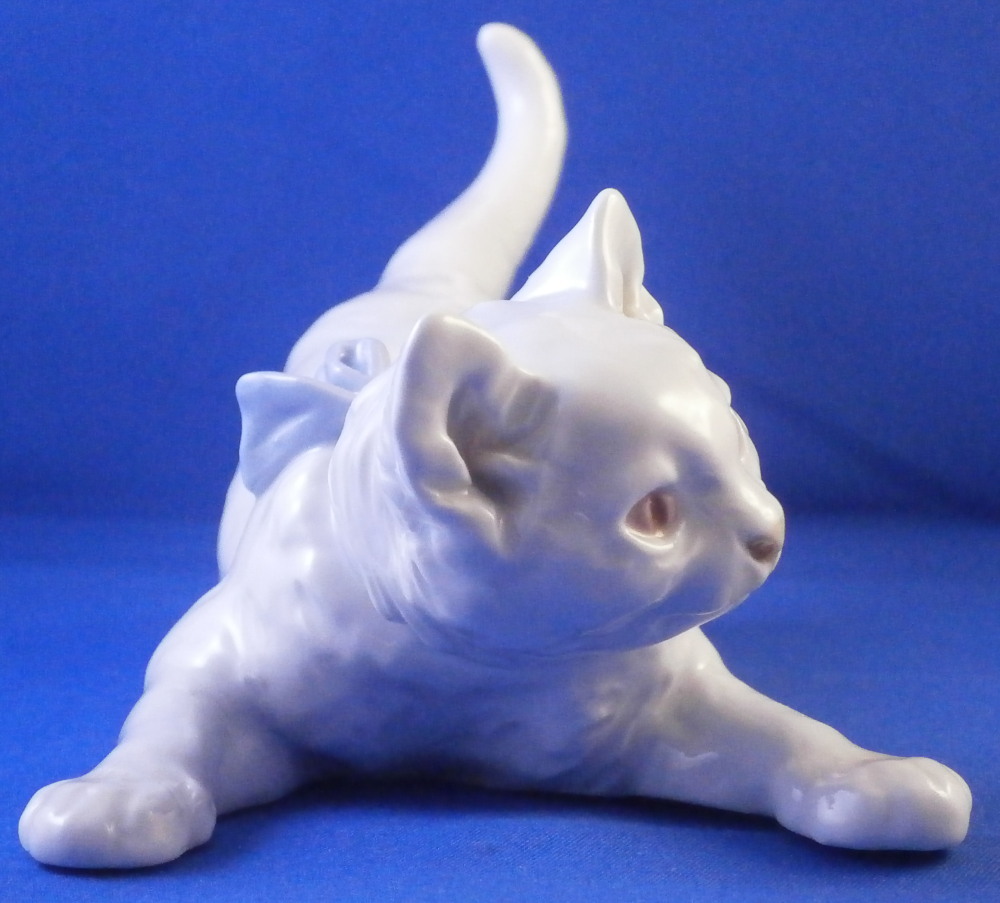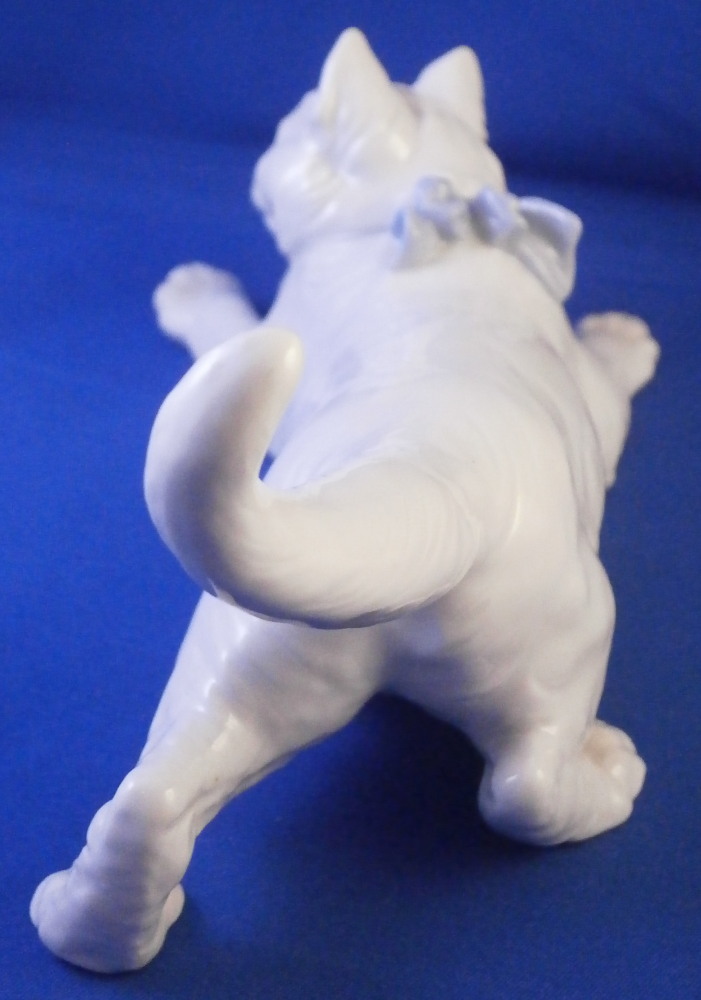 This is a great figurine of cat wearing a fun blue bow made by Meissen in the 20th century. A really nice figure especially if you are a cat lover. The cat is superbly modeled with lots of detail and left mostly in the white to show it all off. The bow is a nice blue color while the eyes, mouth and nose have a bit of red / pink color to them. Super cute! The figurine is in perfect condition. It is marked underneath with the under glaze blue crossed swords mark as well as the usual incised and impressed marks plus a painter's mark 11 as shown. The figurine is 3.5 inches tall, 6.375 inches long and 3.25 inches deep. Please email me for more information or other pictures.