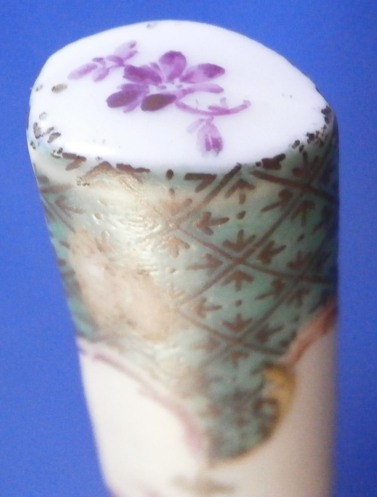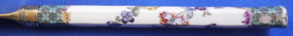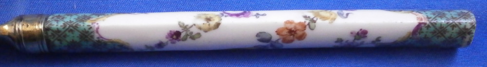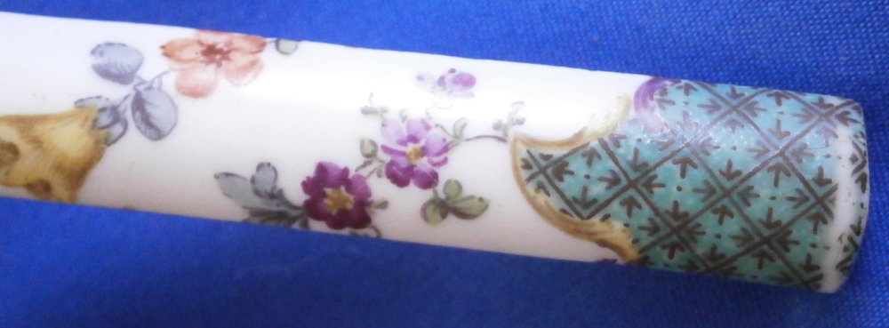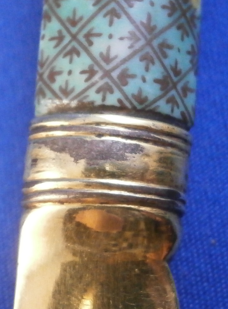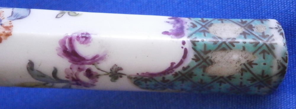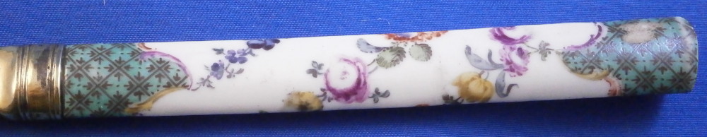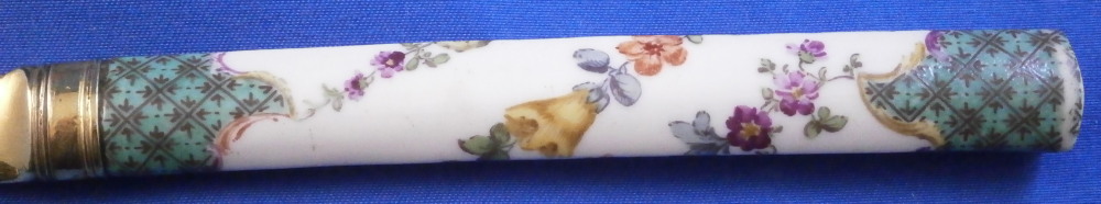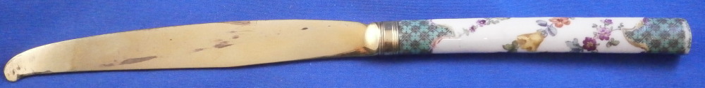 This is an interesting knife with the porcelain handle made by Meissen in the 18th century and the blade being entirely made of silver as is the ferrule part. Not sure of the purpose of this knife as the blade is not sharp at all and it being made of silver and being thin and long makes it pretty flexible. The tip is rounded so not a letter opener either I don't think. So a bit of a mystery! Either way is is a superb piece with the handle a nice shape. The top part is flat and the sides are rounded coming to a point on the underside. The back is flat. The handle is hand painted with a floral garland that goes all around three times with the top and bottom end having a nice green groundwith black designs to it and puce and yellow scrolls to the edges. A great looking piece. The silver has this golden tone to it since it has not been polished and it makes it look even more elegant! The knife is 9.25 inches long of which just under 4 inches is the visible porcelain handle and 5 inches the blade. The porcelain is not marked or shall we say visibly marked since it would be hidden by the ferrule which is normal but it is definitely made by Meissen during this period. The silver is not marked either. The piece is in great condition with a few scuff marks to the blade and the porcelain handle is worn in two spots as well as the edge of the bottom end as shown. Still looks great! Please email me for more information or other pictures.
