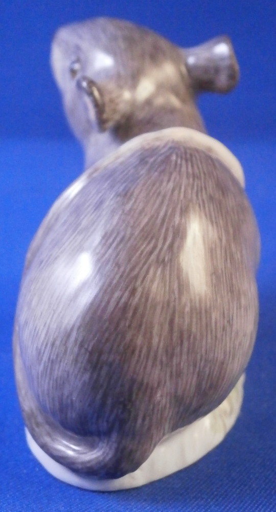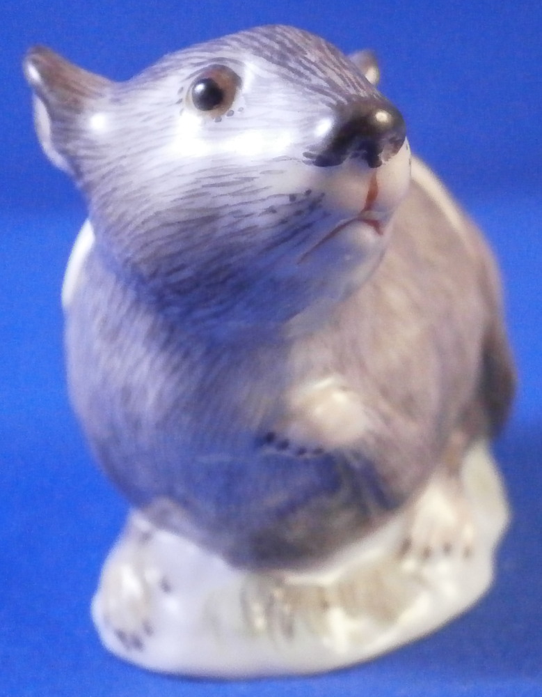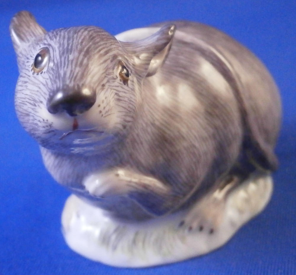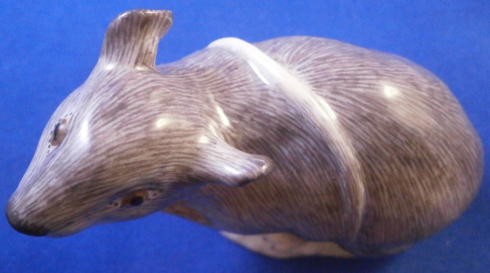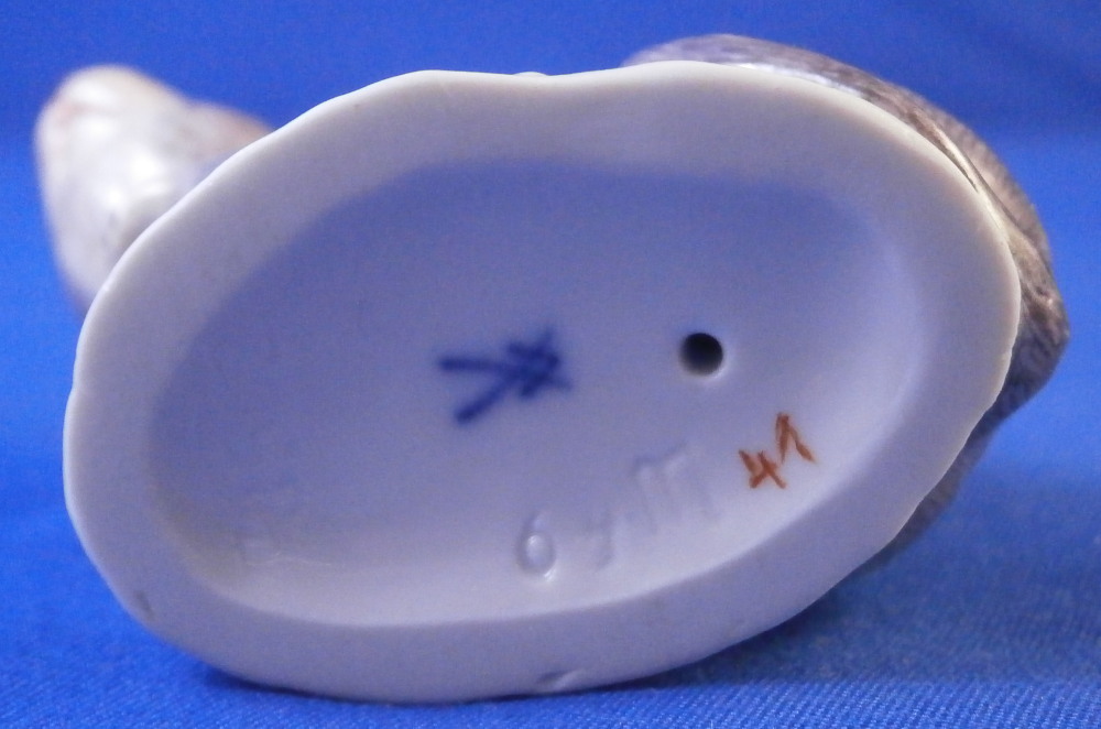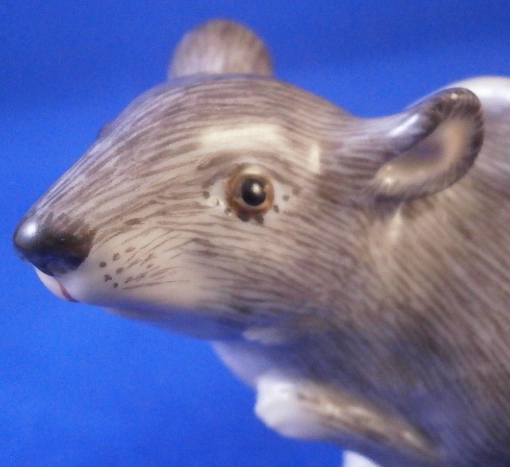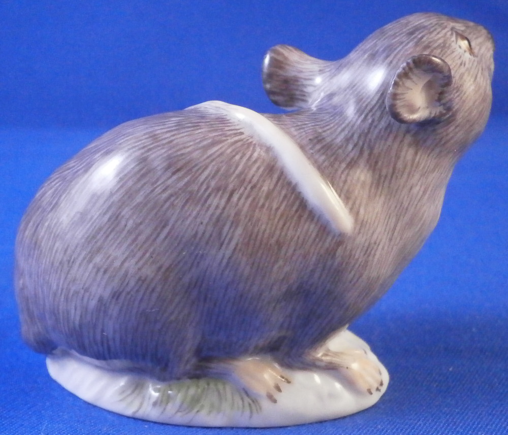 This is a really nice figurine of a mouse made by Meissen in the 20th century.It is really cute model! Based off course on an 18th century original which is often the case with this maker. The figure is nicely modeled and hand painted as one would expect from the top maker. Looking super cute with the head turned upward a bit, right front paw in the air and the tail draped over its back. The figurine is in perfect condition and is marked underneath with the under glaze blue crossed swords mark as well as the usual impressed numbers, etc.as well as a painter's mark as shown. The piece is 1.625 inches tall, 1.125 inches wide and 2.125 inches long. Please email me for more information or other pictures.