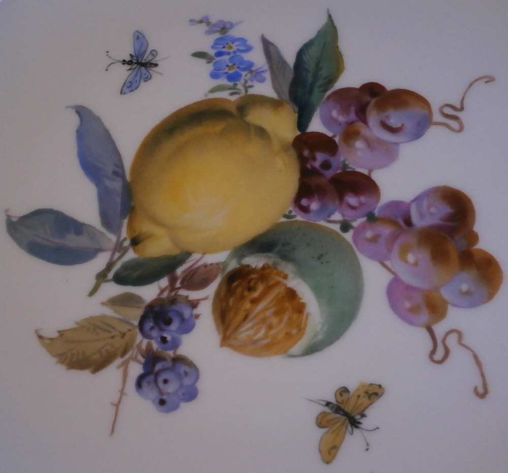 This is a great little plate made by Meissen in the late 19th century. Perfect for use as a dessert plate or display where it takes up less room than the larger pieces. It is hand painted with a nice fruit scene in the center including a leman, walnut, grapes and blackberries plus some greenery and two bugs / butterflies. A bit of a relief design to the nicely shaped rim with gilding to the edge. The plate is in superb condition with just a minor touch of wear to the gilding along the edge. It displays perfecly! The dish is marked with the under glaze blue crossed swords mark underneath as well as thhe usual impressed marks as shown. It is 0.75 inches tall and 7.5 inches in diameter. I ahve a few others on the site if anyone is interested in a pair or set. Please email me for more information or other pictures.