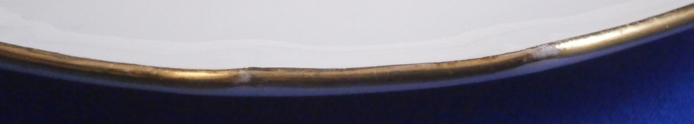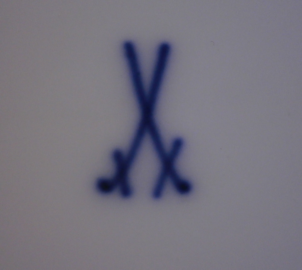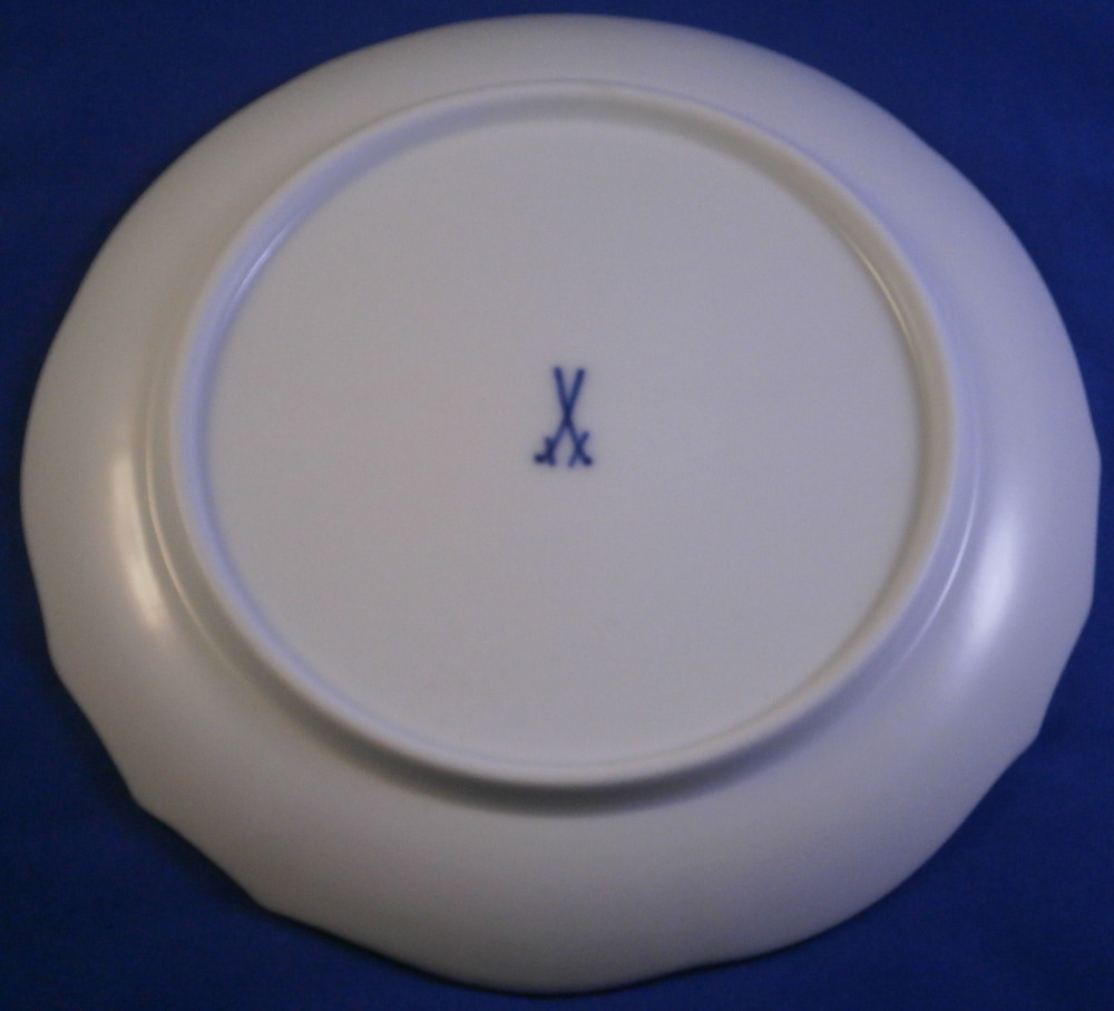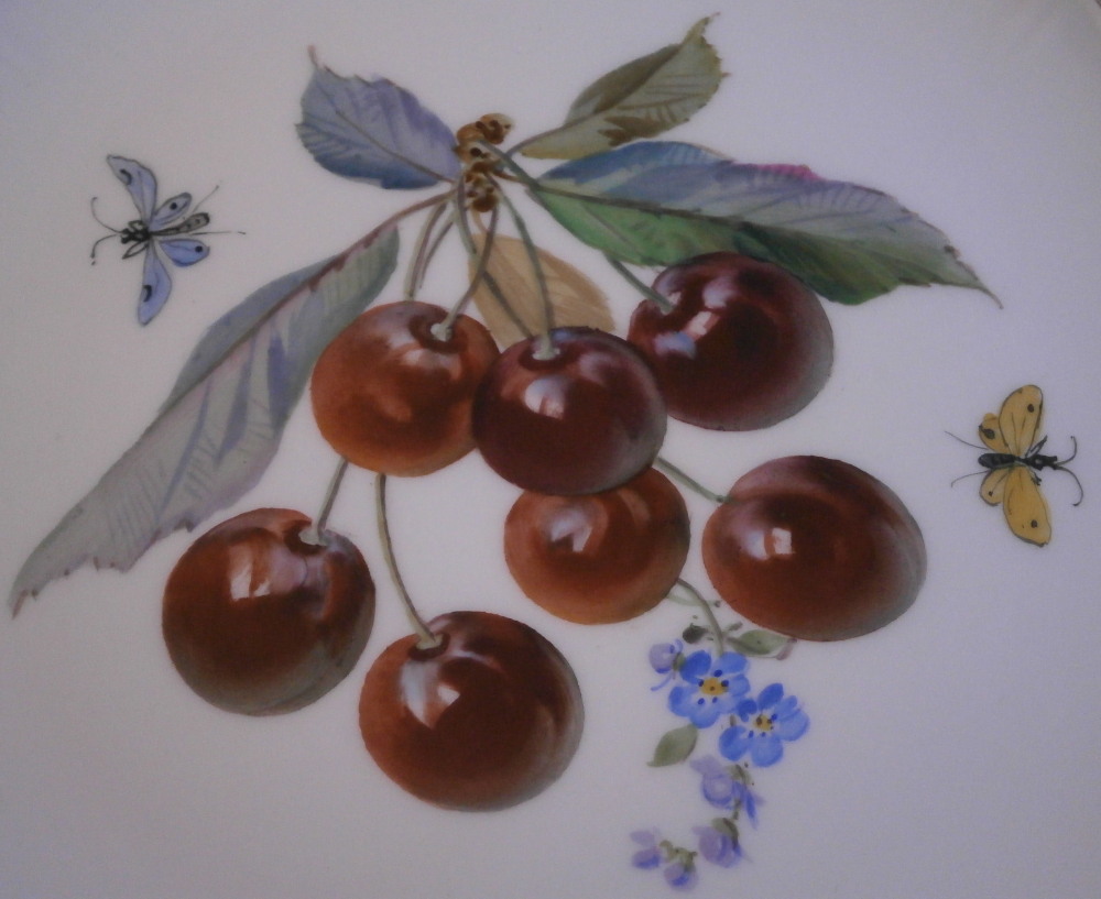 This is a great little plate made by Meissen in the late 19th century. Perfect for use as a dessert plate or display where it takes up less room than the larger pieces. It is hand painted with a nice fruit scene in the center including a bunch of cherries with a forgetmenot flower underneath plus some greenery and two bugs / butterflies. A bit of a relief design to the nicely shaped rim with gilding to the edge. The plate is in superb condition with just a minor touch of wear to the gilding along the edge. It displays perfecly! The dish is marked with the under glaze blue crossed swords mark underneath as well as thhe usual impressed marks as shown. It is 0.75 inches tall and 7.5 inches in diameter. I ahve a few others on the site if anyone is interested in a pair or set. Please email me for more information or other pictures.
