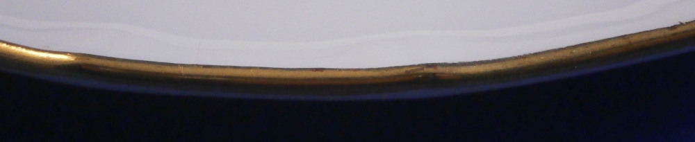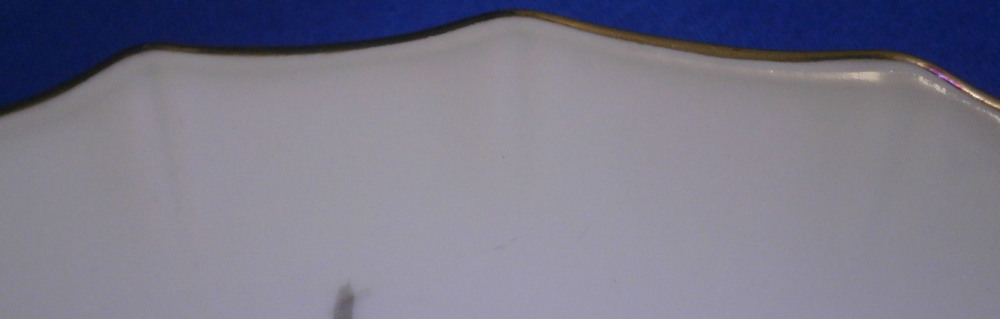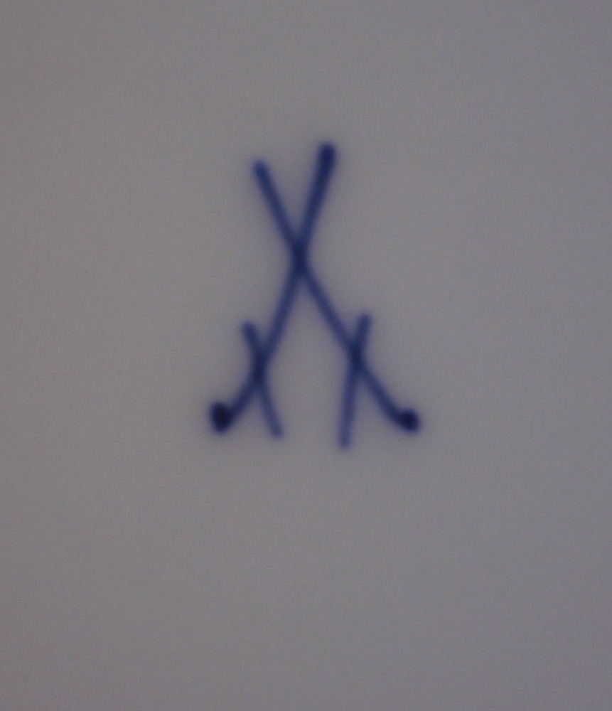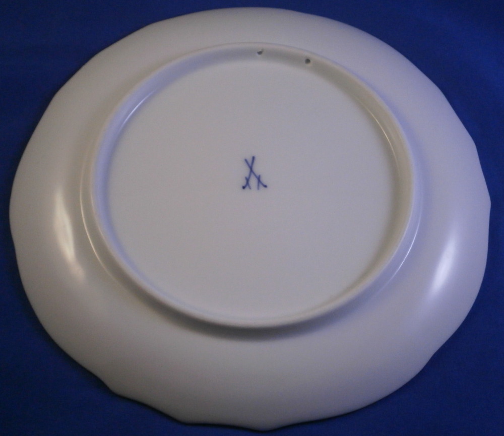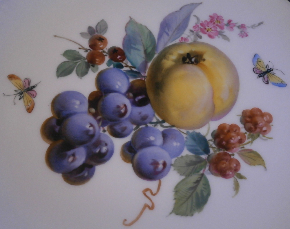 This is a great little plate made by Meissen in the late 19th century. Perfect for use as a dessert plate or display where it takes up less room than the larger pieces. It is hand painted with a nice fruit scene in the center including a peach, some purple grapes, raspberries, red currants, small pink flowers and some greenery plus two bugs / butterflies. A bit of a relief design to the nicely shaped rim with gilding to the edge. The plate is in superb condition with just a minor touch of wear to the gilding along the edge. It displays perfecly! The dish is marked with the under glaze blue crossed swords mark underneath as well as the usual impressed marks as shown. It is 0.75 inches tall and 7.625 inches in diameter. I have a few others on the site if anyone is interested in a pair or set. Please email me for more information or other pictures.