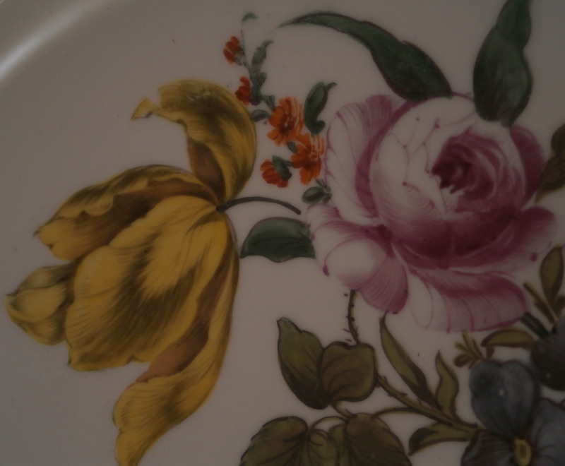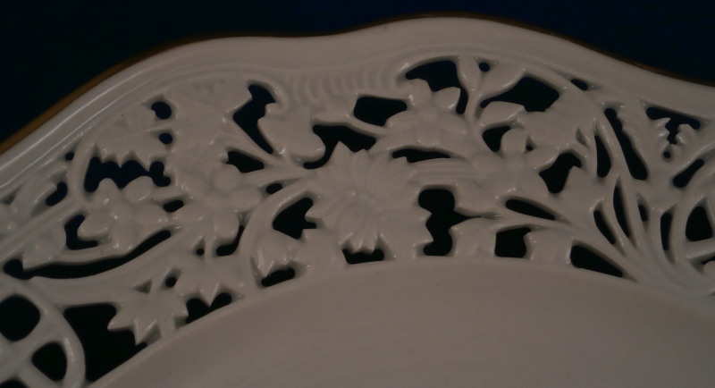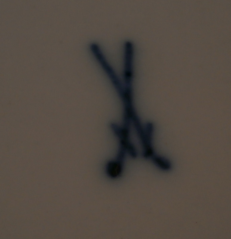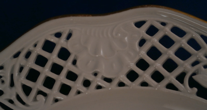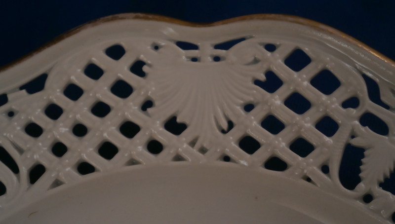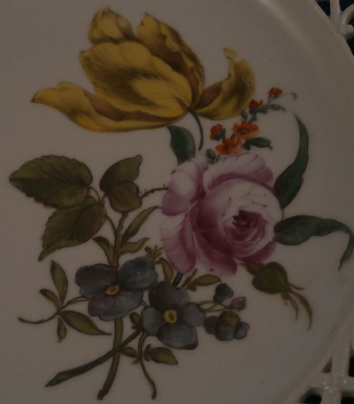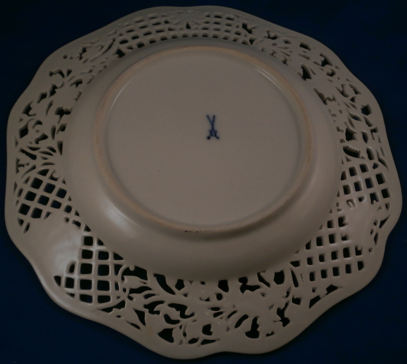 This is a superb plate made by Meissen in the 19th century - I think. The blank does not have an impressed number which means it would date to pre 1740 but the plate does not strike me as being that old. The flowers are an odd style of half wood cut influenced and half not so well painted Deutsche Blumen so that is also a bit strange. I would say it is 19th century but ...The piece is hand painted with a nice floral arrangement in the center as well as two smaller flowers. The rim has a superb reticulated design to it which is called Bruehlsches Allerlei as it was originally made for Count von Bruehl. The rim is left in the white to show off all that superb detail of the porcelain itself. Gold ring around the edge. The plate is in great condition with some minimal wear mainly to the orange flower as shown and wear to the gilding around the edge. It is marked with the under glaze blue crossed swords mark underneath as shown. The plate is 1.25 inches tall and 8.5 inches in diameter. Please email me for more information or other pictures.