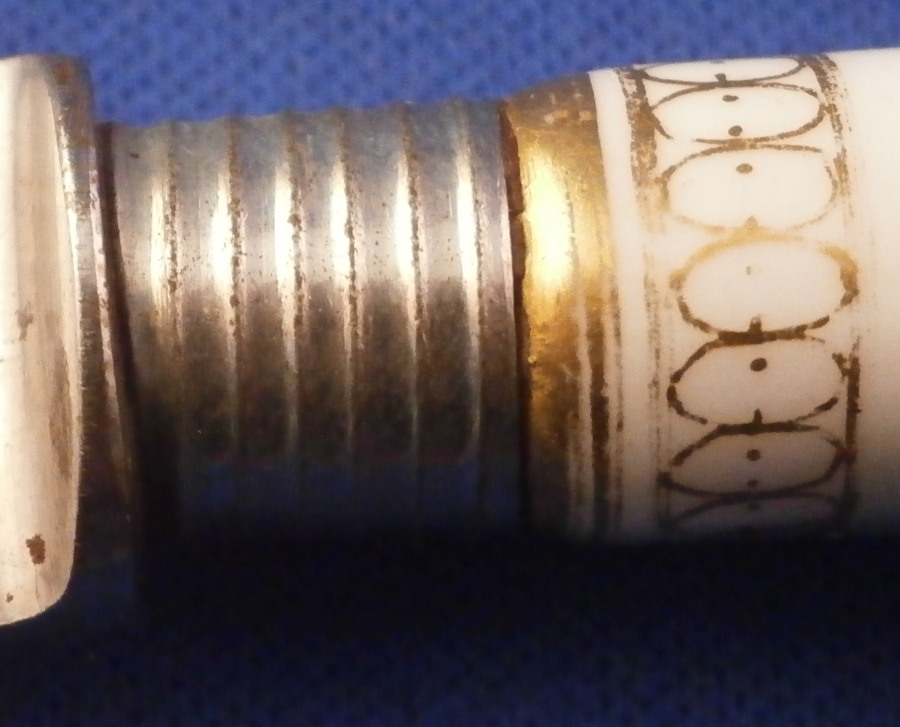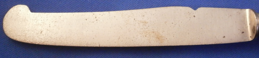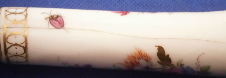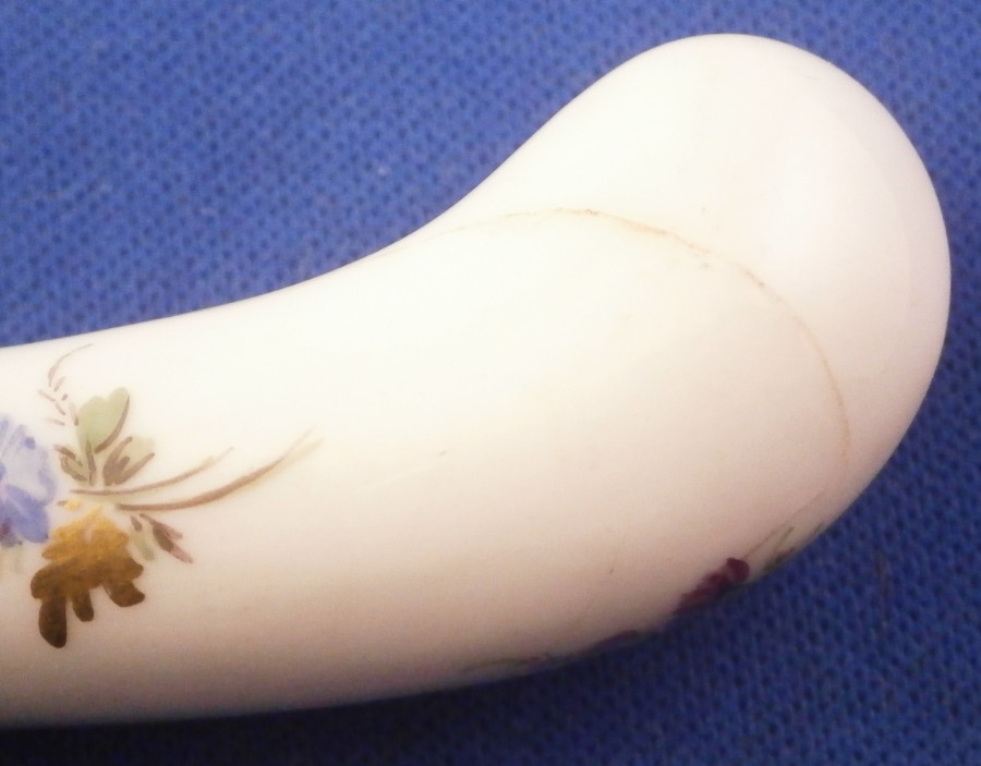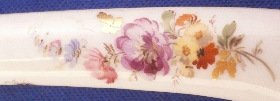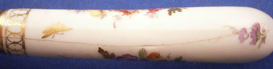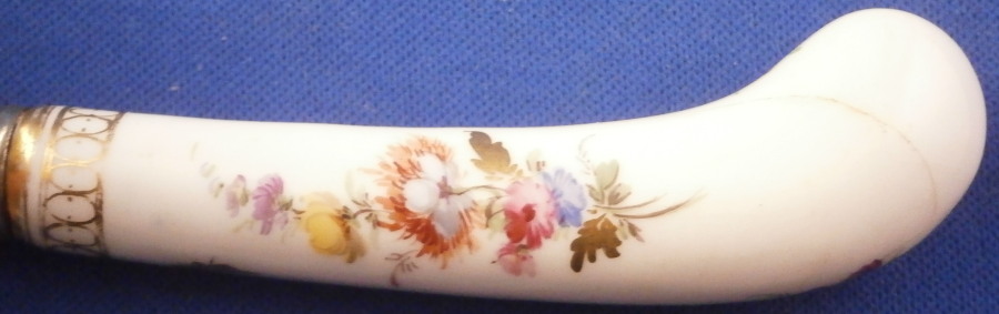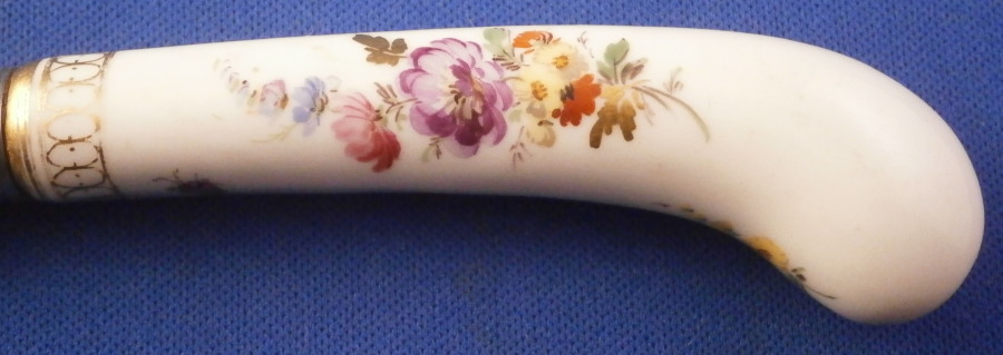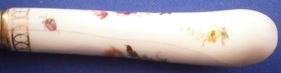 This is a nice porcelain handled knife made by Meissen in the late 19th century. The porcelain handle is hand painted with two very nice floral arrangements as well as a few single flowers and the gold trim that uses ovals which gives this design the name O-Kante (O-trim). The piece is not marked but that is normal as the mark would be where the ferrule is placed. The knife displays nicely but there is some wear to the gold trim, oxidation to the metal parts and the porcelain handle has long crack going down from the ferrule end and then curving back up again as shown. It still is pretty solid and a nice and rare example of this design to find on a knife! The piece is about 8 inches long with the visible porcelain being about 3.125 inches long. Please email me for more information or other pictures.