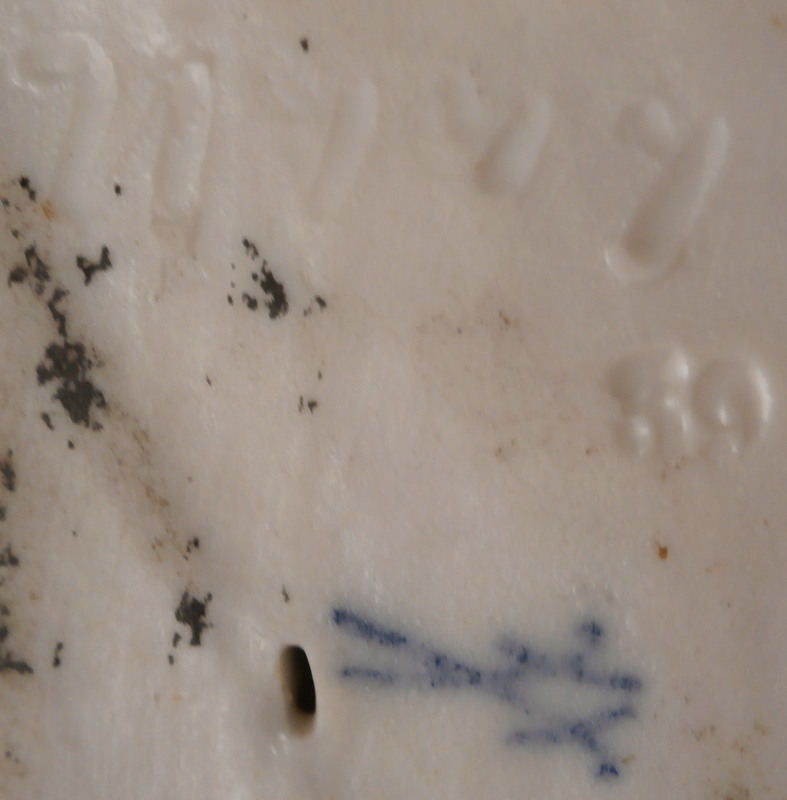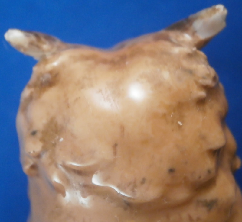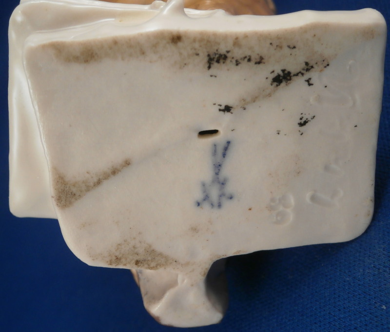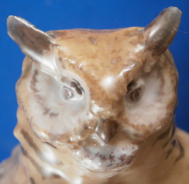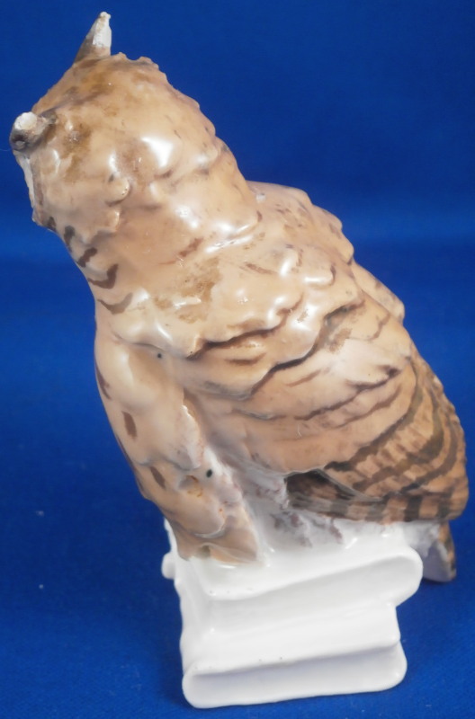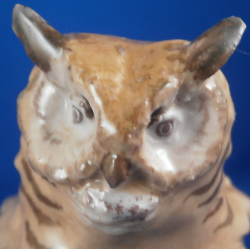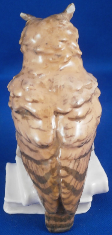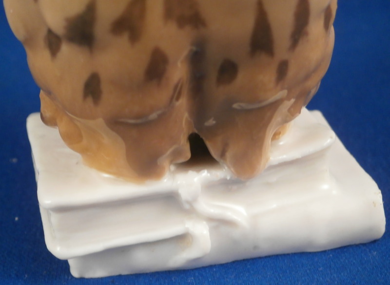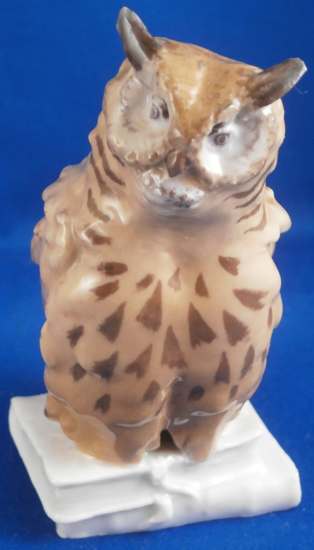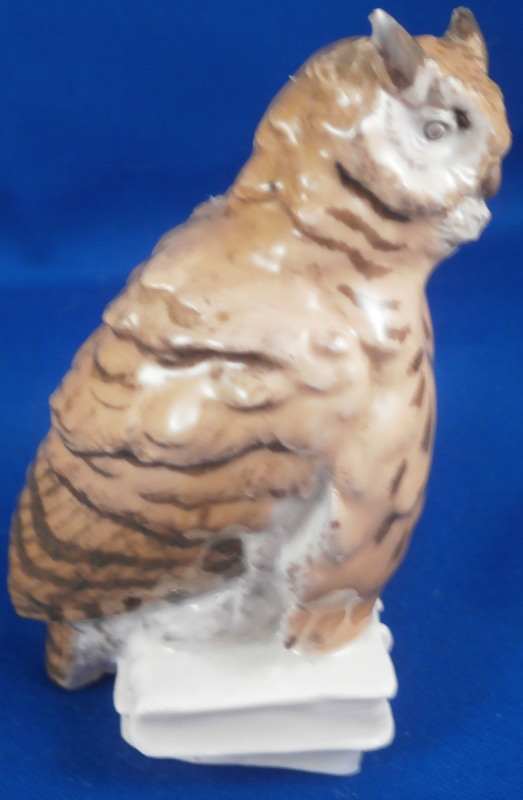 This is a hard to find owl figurine made by Meissen right around 1900. Superbly modeled and hand painted with the rare under glaze colors this is one spectacular piece. I think it is meant to be a great horned owl but I am definitely not an expert in owls. He is sitting on a pair of books that are left white and give the figure a nice contrast. Lots of details on this bird epsecially for the size. The figurine displays perfectly but each ear has a chip to the top part as shown mostly visible from the back and doesn't take away from the piece when on display. The underside is marked with the blue crossed swords mark as well as the usual impressed / incised marks as shown. First choice! The figurine is 3.625 inches tall, 2 inches wide and 21.5 inches deep. Please email me for more information or other pictures.
