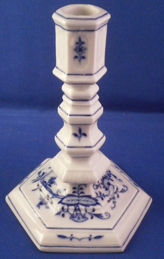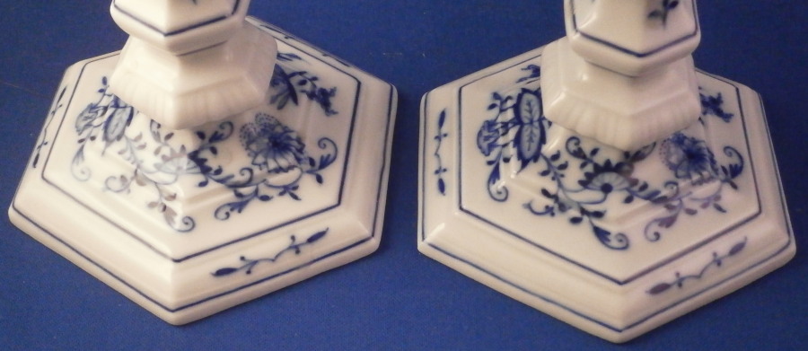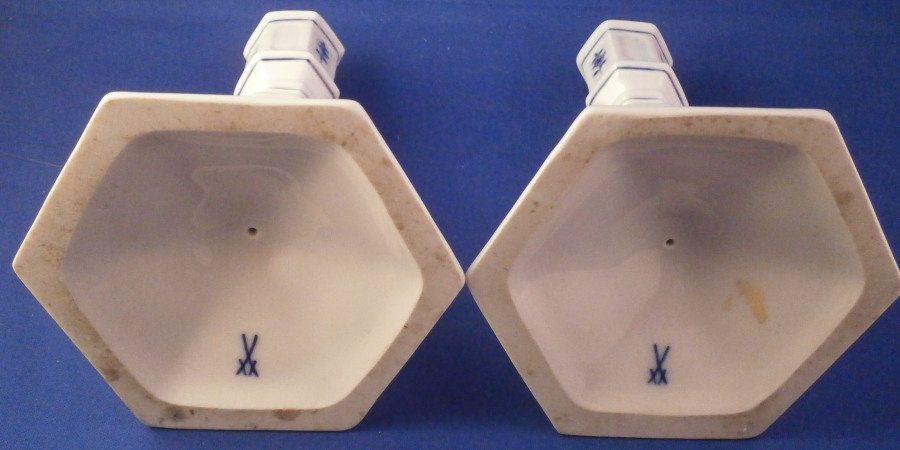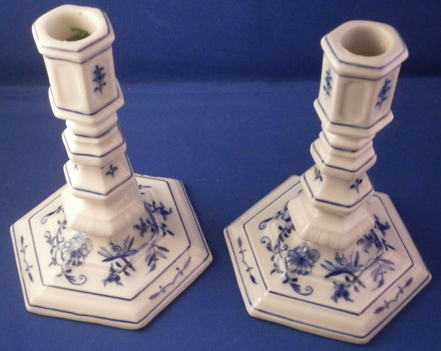 This is a nice pair of candlesticks made by Meissen in the 20th century. It is always nice to have a pair and these have a really nice shape to them and are both decorated in their famous blue onion design. Nice hexagonal base with the central column made up of different elemnts to give it a nice look. A smaller pair compared to some of my other candlesticks but they look great plus they are in perfect condition. Each is about 5.25 inches tall and the base is about 4.125 inches at the widest. They are marked underneath with the under glaze blue crossed swords as well as the usual impressed numbers, etc. as shown. Please email me for more information or other pictures.