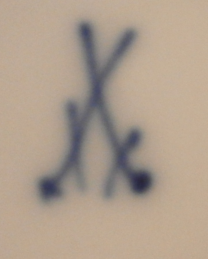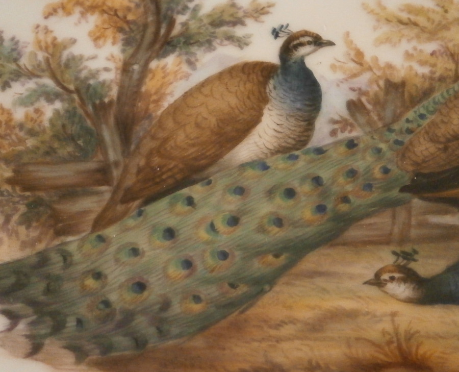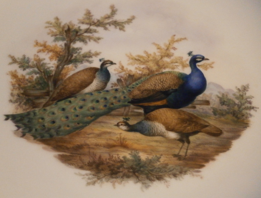 This is a great plate made by Meissen in the late 19th or early 20th century. It is hand painted with a superb peacock bird scene in the center including a male and two females in a landscape surrounding. The rim has one of their nicer fancy gold trims to it as well as five different bugs / insects. This type of gold trim is more common on cobalt ground pieces they made. The edge is a bit wavy rather than just plain round which adds a nice touch to the piece. It looks stunning on display! The plate is marked with the under glaze blue crossed swords mark underneath as well as the usual impressed numbers. It is about 1.25 inches tall and 8.25 inches in diameter. It is in perfect condition. Please email me for more information or other pictures.