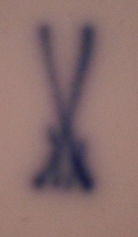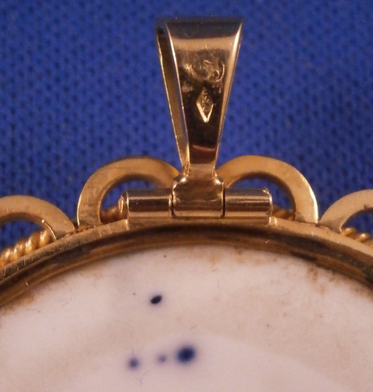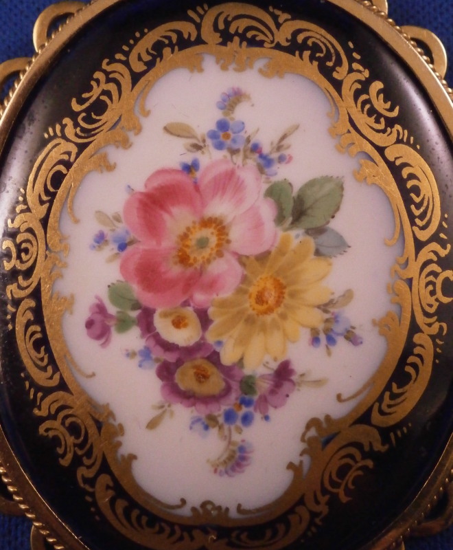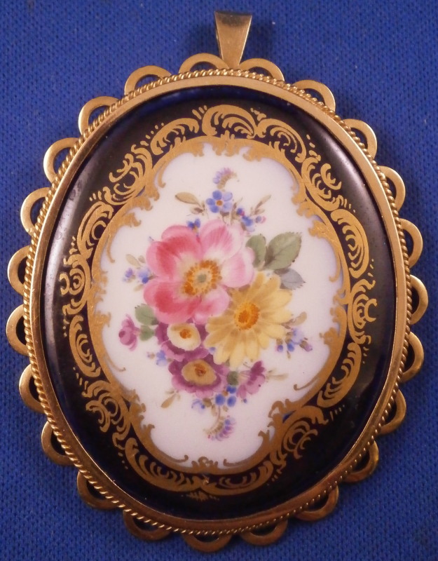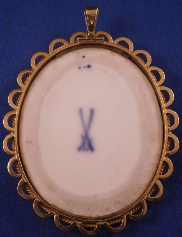 This is the nicest of these pendants I have ever seen or owned! It was made by Meissen in the early 20th century and is hand painted with a superb floral arrangement on a white ground in the center with the surrounding being cobalt blue ground with a nice gold design over that. One finds these in some nice sterling silver mounts but rarely ever in an 18 Karat gold mount like this if ever. Especially one this large as it is the largest pendant I have seen as well. Plus (as if you need more) it comes with a nice 18K Gold necklace as well. Doesn't get any better than this! The mounts on the pendant are superb - a bit fancy but not too crazy and not flimsy at all but nice and thick and sturdy. Even the way the little piece that holds the necklace is attached is sturdier and nicer than any other I have come across. Someone really went all out. The porcelain piece is marked underneath with the under glaze blue swords mark as shown - 1st quality and the silver is marked 0.750 as far as I can tell or at least something in front of the 750 plus a hallmark of sorts that I really cannot make out. The necklace is marked 750 as well. The set is in perfect condition. The pendant 0.1875 inches thick, 2.75 inches tall with the necklace attachment and 2.125 inches wide. The necklace is 11.75 inches long when closed. I weighed it with my not very good balance it and it showed it to be 1/2 ounce but might be a little less or more since it is not very exact. I would assume the gold on the pendant is at lest another 1/4 ounce. Please email me for more information or other pictures.