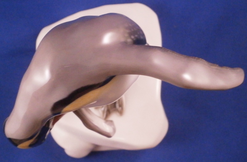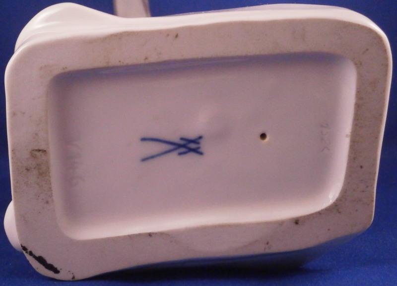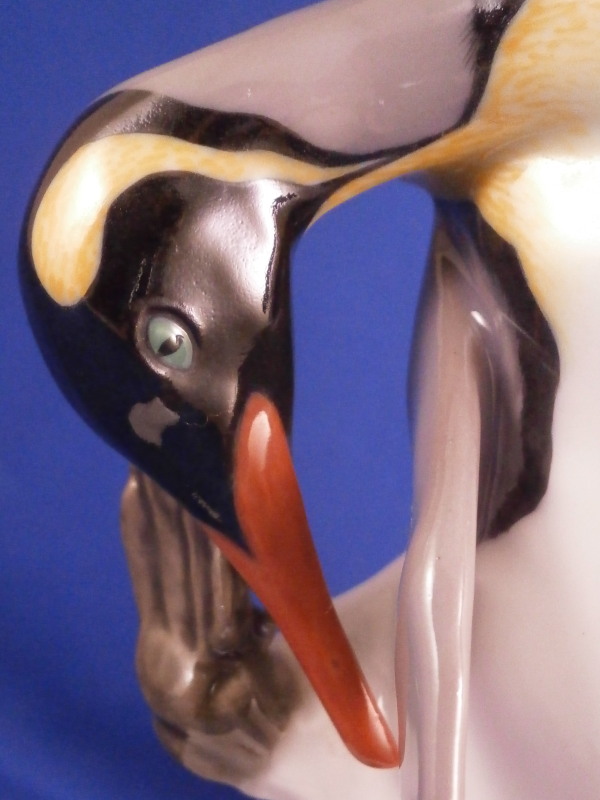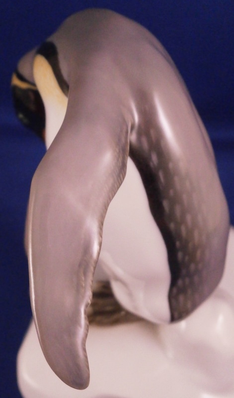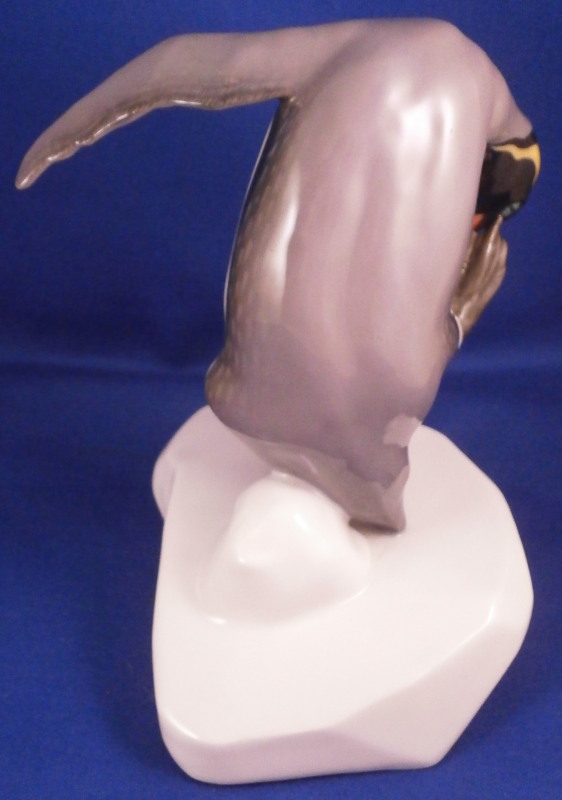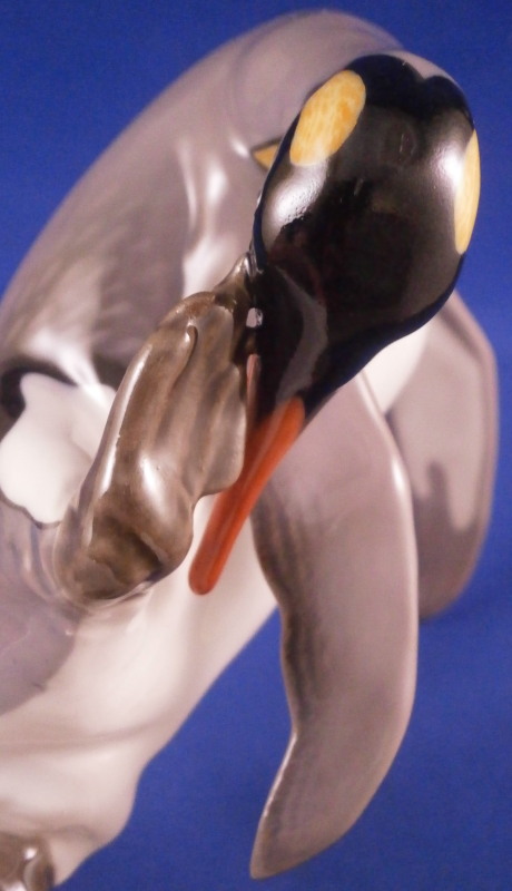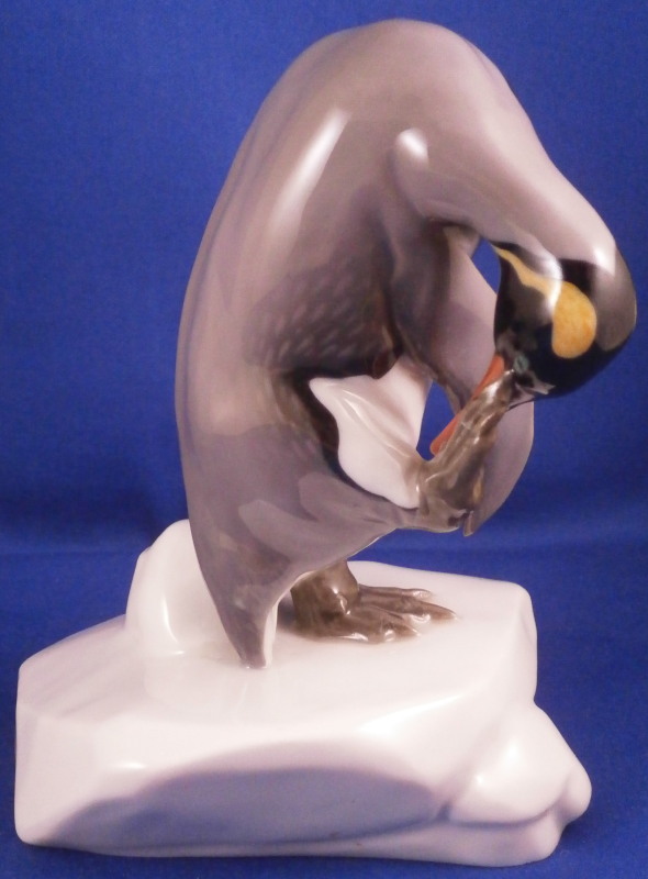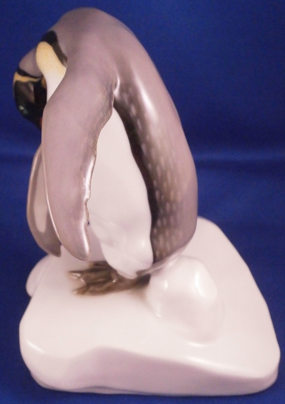 This is a hard to find figurine of a penguin made by Meissen in the 20th century. It is of a King penguin grooming itself. Superbly modeled by Erich Hoesel in 1913 and painted to perfection standing on a piece of ice. The rare under glaze colors are spectacular on this figure . The figurine is in perfect condition! The underside is marked with the under glaze blue crossed swords mark (first choice)as well as the usual impressed / incised marks as shown. The figure is 5.125 inches tall, 4.125 inches wide and 4 inches deep. Please email me for more information or other pictures.
