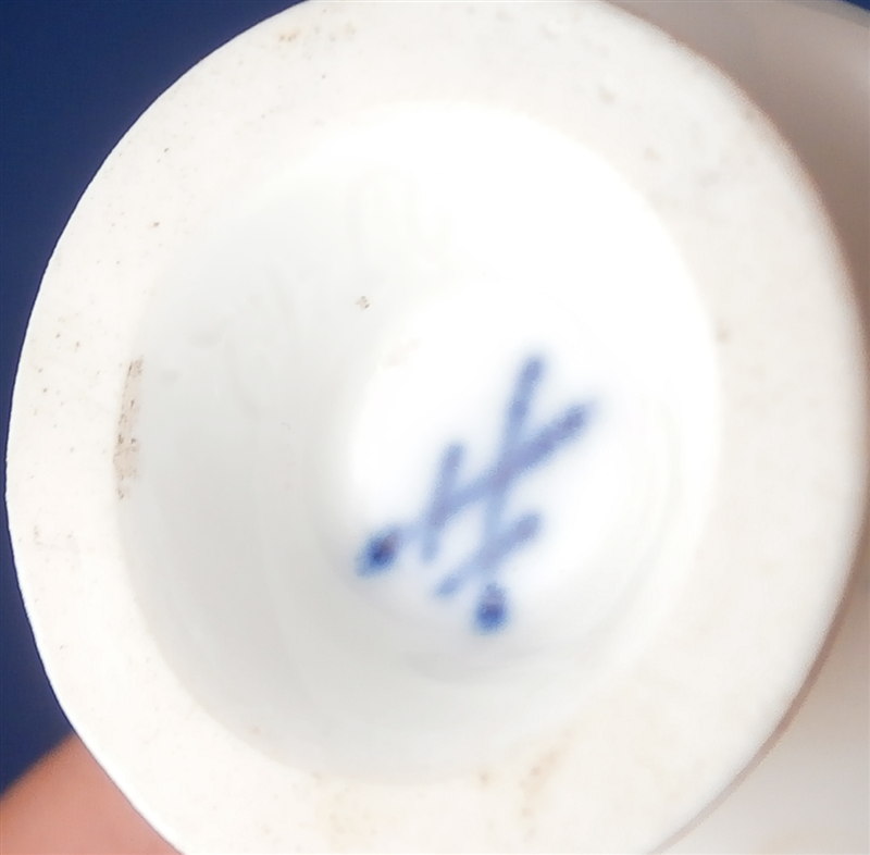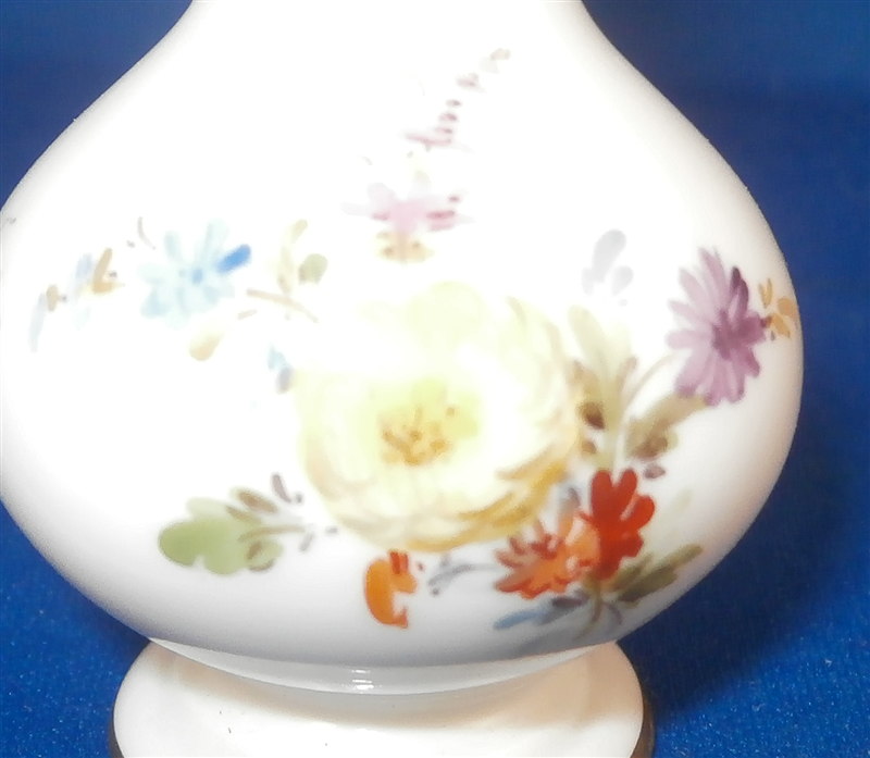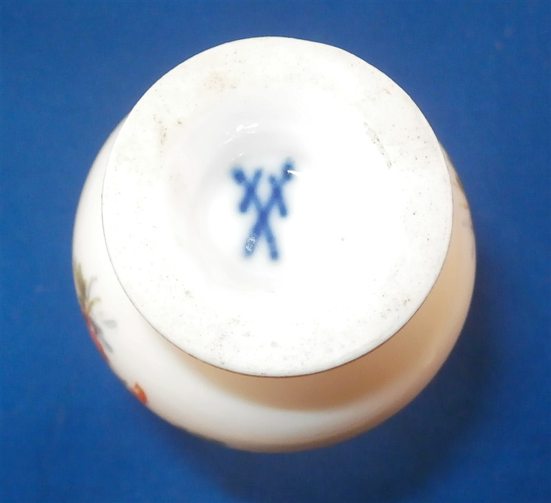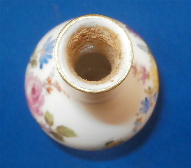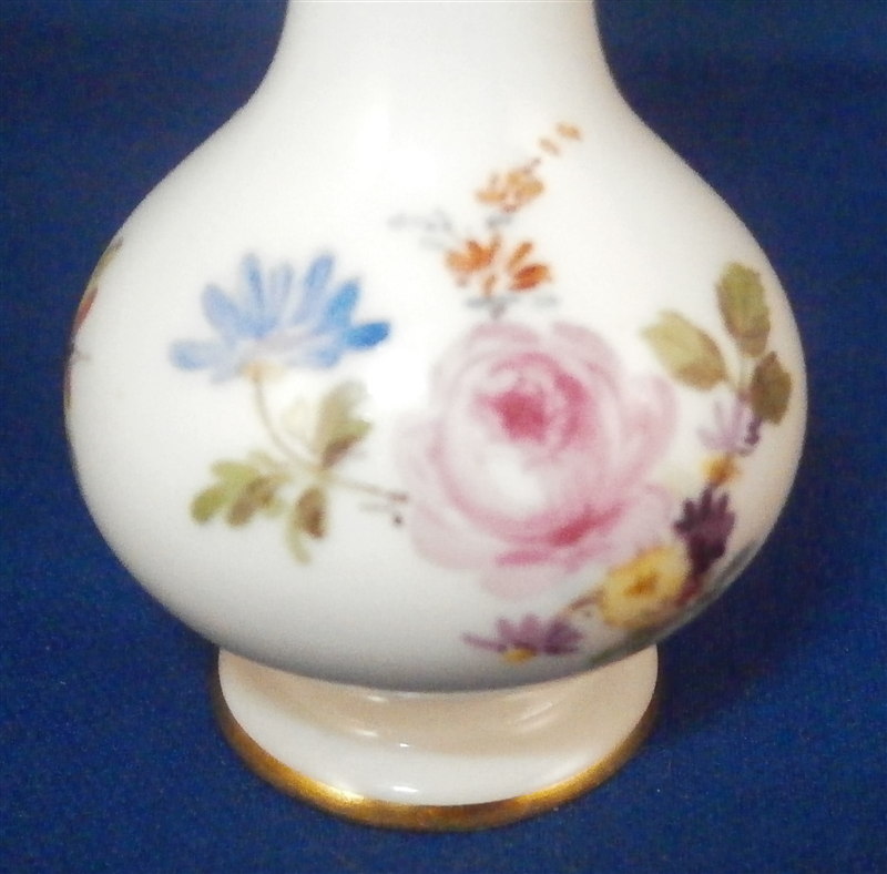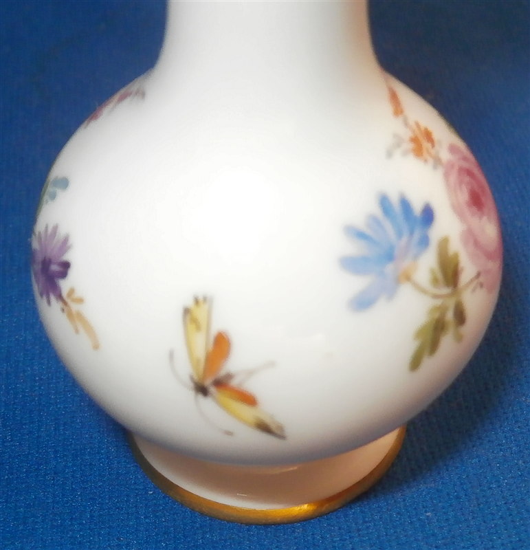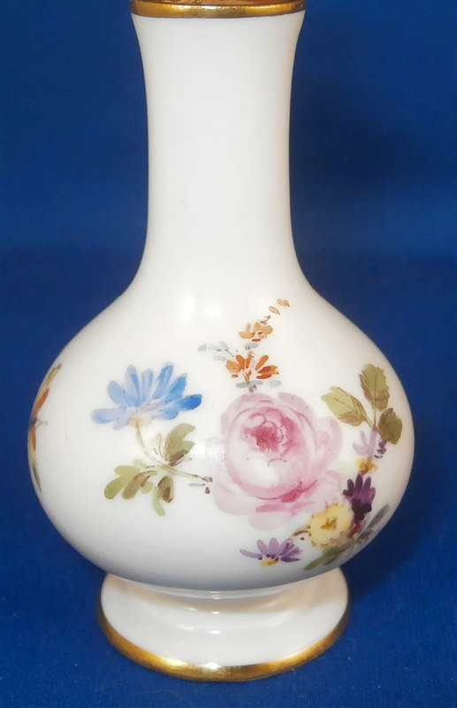 This is a nice 19th century Meissen porcelain perfume bottle with its lid. The piece is superbly handpainted with a floral arrangement on the front and the back as well as a small bug on either side. Nice gold trim on the top edge, the bottom edge and to the lid edge and finial. The perfume bottle is 3 inches tall and 1.5 inches in diameter. It is in perfect condition even the lid still has some of the original cork on it but that is fairly worn. The piece is marked underneath with the underglaze blue crossed swords mark as well as the usual incised marks. Please email me for more information or other pictures.