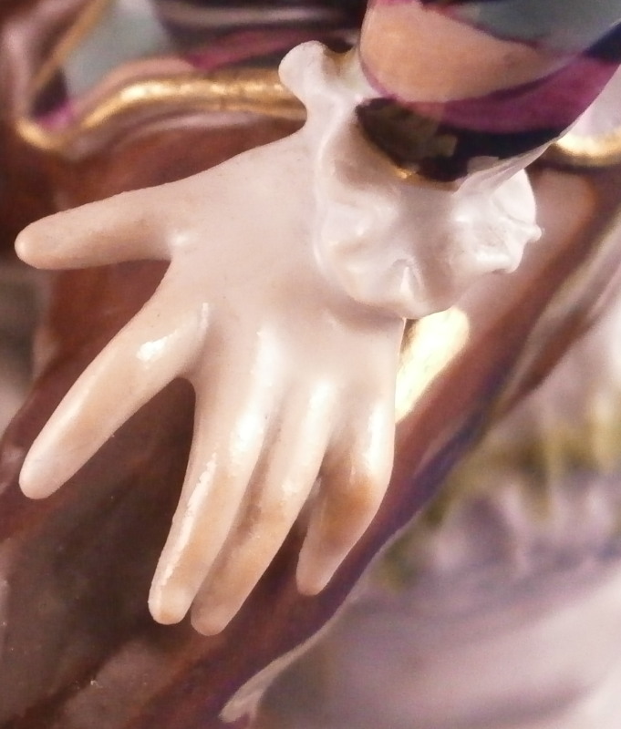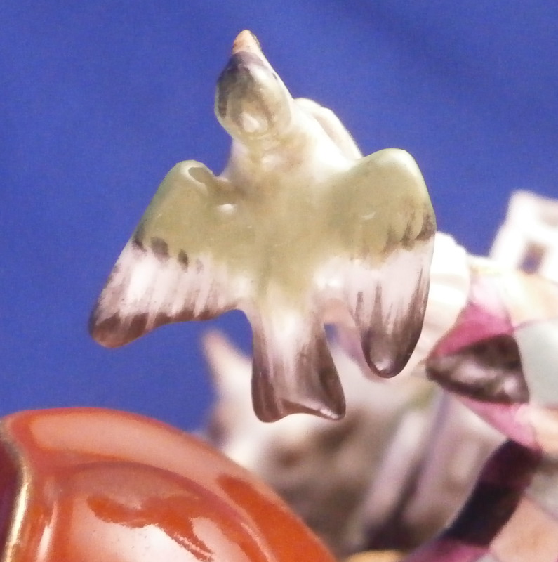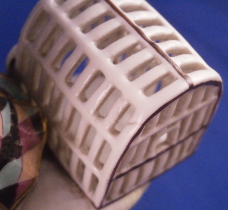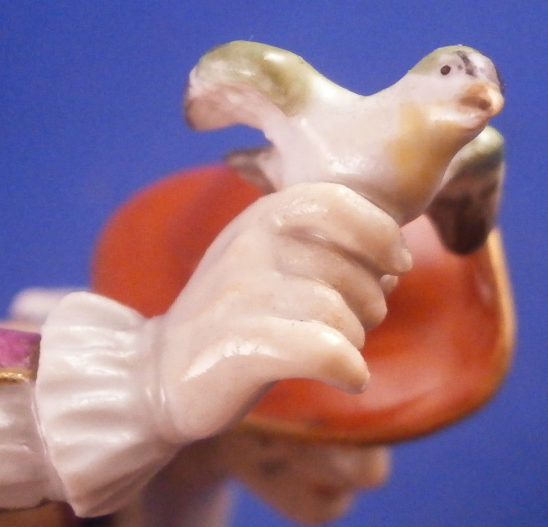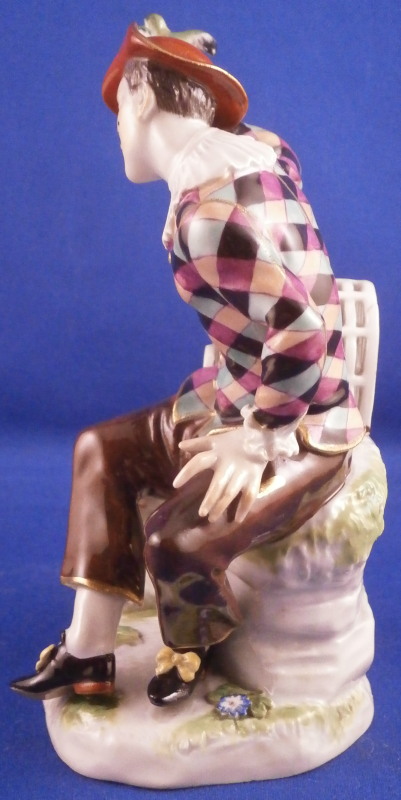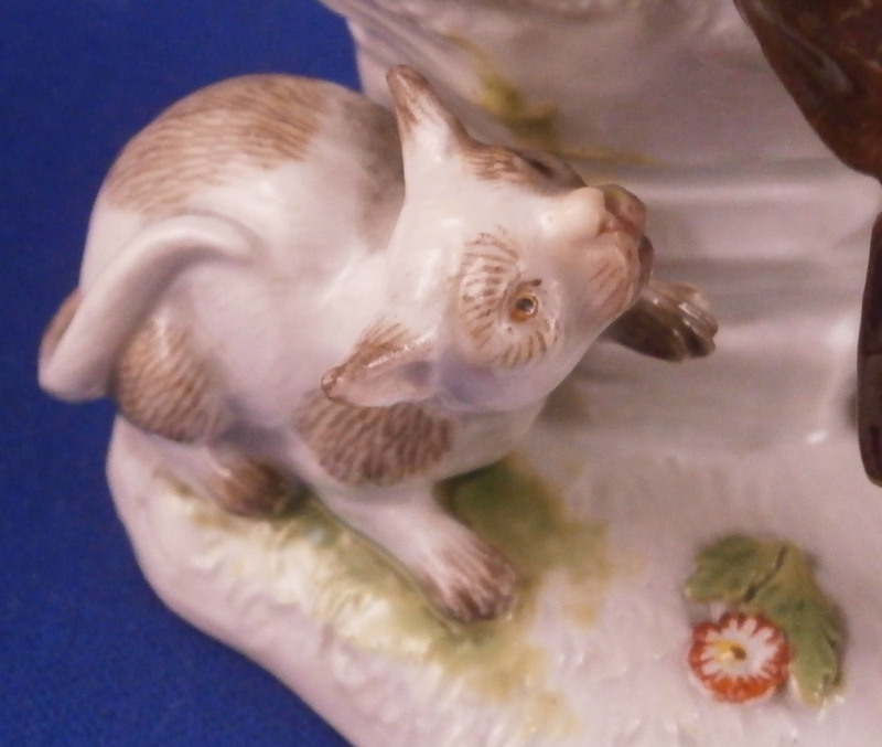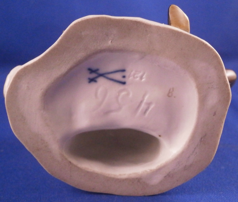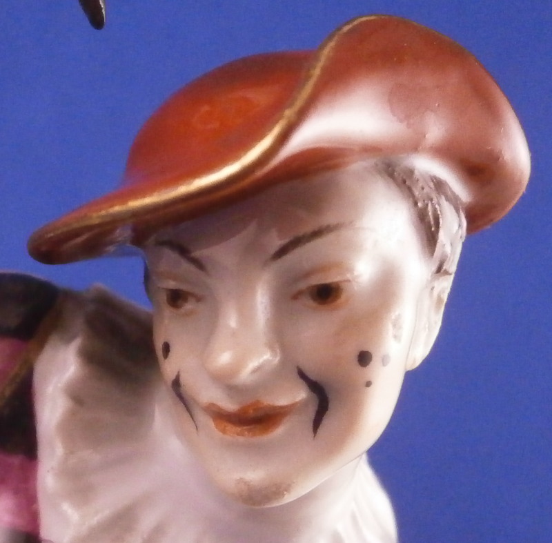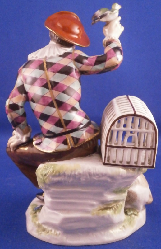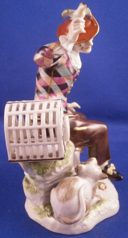 This is a really superb figurine made by Meissen during the Pfeiffer period in the 1920s. It is a really fun figure of a harlequin sitting next to a bird cage while holding a bird in his one hand and with a cat sitting next to him on the nicely modeled base looking rather intently at the poor bird. The harlequin is dressed nicely with a colorful shirt and brown pants plus colorful shoes. Some applied flowers to the base and grasses painted on. All in all this is a very a fun figurine to look at! Off course this is copied from the mid 18th century Meissen original! The figurine is in superb condition with two firing flaws to the bird cage which is to be expected with that fine work but no real damage. The figure is marked underneath with the under glaze blue crossed swords mark with the dots between the tips as well as the usual impressed and incised marks as shown plus a painter's mark 8. in black. First quality! The figurine is about 5 inches tall, 3.5 inches wide and 3 inches deep. Please email me for more information or other pictures.