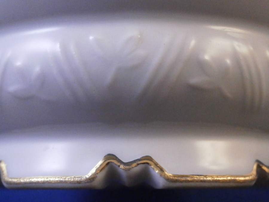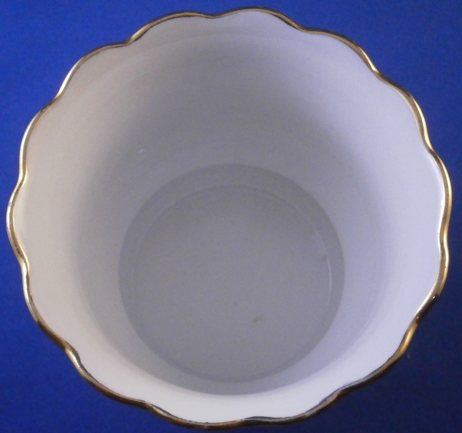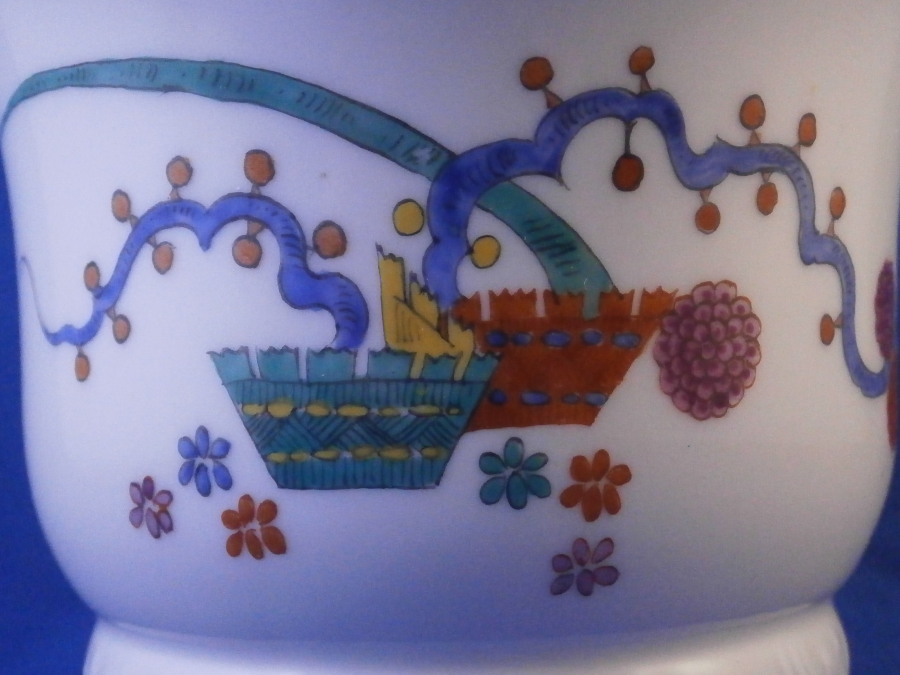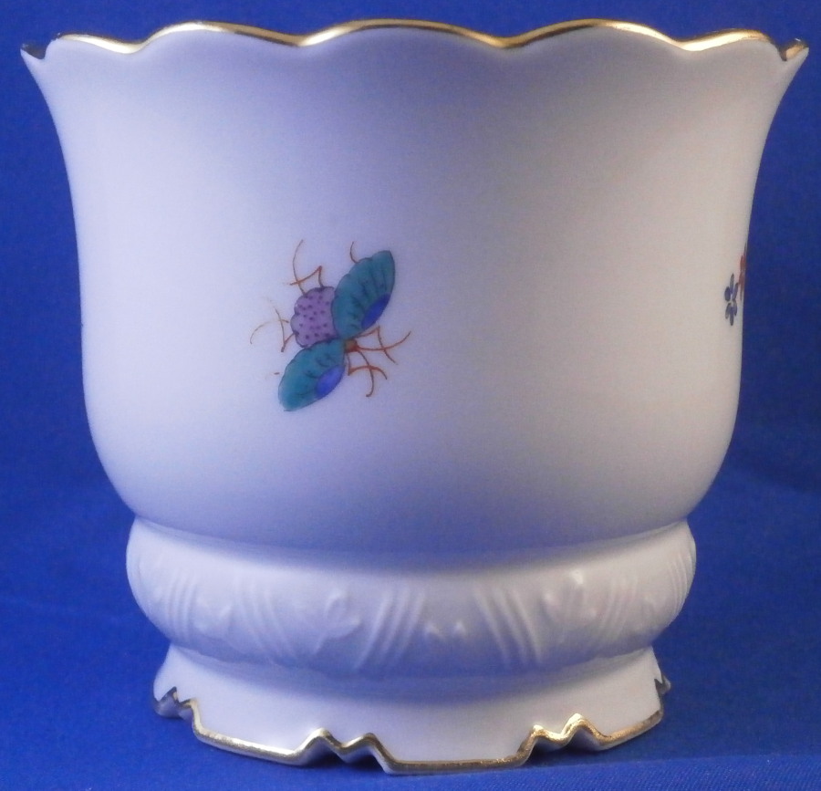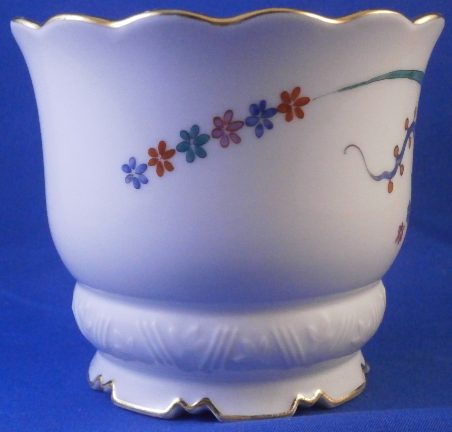 This is a rare small flower / cache pot / jadiniere made by Meissen in during the Pfeiffer period of the earlier 20th century. It has a really nice shape to it with the wavy top edge, cutouts along the base giving it a bit of an Art Deco touch and a relief design to the paste along the bottom but the best part is the Kakiemon design hand painted to the mid section. It looks amazing and there is even a little bug painted on the backside. Gold trim to the edges. The piece is in perfect condition. It is marked underneath with the under glaze blue crossed swords mark (first choice) with the dot between the tops as well as the usual impressed / painter's marks as shown. The pot is just over 3.25 inches tall and 3.875 inches in diameter. Please email me for more information or other pictures.
