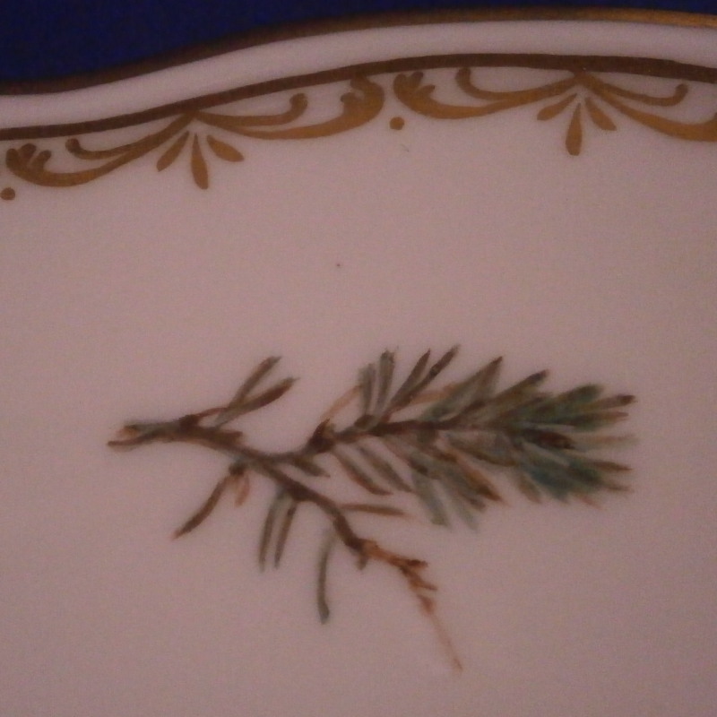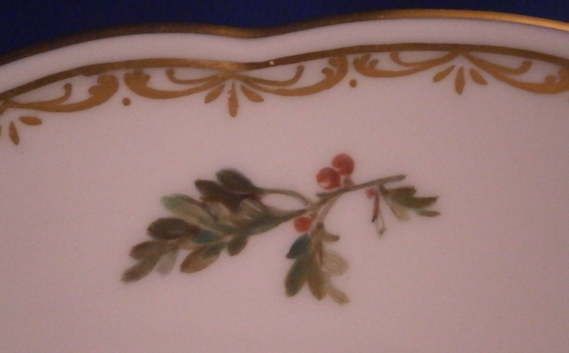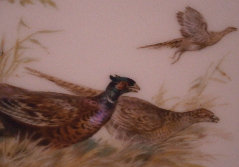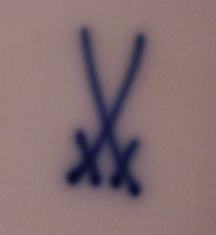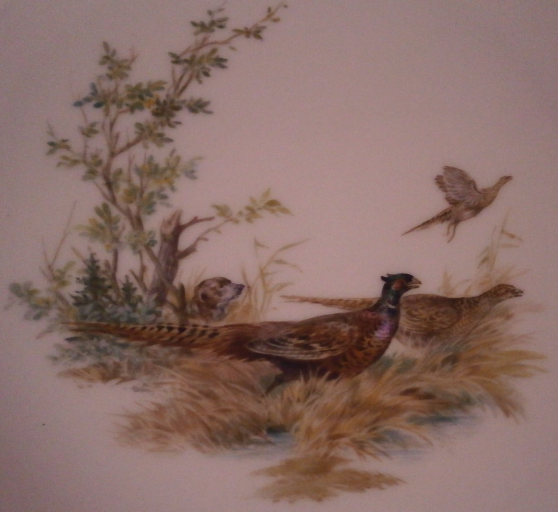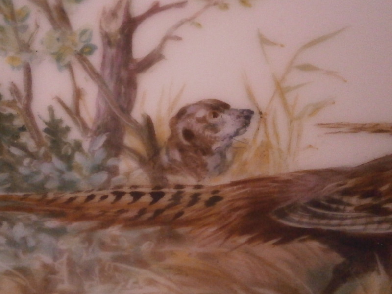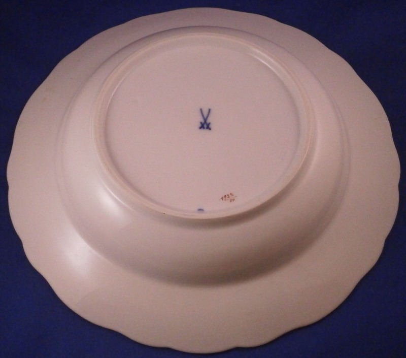 This is a really nice deep plate / soup bowl made by Meissen around the late 19th or early 20th century. It is hand painted with superb scene in the center of a landscape including some phesant birds with a dog peaking out of the underbrush stalking them. Very well painted! The rim has some greenery to it including a holly branch and a pine branch with a nice gold trim to the wavy rim. The quality of the scene is top notch and it is not something you see very often by them. The plate is in perfect condition. It is marked with the under glaze blue crossed swords mark underneath as well as the usual impressed marks, etc. of this period that one expects to find. The piece is 1.875 inches tall and 9.625 inches in diameter. Please email me for more information or other pictures.
