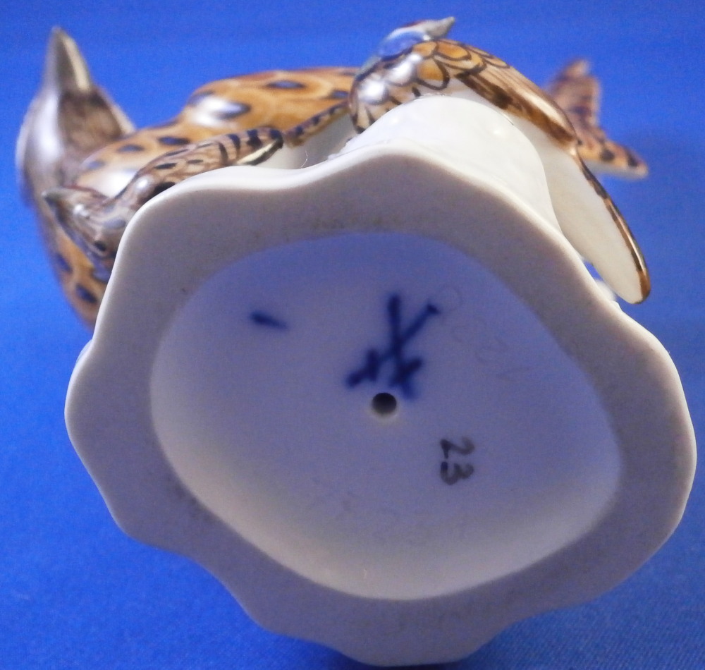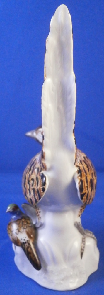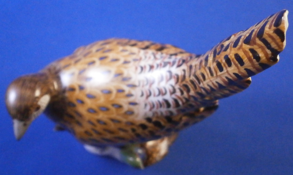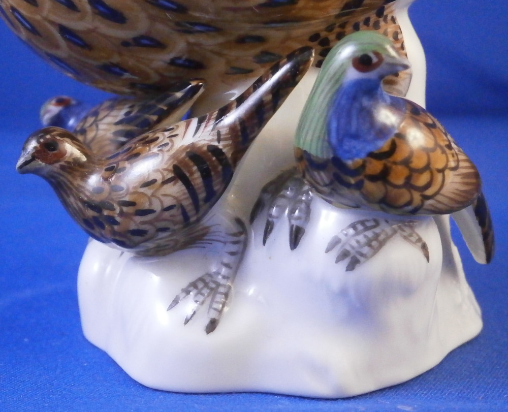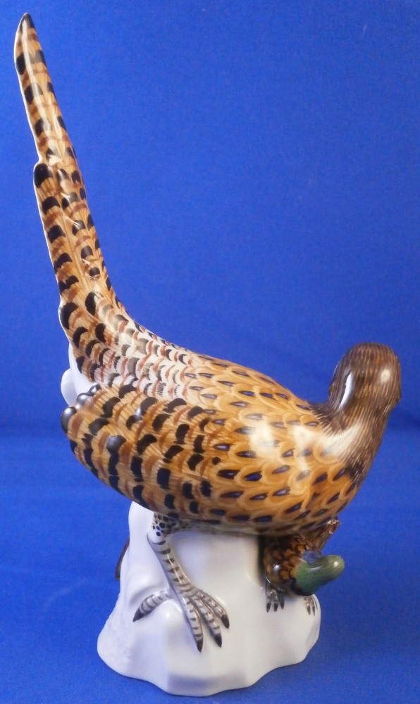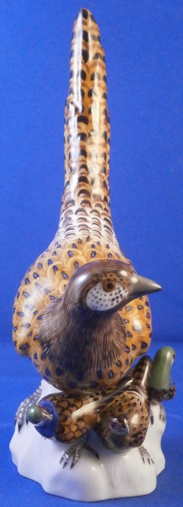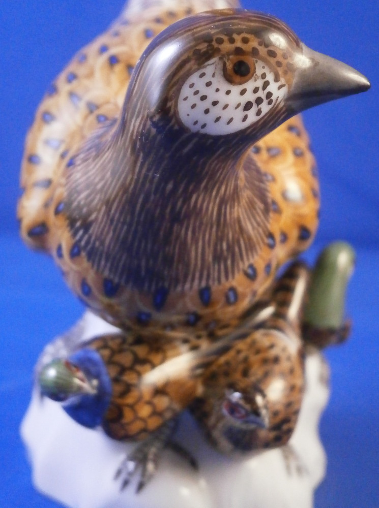 This is a large version of a figurine of a female pheasant aka pheasant hen made by Meissen in the 20th century. this larger version has three baby chicks roaming the base underneath her. The mon is pretty similar to the small version herself but that addition is just superb. She is standing on a white base with the babies in the front under her. There are two males and one female chick. Doesn't get much cuter than this! The bird is very well modelled and hand painted to perfection!. Amazingly it is in perfect condition. The piece is marked with the blue swords underneath as well as the usual impressed numbers of the period. Also a painter's mark 23 as shown. The figure is 6 inches tall including its tail, 3.125 inches deep and 2.125 inches wide. Please email me for more information or other pictures.