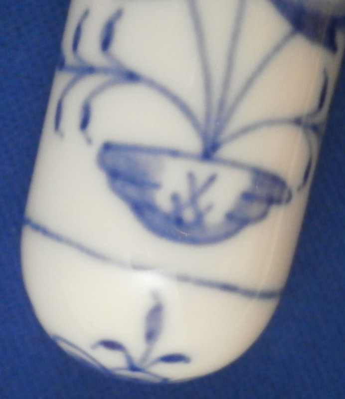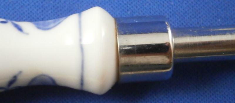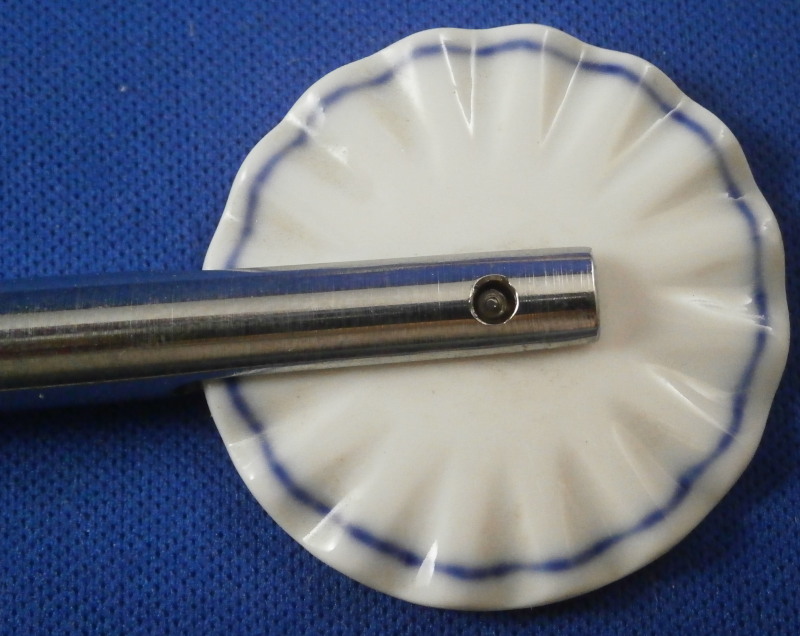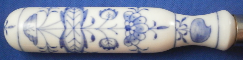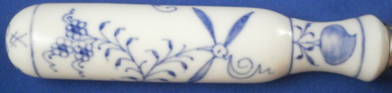 This is the one of those really hard to find items made by Meissen in the 20th century - a pie / pastry crimper . The handle is made of porcelain which is decorated with their famous blue onion design, the wheel is made of porcelain as well and decorated with a simple blue ring and the connecting parts are made of some sort of metal - I am assuming it is stainless steel. While I have seen pie crimpers that were made in Germany I ahve never seen one made by Meissen and in their usual fashion it is far superior to those made by their competitors. Instead of a wooden handle it has porcelain and very nice metal parts. A very solid piece that will last forever unless you drop it. The piece is in perfect condition. It is 8.125 inches long with the handle being 4 inches long and the wheel diameter is 1.375 inches. The piece is marked with the blue crossed swords on the end of the handle as well as in the stalk of the "onion". Please email me for more information or other pictures.