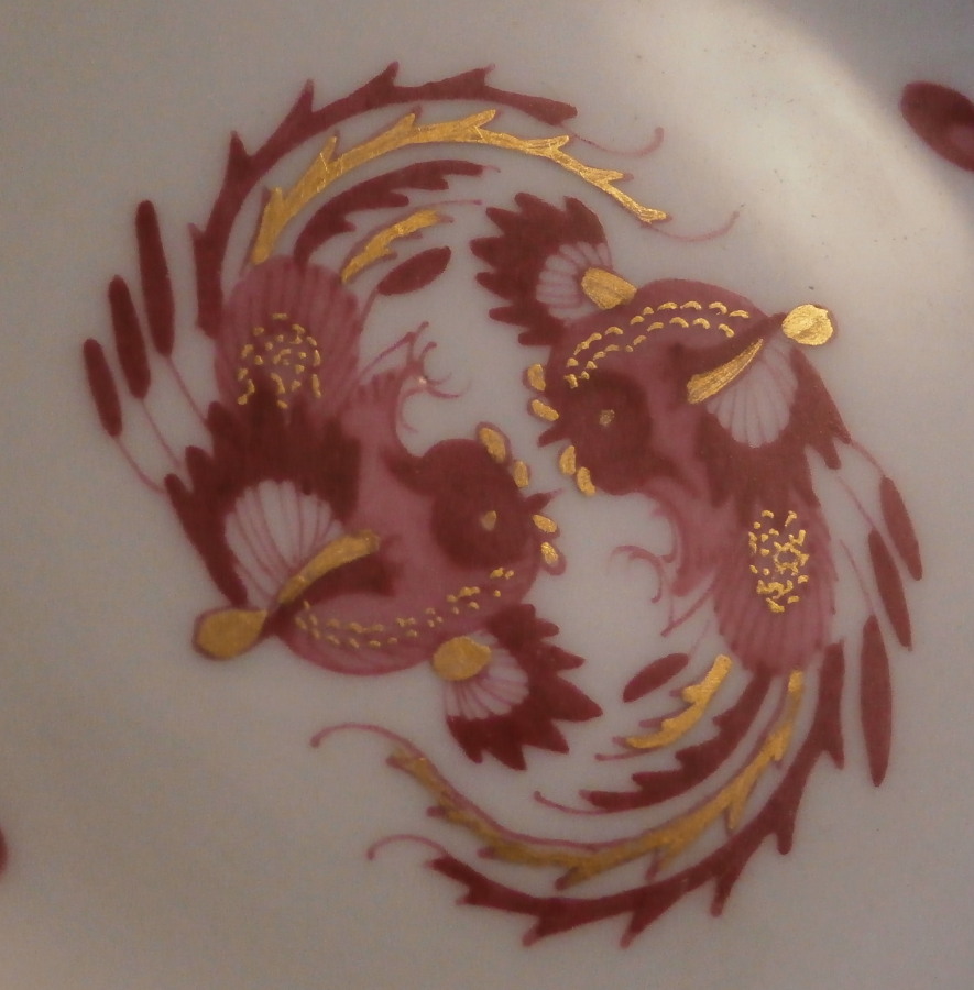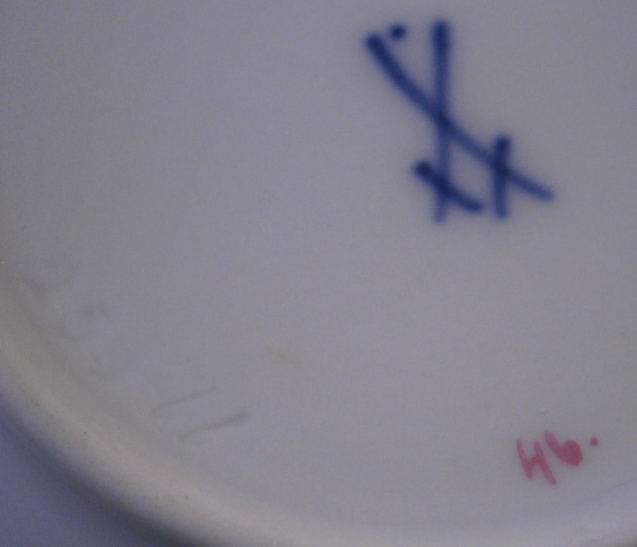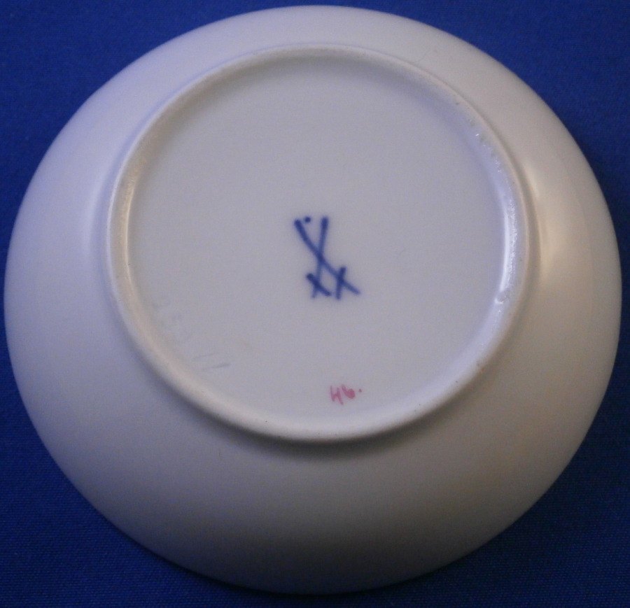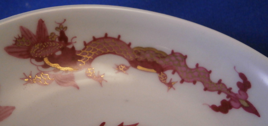 This is a rare little butter pad made by Meissen during the Pfeiffer period of the late 1920's and early 1930's. It could also be a miniature saucer and I personally will use it as a soy sauce dish :) It is hand painted with the Court Dragon pattern in pink and gold. A really nice looking design especially on such a small scale! (In Chinese culture pink holds the same meaning as red so this would be for good fortune and joy. If you collect doll or children's size items this is a must have! The piece is in perfect condition. It is marked on the underside with the under glaze blue crossed swords mark with the dot between the tops and a red painter's number as shown. The piece is 0.75 inches tall and has a diameter of just under 3.125 inches. Please email me for more information or other pictures.