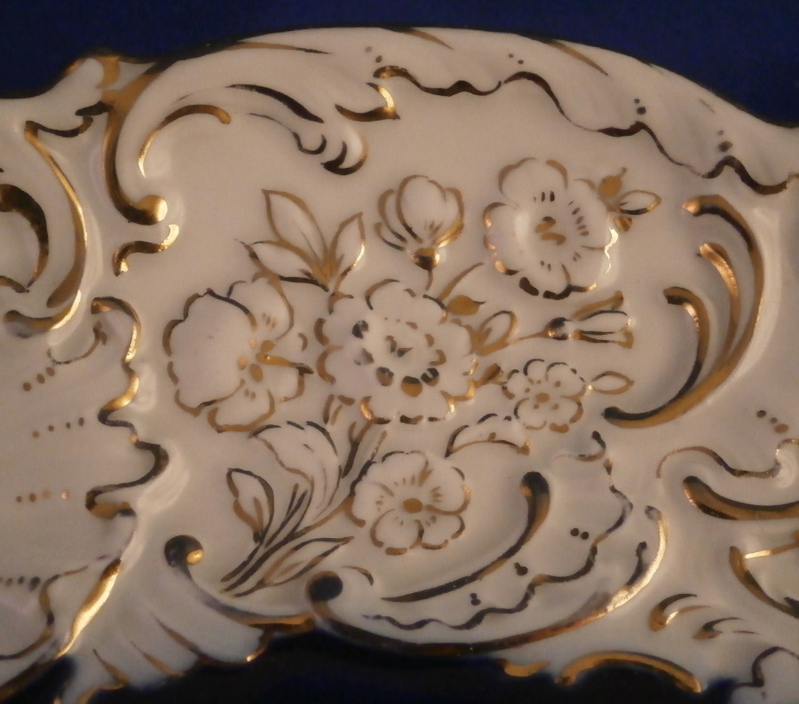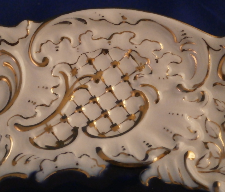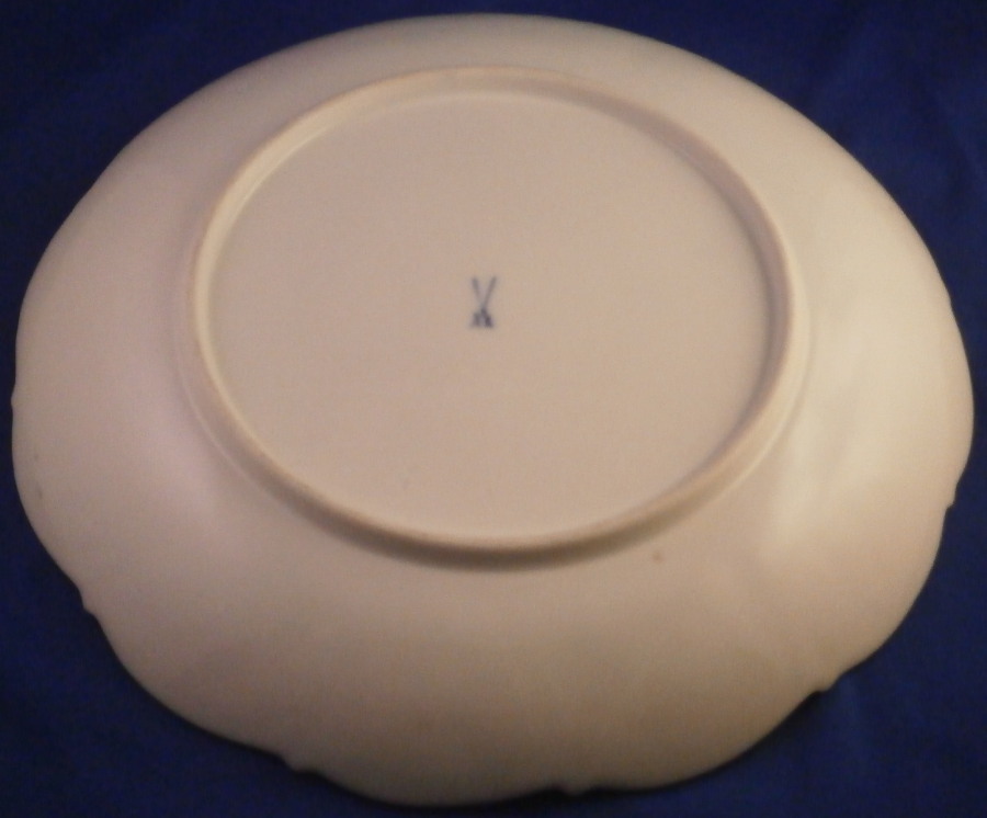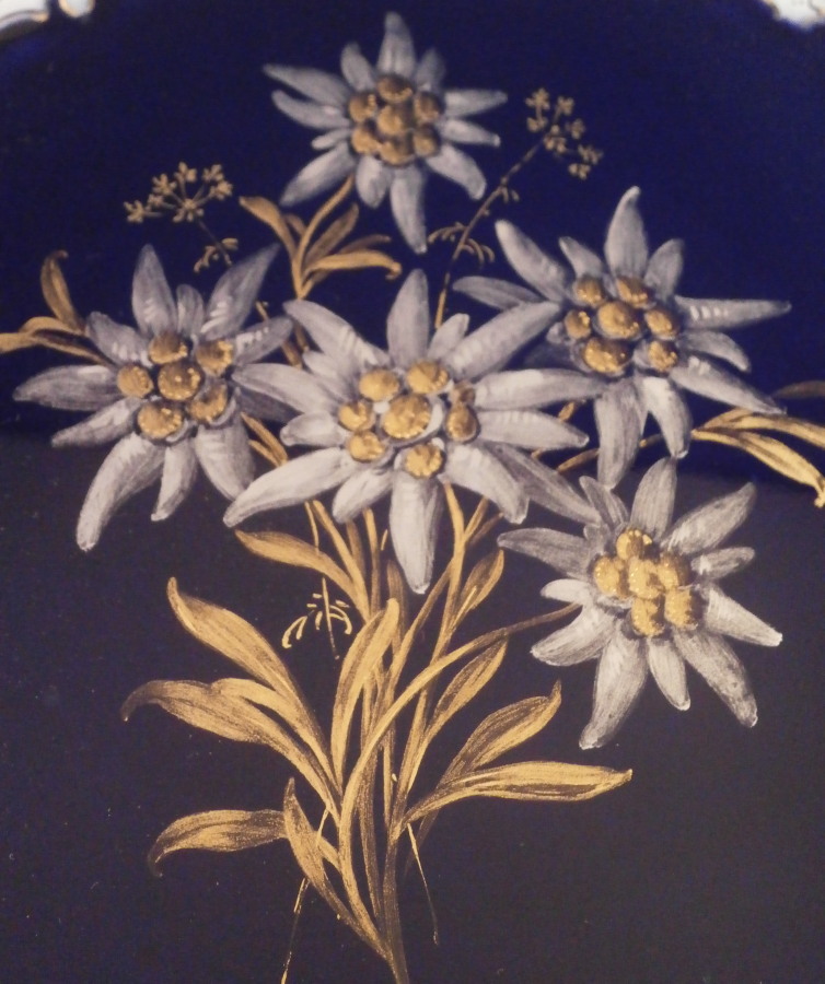 This is a rare large plate / charger made by Meissen in the late 19th century. It is hand painted with one of the nicest and also rarest decorations from this period - the platinum and gold flowers on a cobalt blue background. I am pretty sure the flowers are Edelweiss . The edge has three different relief designs - two are of relief flower arrangements highlighted with gilding with a trellis design in between them also highlighted with gilding and lots of relief scrolls all around with more gilding to them. A stunning looking plate! The plate is in superb condition with just a few spots of minor wear to the very edge. It displays perfectly! The plate is marked with the under glaze crossed swords mark underneath as well as the usual impressed numbers, etc. as shown. The piece is 1.5 inches tall and has a diameter of 11.25 inches. Please email me for more information or other pictures.