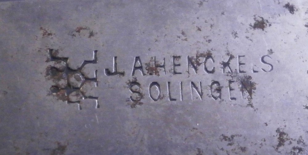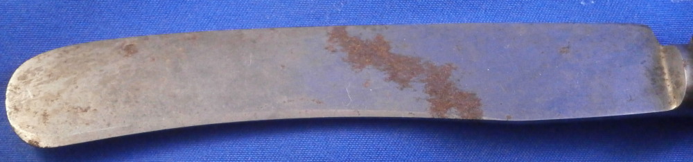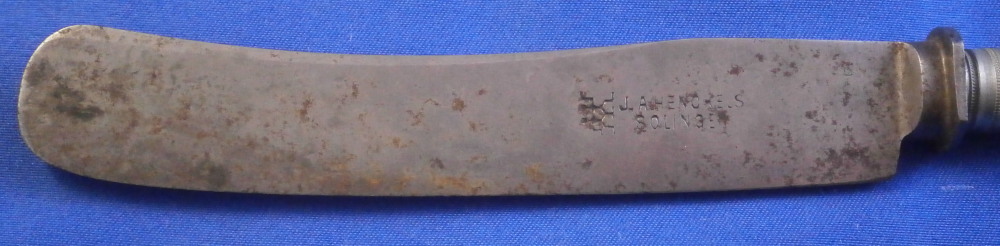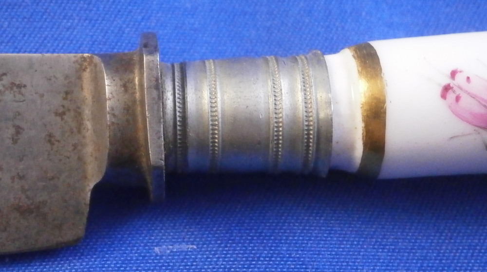 This is a a nice porcelain handled knife made by Meissen in the late 19th or early 20th century. The porcelain handle is hand painted with two very nice floral arrangements as well as two single flowers as well as two bugs and a bit of gold trim to the ferrule end. The porcelain piece is marked but mostly hidden under the ferrule. I have some other pieces from this set without the blade and the mark is clearly visible on those. The knife is in great condition with some oxidation to the blade. The ferrule appears to be made of silver. The blade is marked J.A. Henckels Solingen as shown. A rare chance to get a Meissen porcelain handled knife! The piece is about 8 inches long with the visible porcelain being about 3.125 inches long. It is about 0.625 inches wide. Please email me for more information or other pictures.