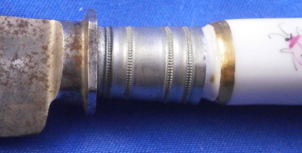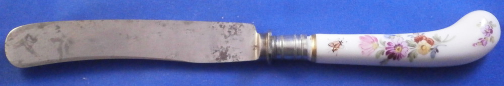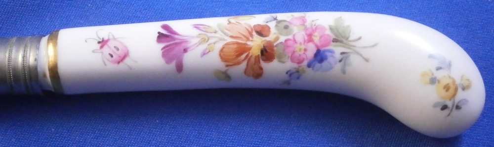 This is a a nice porcelain handled knife made by Meissen in the late 19th or early 20th century. The porcelain handle is hand painted with two very nice floral arrangements as well as two single flowers as well as two bugs and a bit of gold trim to the ferrule end. The porcelain piece is marked but hidden under the ferrule. I have some other pieces from this set without the blade and the mark is clearly visible on those. The knife is in great condition with some oxidation to the blade. The ferrule appears to be made of silver. The blade is marked J.A. Henckels Solingen as shown. A rare chance to get a Meissen porcelain handled knife! The piece is about 8.125 inches long with the visible porcelain being about 3.125 inches long. It is about 0.625 inches wide. This one matches the other one I have up for sale if anyone would want a rare pair. Please email me for more information or other pictures.