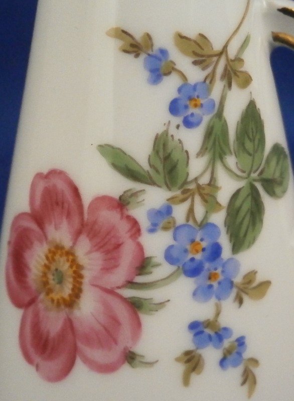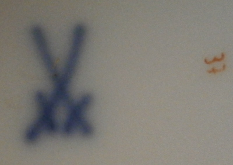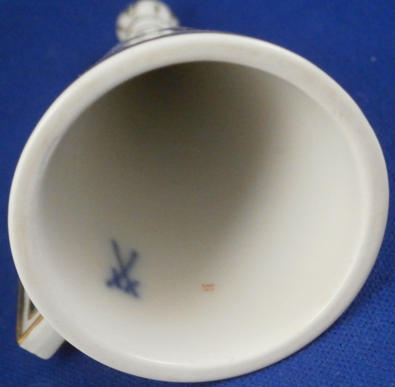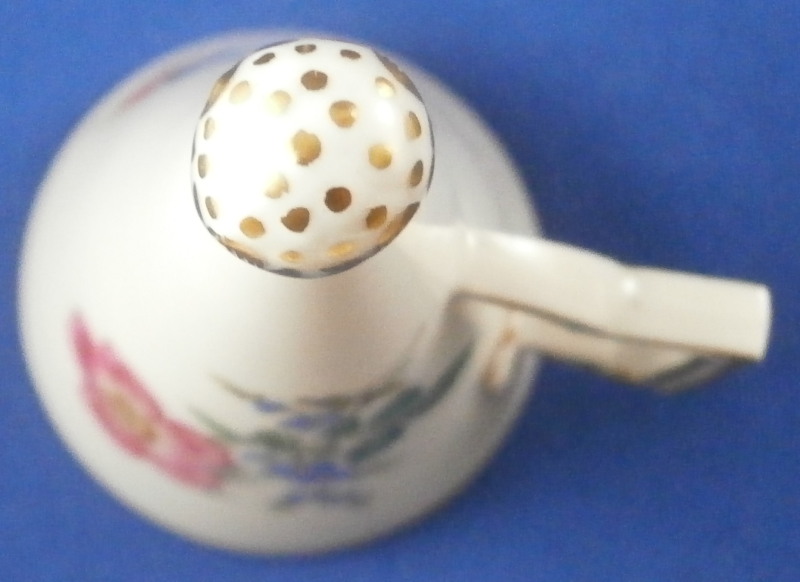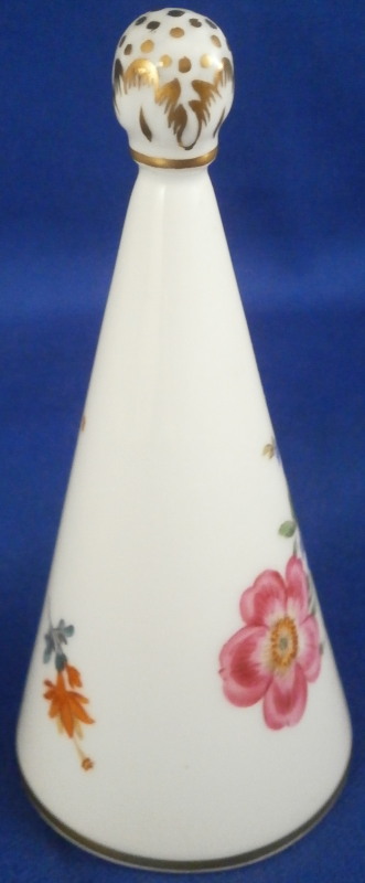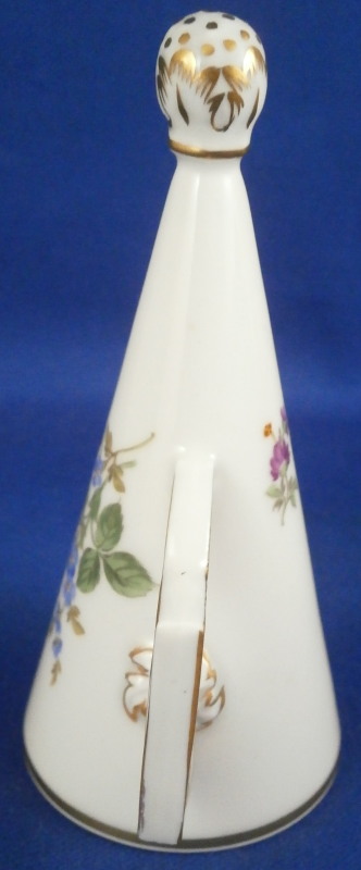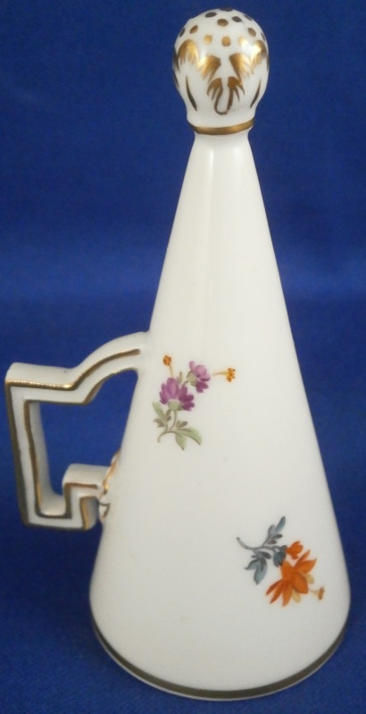 This is a porcelain candle snuffer made by Meissen in the 20th century. A really fun piece and not soemthing you see often especially with the polychrome hand painted floral design. The piece has a nice shape to it with a handle to one side with some gold trim to it, a gold finial and the large floral arrangement to one side and two single flowers to the other. The piece is in perfect condition. It is 3.5 inches tall and the bottom diameter is 1.625 inches. Marked underneath with the under glaze blue crosswer sowrds as well as a painte's mark. Two cut marks across the swords - not sure why it was deemed second choice. Please email me for more information or photos.