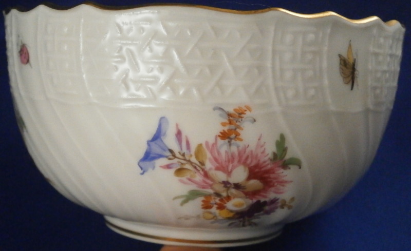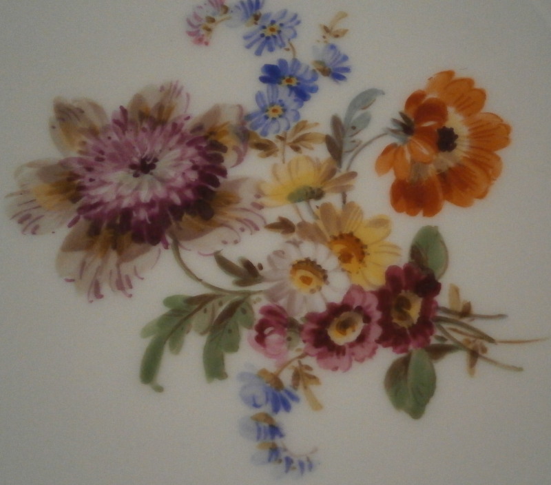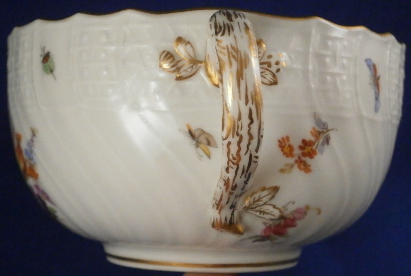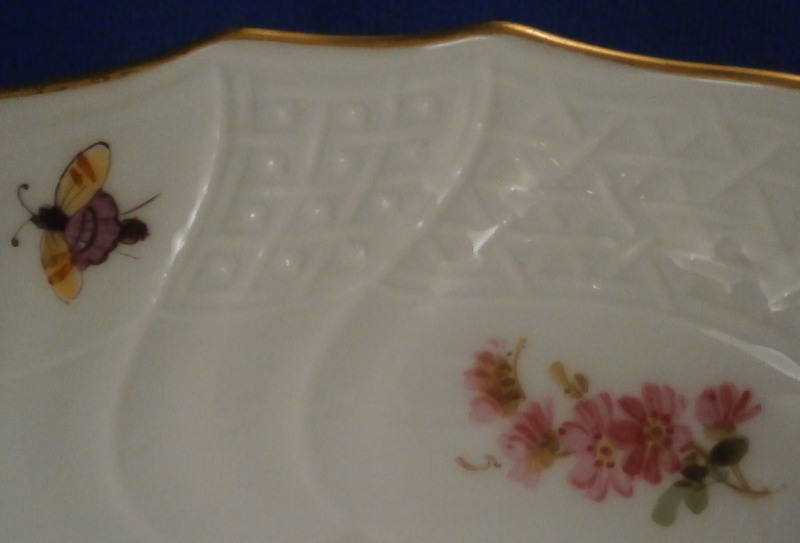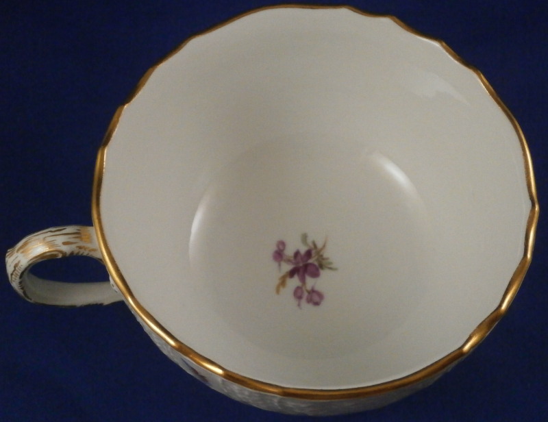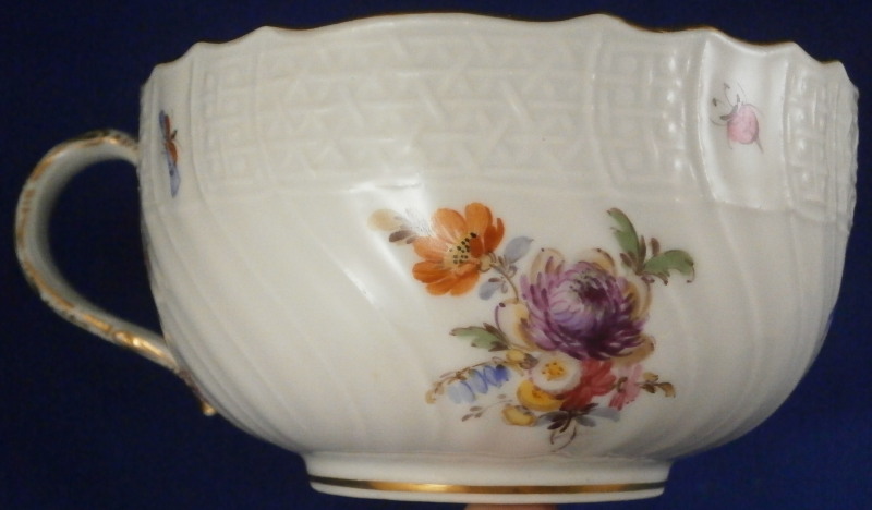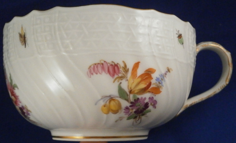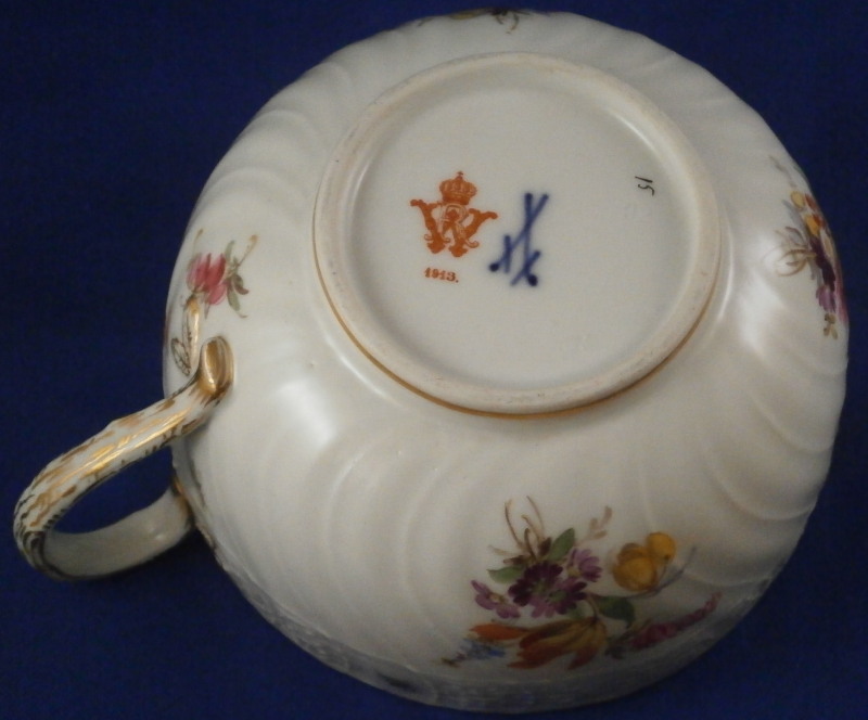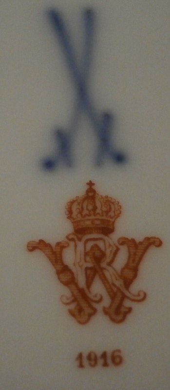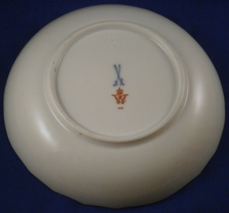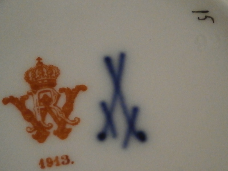 This is a cup and saucer made by Meissen in 1913/1916 for the personal use of Kaiser Wilhelm the Second. Quite rare as he preferred the ones made by KPM of which I own a few (not to say those are common either! A great cup and saucer that is huge in size so likely a breakfast set decorated in the Alt Brandenstein Pattern with a relief design to the rim with four bugs in between, a large central floral arrangement to the saucer and four larger flower arrangements to the cup as well as some scattered smaller flowers. Gold trim to the edges and handle. What makes this piece special besides being a nicely done piece is the fact that it was made for the Kaiser and both pieces have his personal monogram on the underside! The set is in perfect condition. The saucer is 1.375 inches tall and has a diameter of 7 inches. The cup is 2.5 inches tall and has a diameter of 4.5 inches. Both are marked underneath with the underglaze blue crossed swords as well as the usual impressed numbers common to Meissen pieces of this period and off course the WR under a crown and the year 1913 / 1916 under that. Also a blakc painter's mark. The year marks are different because there would have been a lot of these cups in their pantry and they would get mixed up no big deal. Please email me for more information or other pictures.