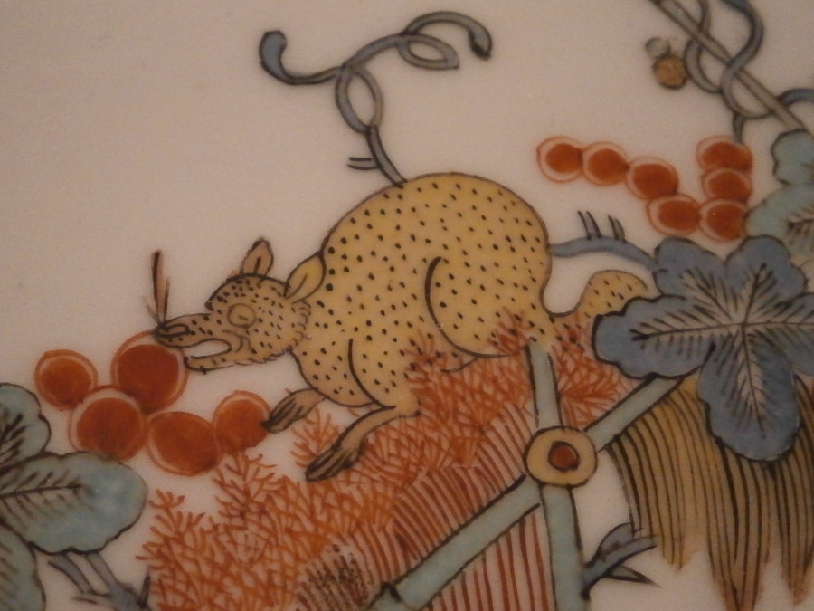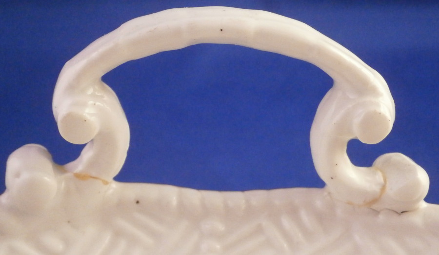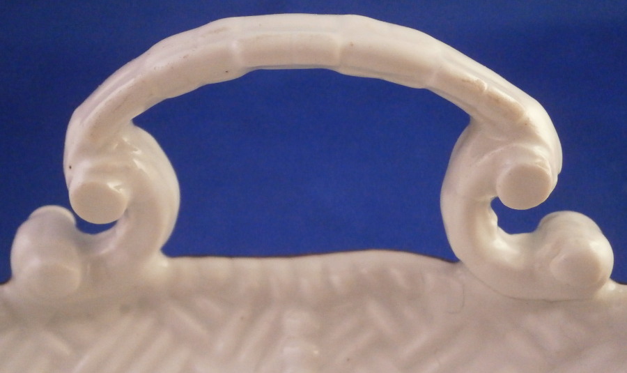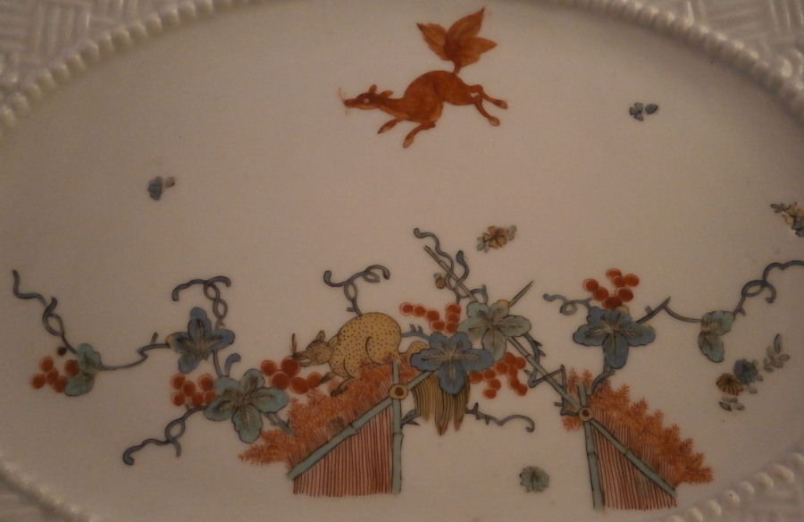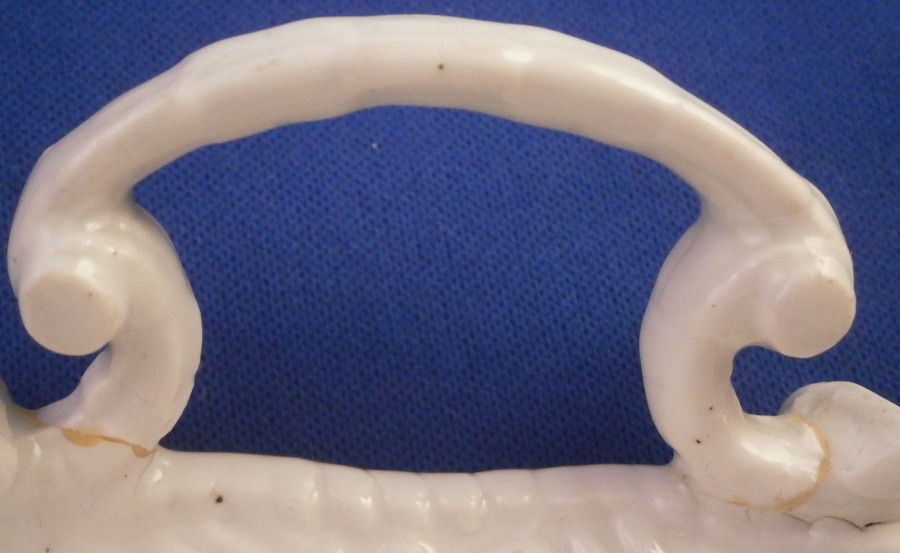 This is an early 18th century Meissen dish dating to about 1730. Some sort of serving dish. It is oval in shape and has a handle to either side. It is hand painted with one of the most famous designs called the Flying Squirrel or Red Fox pattern based on the Kakiemon designs from Japan. Banded hedges with Kakiemon style flowers coming out fo them with the yellow squirrel roaming on top of them and the red fox above. Nice cross hatch type rim decor called the Sulkowski design in relief. Brown trim to the edge. A superb dish that is 1.375 (2.5 at the handles) inches tall, 10.125 inches wide and 7.375 inches deep. It is marked underneath with the early Meissen blue crossed swords in under glaze blue. The dish displays perfectly but one of the handles has been off and reglued with the end scroll on the one side being chipped as shown. A firing crack to the edge and some minor firing flaws one finds on these very early pieces. There is no wear to the decoration and the piece looks stunning! The porcelain of this period is much whiter than that of any other period and the colors just amazing. The handle would be a very easy fix for any restorer! Please email me for more information or other pictures.