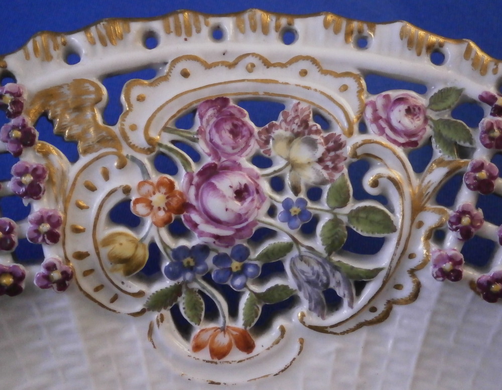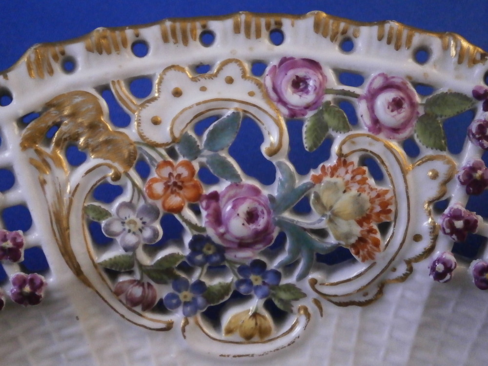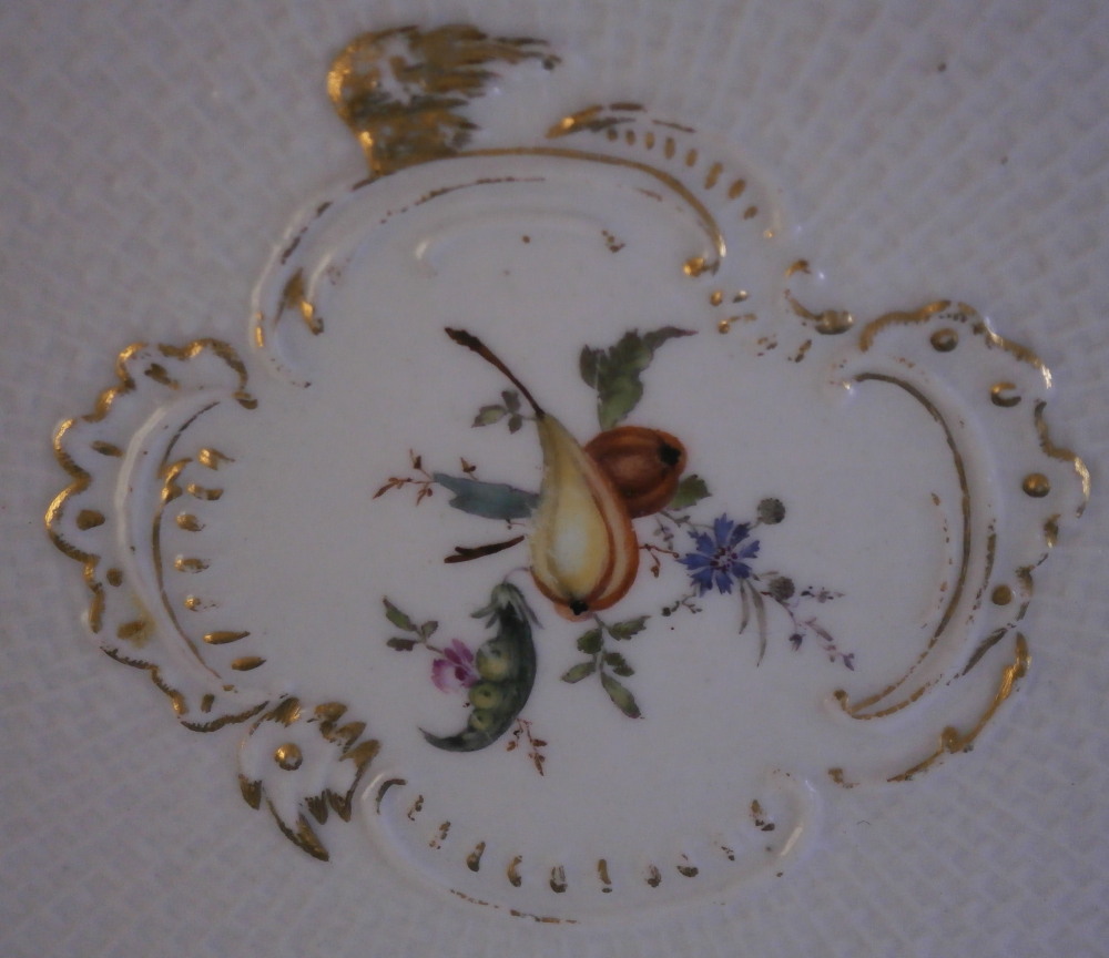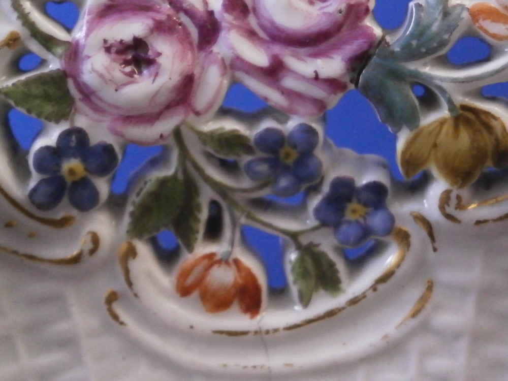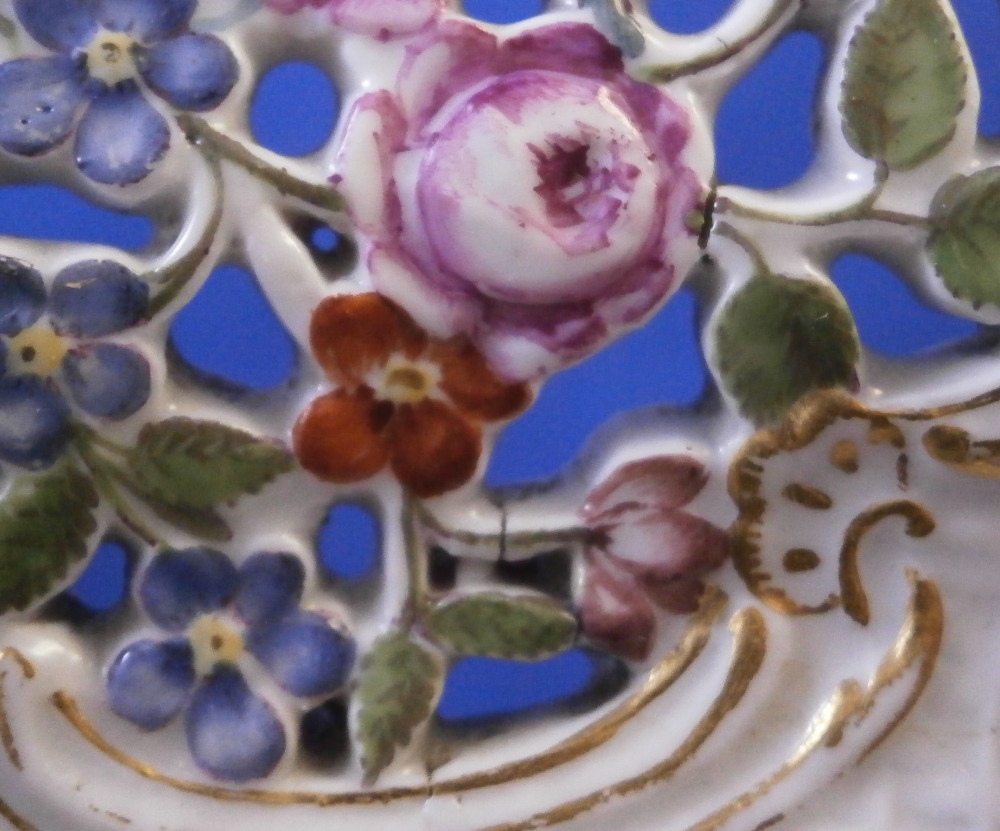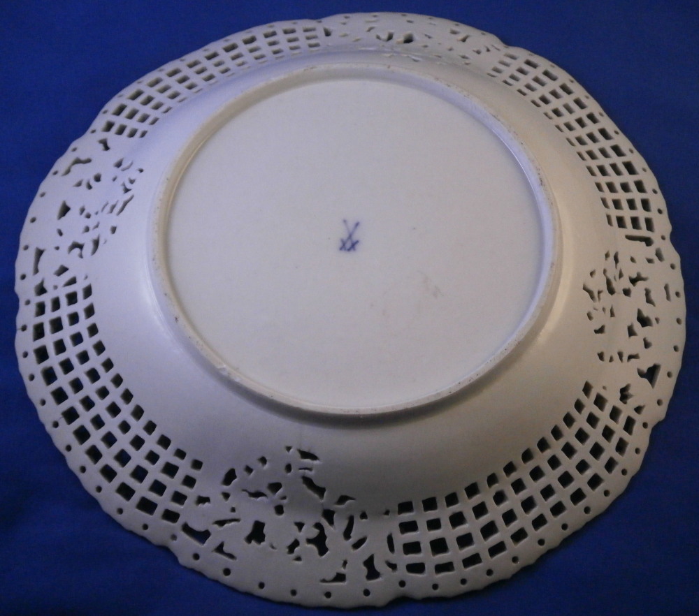 This is a rare treat - a Meissen plate made just prior to 1740 by Meissen. Only these really early pieces get this fancy and nice and it's not a style you really see much later anymore. The plate well is entirely done in a relief basket weave design with a scroll relief panel in the center with hand painted fruit, flowers and vegetables inside. The scrolls are highlighted with gilding. The entire rim of the plate is just amazing. It is fully reticulated with four panels of floral designs all hand painted with those amazing early colors and the space between the them is reticuated as well and each intersection has a purple forgetmenot type flower applied to it. The edge has holes pierced into it and a gold trim to it. Never seen this design before and it is stunning. Must have taken ages to make just this one plate which explains why you just don't see this type of work and quality very often at all even from the top maker. So fragile! The plate in superb condition with a bit of gold wear mainly to the center scroll area and the scrolls right under the flower designs and some hairline / firing cracks from when it was made in the reticulated areas and rim edge as shown. This is not later damage but from when it was made and completely normal on these very early pieces. A stunning plate you will likely never find again! The plate is 1.5 inches tall and 9.375 inches in diameter. It is marked with the under glaze blue crossed swords mark underneath as shown no impressed number yet so nice and early! Please email me for more information or other pictures.