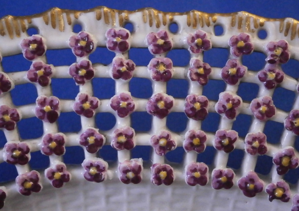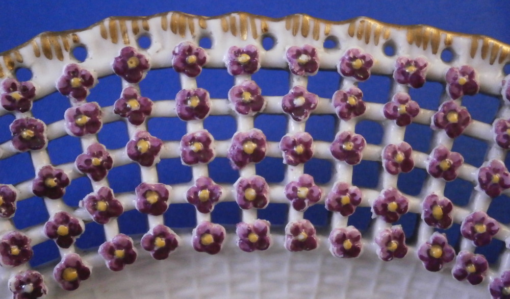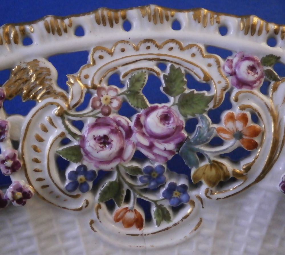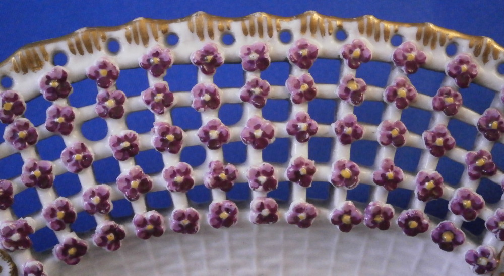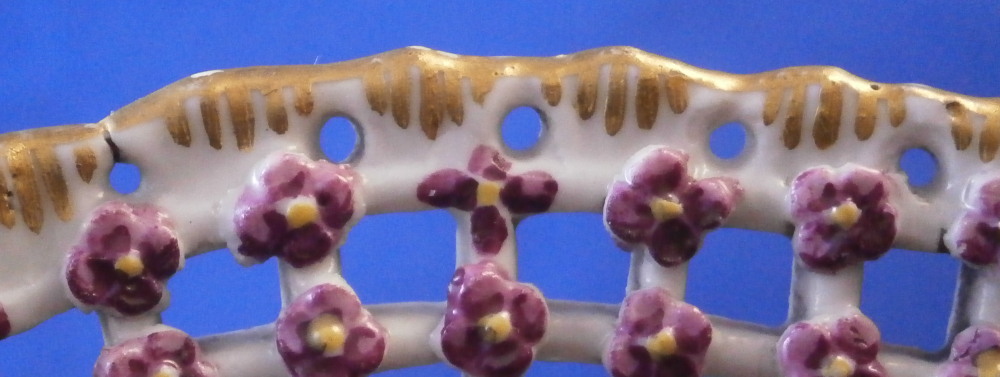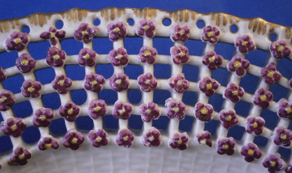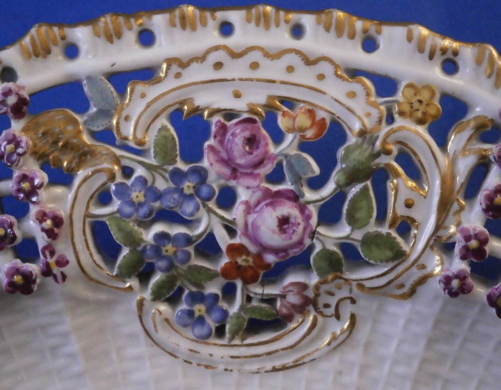 This is a rare treat - a Meissen plate made just prior to 1740 by Meissen. Only these really early pieces get this fancy and nice and it's not a style you really see much later anymore. The plate well is entirely done in a relief basket weave design with a scroll relief panel in the center with hand painted fruit, flowers and vegetables inside. The scrolls are highlighted with gilding. The entire rim of the plate is just amazing. It is fully reticulated with four panels of floral designs all hand painted with those amazing early colors and the space between the them is reticuated as well and each intersection has a purple forgetmenot type flower applied to it. The edge has holes pierced into it and a gold trim to it. Never seen this design before and it is stunning. Must have taken ages to make just this one plate which explains why you just don't see this type of work and quality very often at all even from the top maker. So fragile! The plate in superb condition with a bit of gold wear mainly to the center scroll area and the scrolls right under the flower designs and some hairline / firing cracks from when it was made in the reticulated areas and rim edge as shown. This is not later damage but from when it was made and completely normal on these very early pieces. A stunning plate you will likely never find again! The plate is 1.5 inches tall and 9.375 inches in diameter. It is marked with the under glaze blue crossed swords mark underneath as shown no impressed number yet so nice and early! Please email me for more information or other pictures.