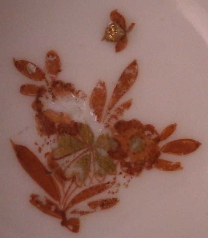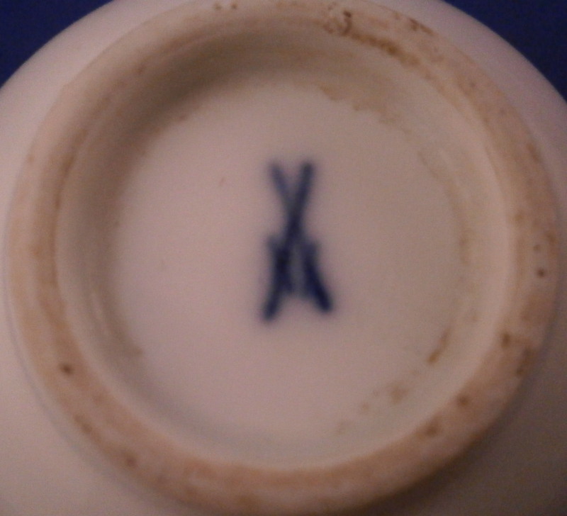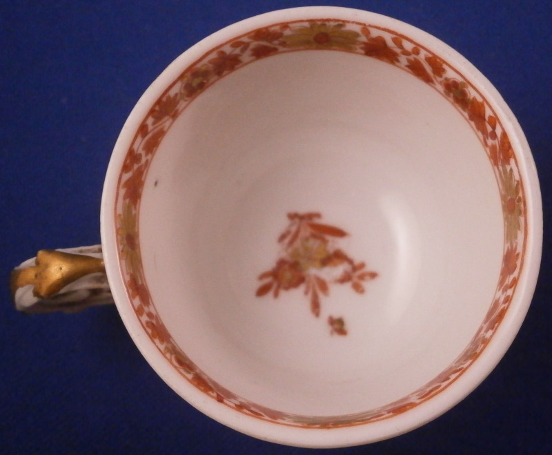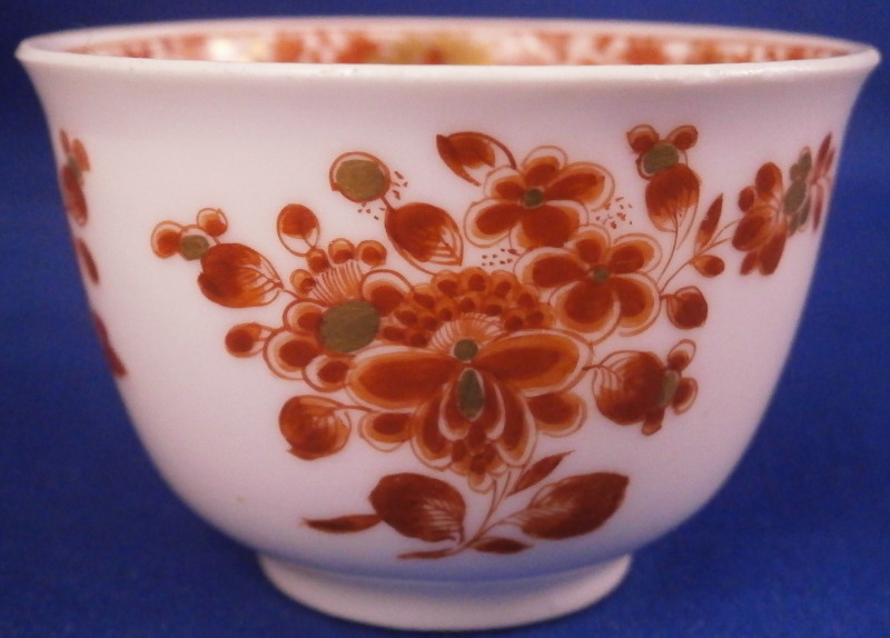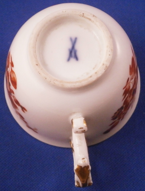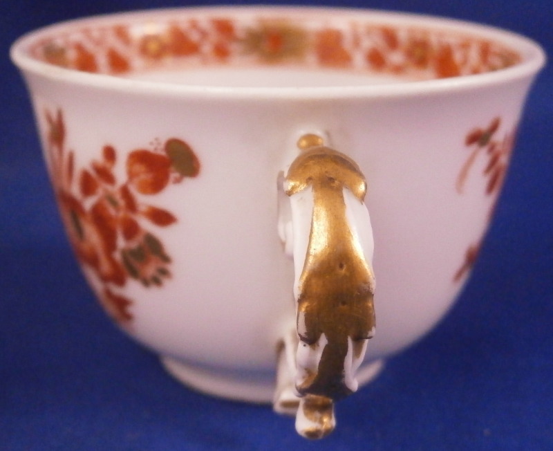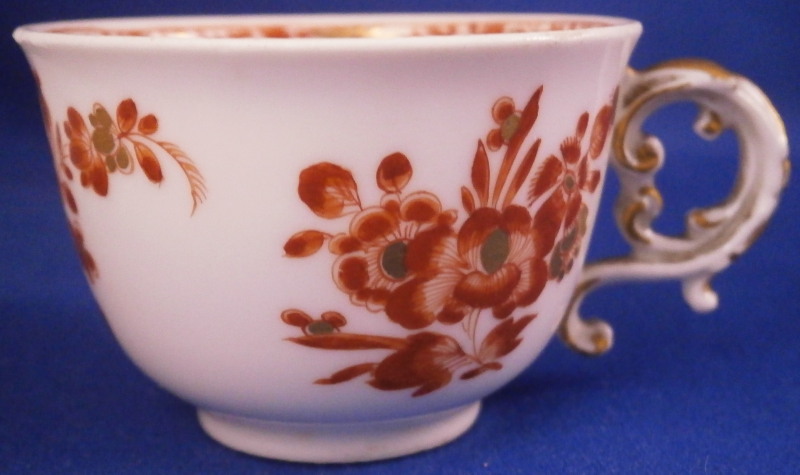 This is an early child's cup made by Meissen pre 1740. It is hand painted with the hard to find orange Indian flowers design with three superb floral arrangements all around, a small one to the bottom inside and a nice trim to the inside all done in orange / rush tones with gold highlights. Gold trim to the nicely shaped handle (a shape you really only see early on). The cup is in great condition with a bit of flaking to the flower on the bottom inside - othersie it is perfect! The cup is 1.375 inch tall and 2.125 inches in diameter plus the handle which sticks out about 0.625 inches. The piece is marked with the under glaze blue crossed swords mark - no impressed number yet so a nice early piece. Please email me for more information or other pictures.