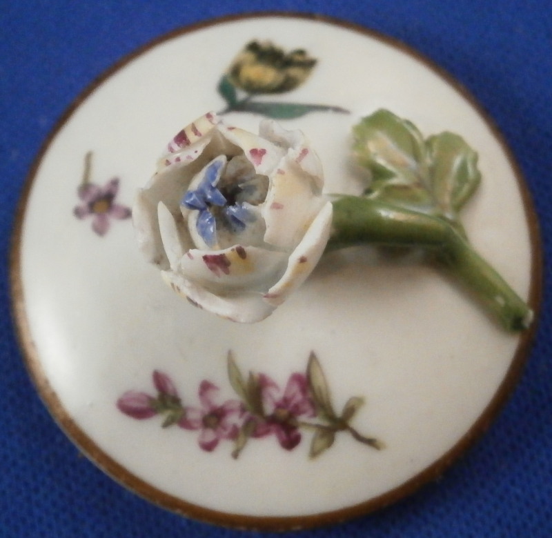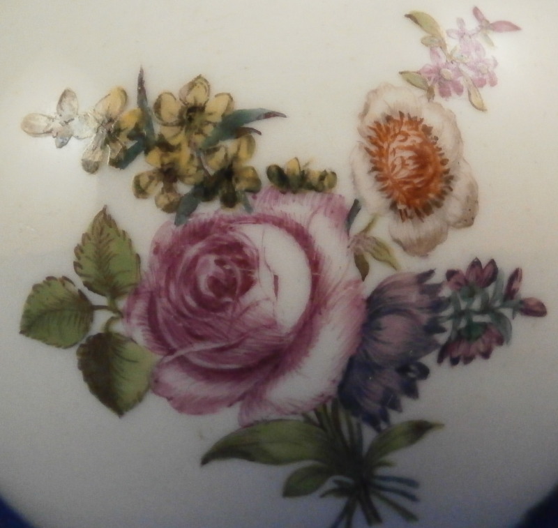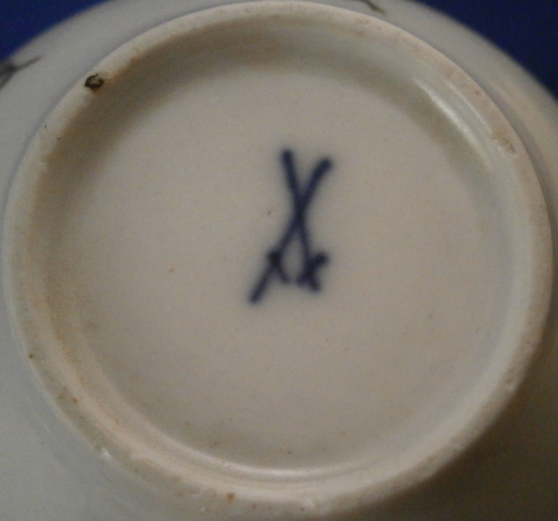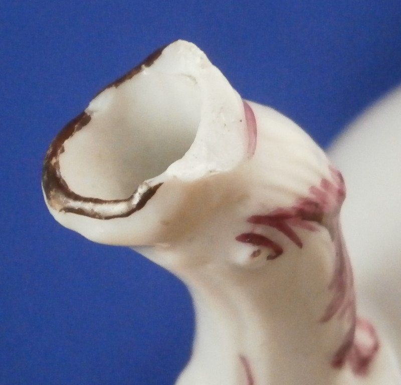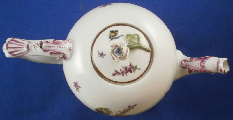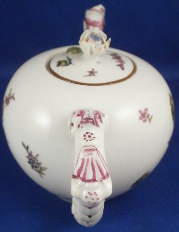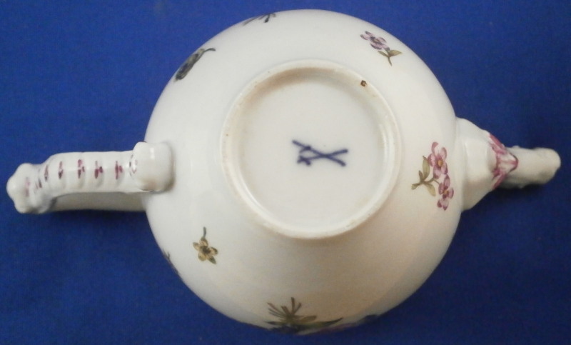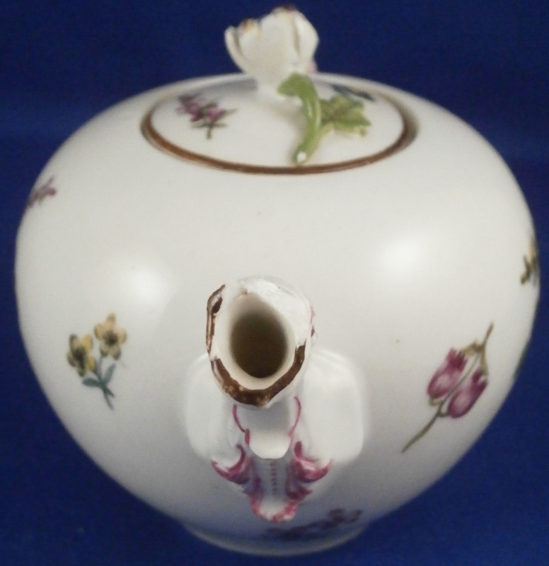 This is a rare early miniature teapot made by Meissen before 1740. Likely for a solitaire or something along those lines. It does not have an impressed number yet but I don't think it is much before 1740. Maybe a year or two. The tea pot is nicely modeled with an animal spout, lots of nice designs along the handle and spout highlighted in puce and has a superb floral arrangement in the woodcut style to the front and back as well as some small lone flowers. The lid has some small flowers to it as well and a floral finial including a stem and leaf. Brown trim to the edge of the lid as well as the spout. The little pot is stunning and displays nicely but has a chip to the end of the spout as shown. Some minor chipping to the finial but otherwise it is in top condition! . Marked with the under glaze blue crossed swords to the bottom as shown. The pot is 2.75 inches tall, 3 inches wide and 5.5 inches long. Please email me for more information or other pictures.