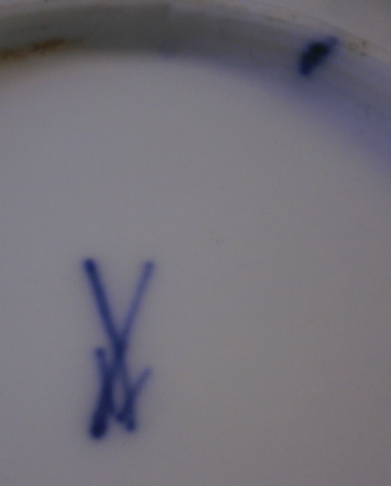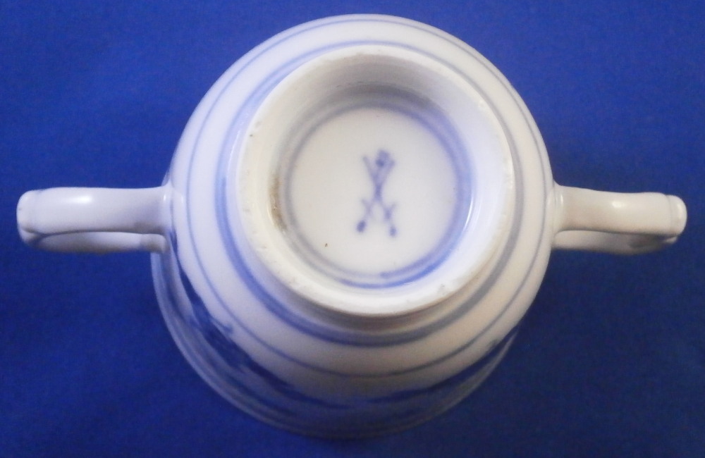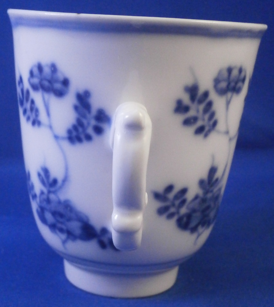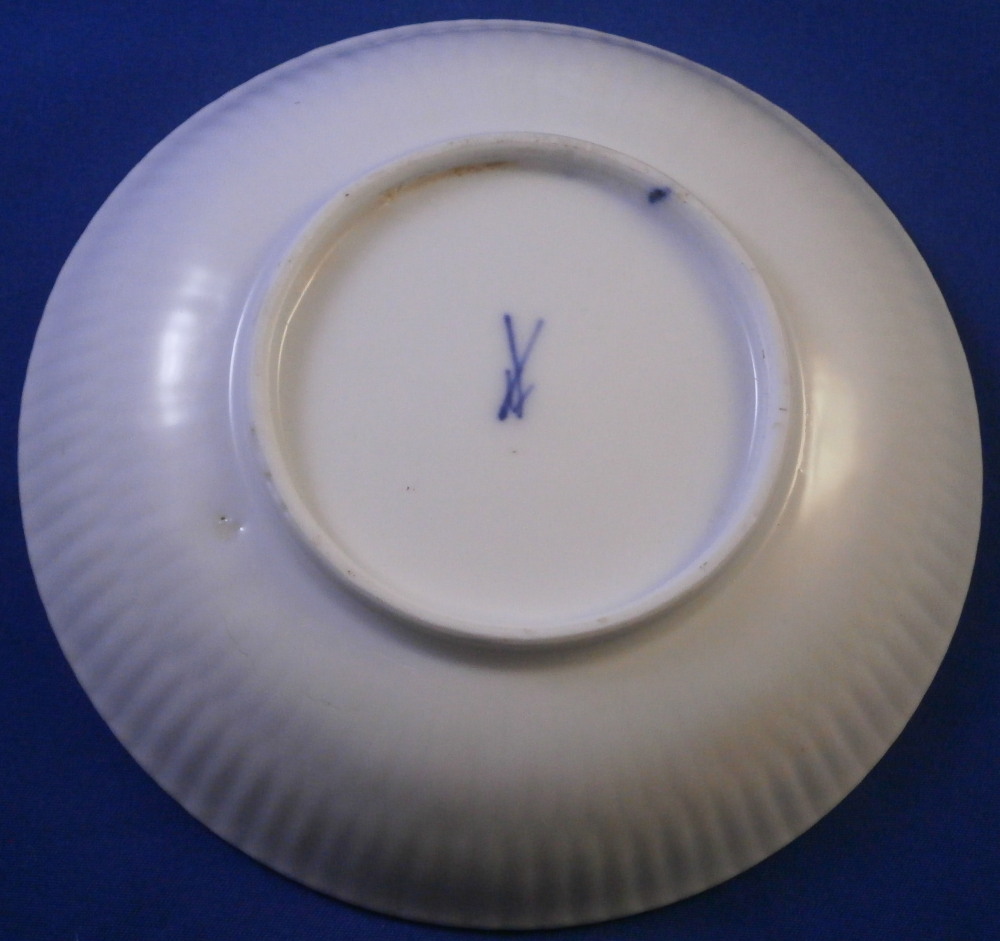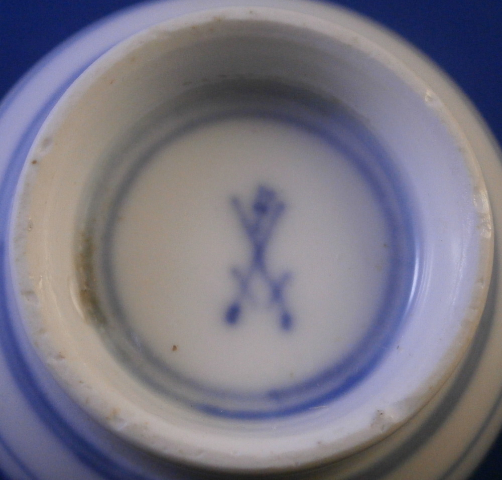 This is a nice early chocolate cup and saucer set made by Meissen before 1740. It is very rare to find one of these early sets these days. Both pieces are hand painted with the well known strawflower design used by so many makers.The design goes all around and there is a nice trim to the inside edge of the cup. Typical early handle shape to both sides of the cup. The set is in superb condition with some minor firing flaws to the paste normal to these early wares. A black spot on the top edge of the cup being the most obvious. The saucer has a ribbed design to the underside which is a nice addition. The cup is just over 2.75 inches tall, 4 inches from handle to handle and 2.625 inches in diameter. The saucer is 1 inch tall and 4.875 inches in diameter. Both are marked underneath with the early under glaze blue crossed swords mark from this period as shown. No numbers yet as they started being used later. The saucer also has a blue line along the foot ring likely a mark for the blue painter. I added a pics with a strong light shining through the saucer to show the flaws their early paste had. I have a matching set on the site as well. Please email me for more information or other pictures.