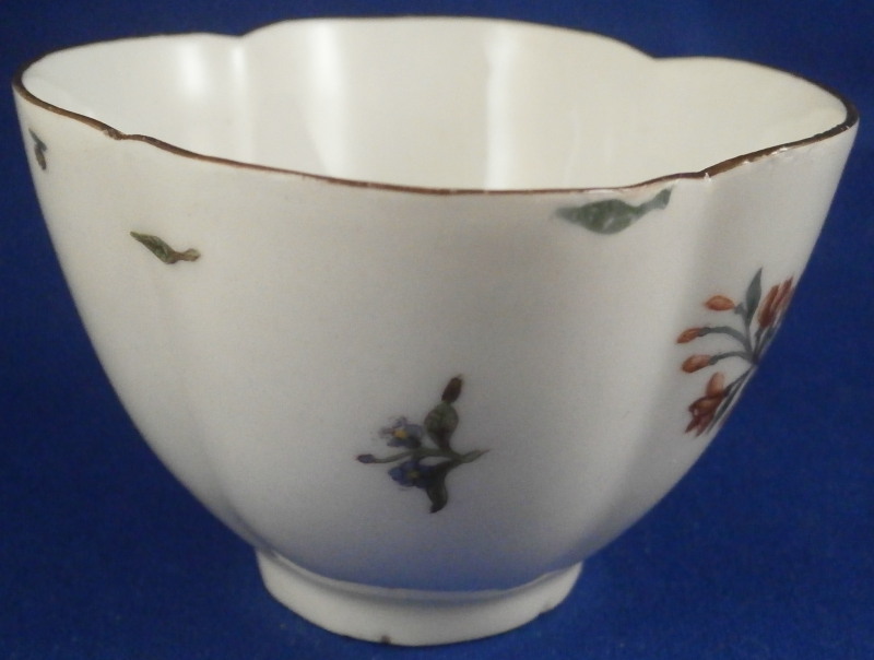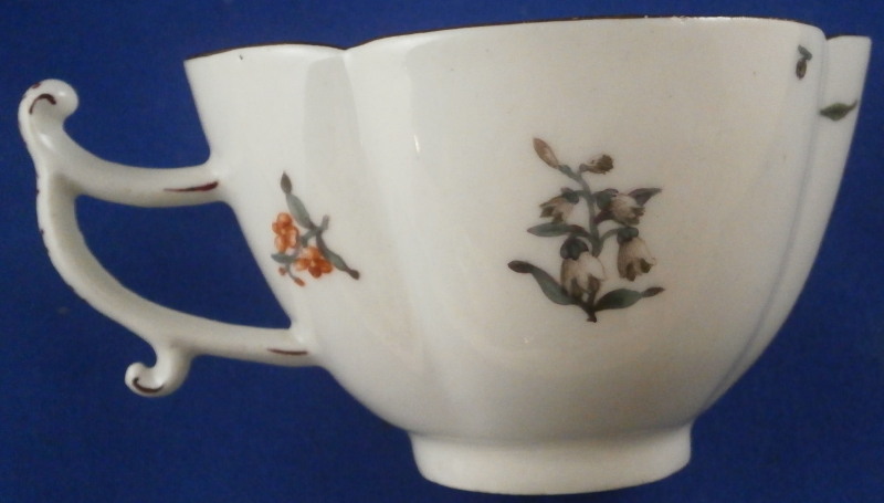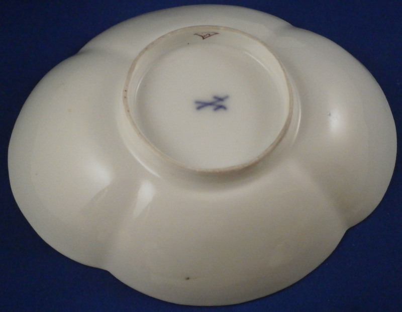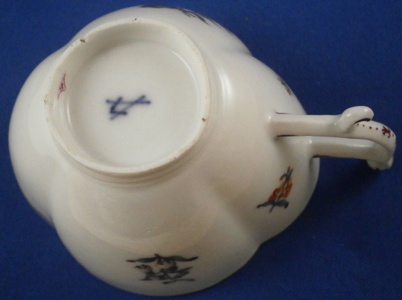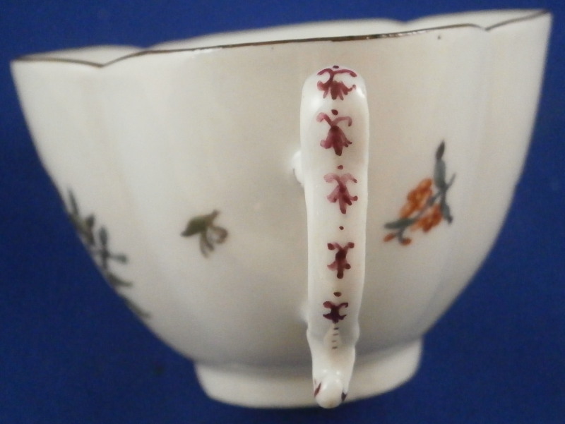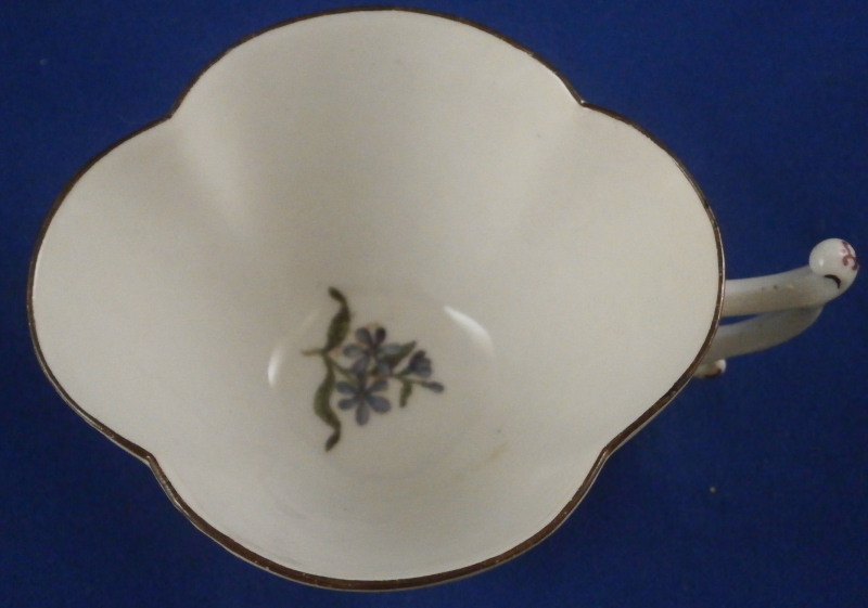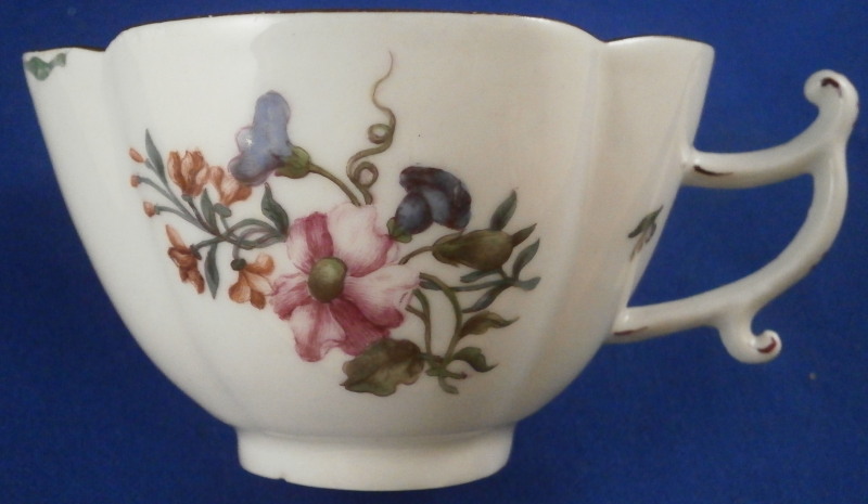 This is a very early and superb cup and saucer set made by Meissen just before 1740. The porcelain has that superb warm white color to the paste that I love about some early Meissen pieces, the quatrefoil shape is superb and the decoration is top as well. There is a large floral arrangement hand painted on the front of the cup and to one side of the saucer with smaller flowers and leaves scattered throughout the rest of the pieces, a brown trim to the edge and a puce design to the handle as shown. A really superb piece! The flowers on these pieces are much more natural looking and much more detailed than later ones. The cup and saucer are in perfect condition. The cup is just over 2 inches tall, 3.375 inches from front to back without the handle and just over 3 inches wide. The saucer is 1.375 inches tall, 5.5 inches wide and 4.75 inches deep. Both pieces are marked with the underglaze blue crossed swords mark underneath. No impressed numbers yet on this set so a very early one! Both pieces have a painter's mark in puce as shown that match so these were always a set for sure. Please email me for more information or other pictures.