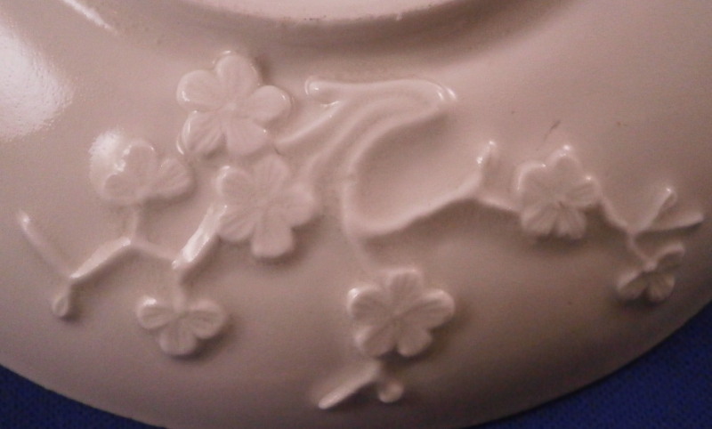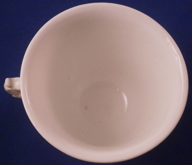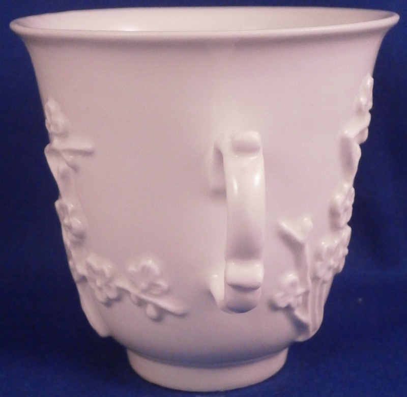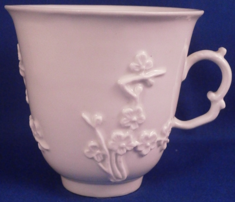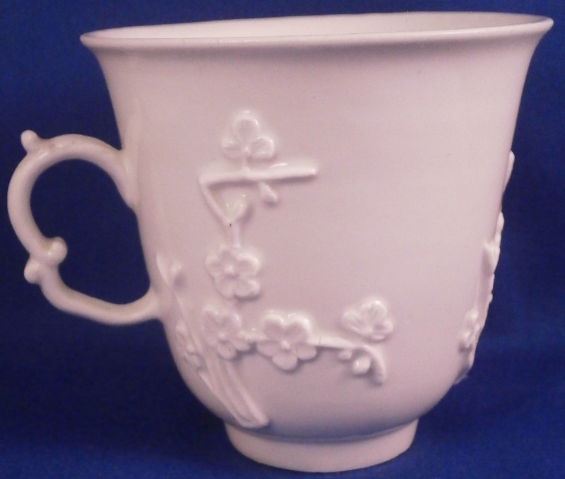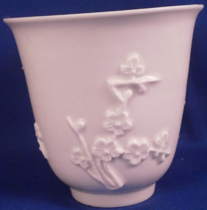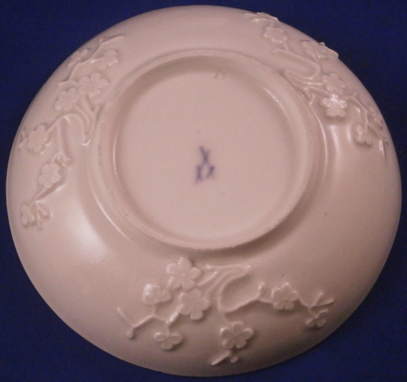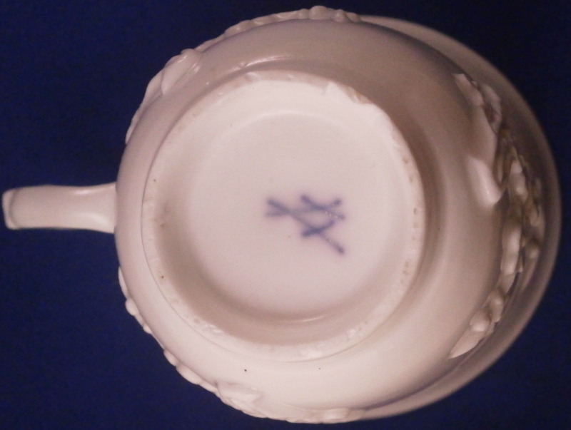 This is a really nice early beaker type chocolate cup and saucer made by Meissen in about 1740. The set is decorated with the raised prunus blossom decoration on the underside of the saucer and around the sides of the cup and are otherwise left plain white to show of their porcelain - white was more treasured than painted back then! The handle of the cup is superb and a typical early shape! Both the cup & saucer are in great condition with some minor chipping to the inside edge of the foot on the cup under side. A couple of minor inclusions to the inside bottom of the cup from when it was made. Both pieces are marked with the under glaze blue crossed swords underneath as shown. Tehe cup is a touch earlier and does not ahve an impresed number yet just the letter D while the saucer has an impressed 63 as shown and is a touch later than the cup so the set dates right around 1740. The saucer is 5.25 inches in diameter and 1.125 inches tall. The cup is 2.75 inches tall and has a diameter 2.75 inches. Please email me for more information or other pictures.