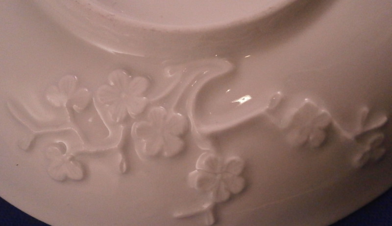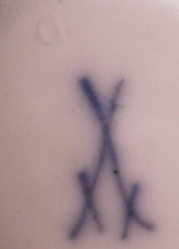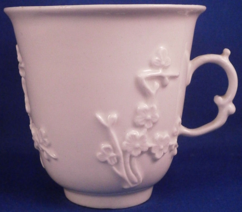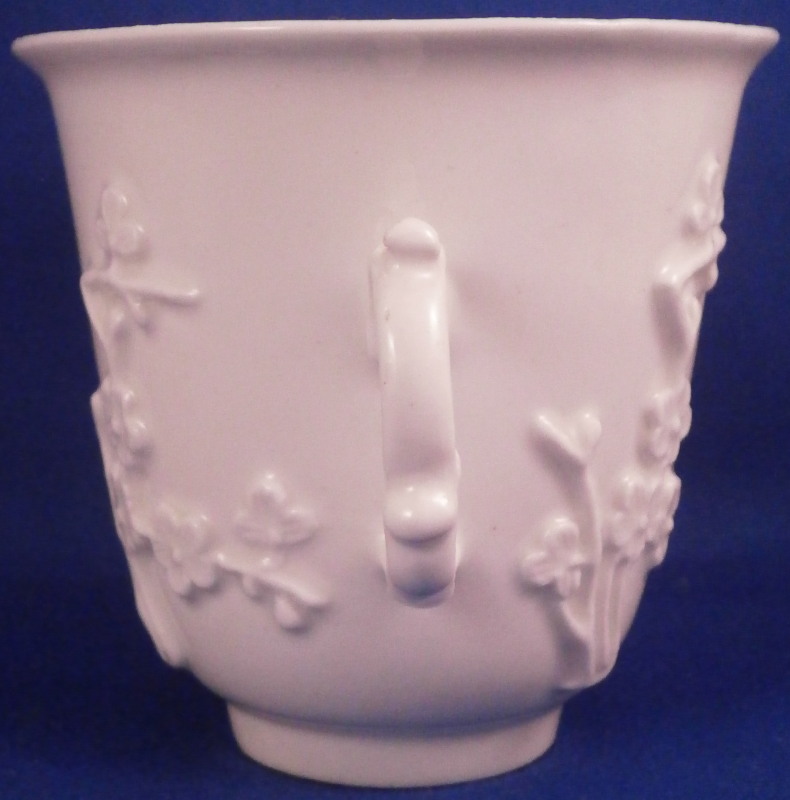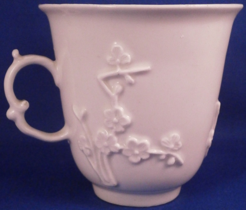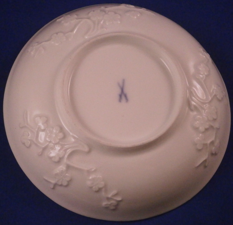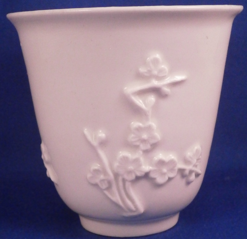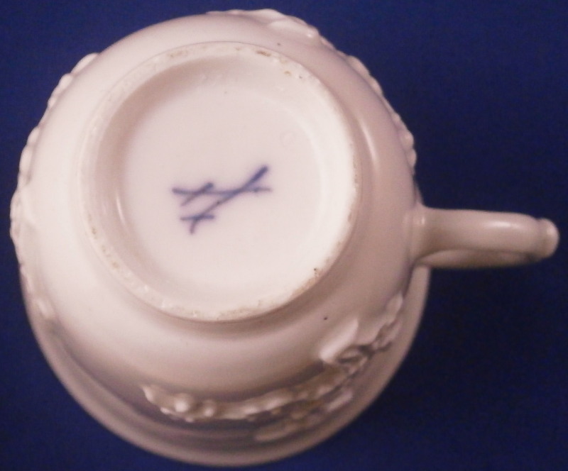 This is a really nice early beaker type chocolate cup and saucer made by Meissen in about 1740. The set is decorated with the raised prunus blossom on the underside of the saucer and around the sides of the cup and are otherwise left plain white to show of their porcelain - white was more treasured than painted back then! The handle of the cup is superb and a typical early shape! Both the cup & saucer are in great condition with just a couple of inclusions to the inside bottom of the cup from when it was made. Both pieces are marked with the under glaze blue crossed swords underneath as shown. The cup is a touch earlier and does not have an impressed number yet just the letter D while the saucer has an impressed 63 as shown and is a touch later than the cup so the set dates right around 1740. The saucer is 5.375 inches in diameter and 1 inch tall. The cup is 2.875 inches tall and has a diameter 2.75 inches. Please email me for more information or other pictures.