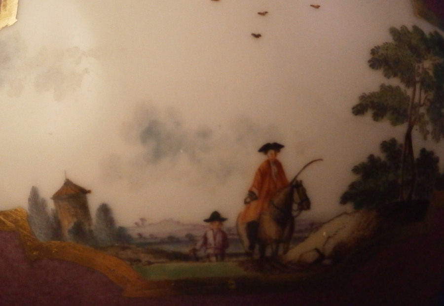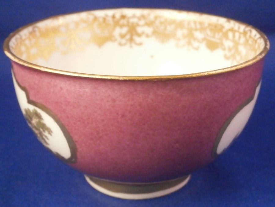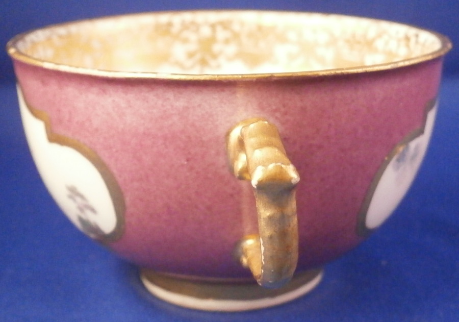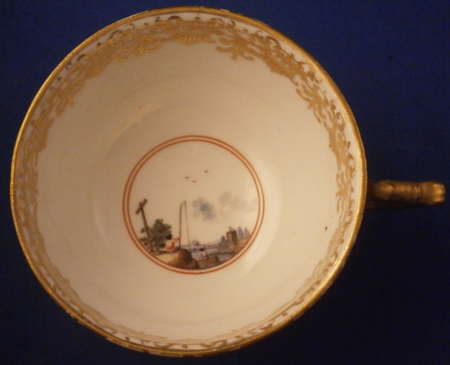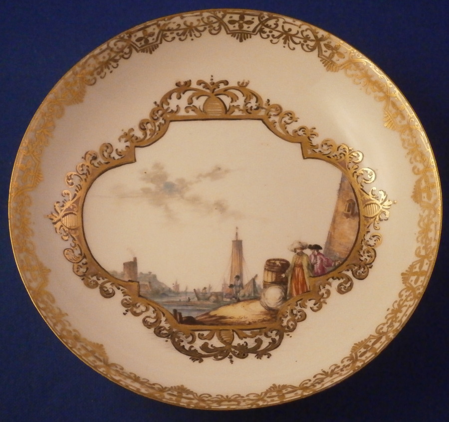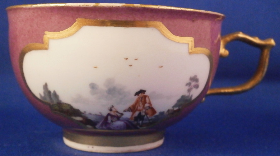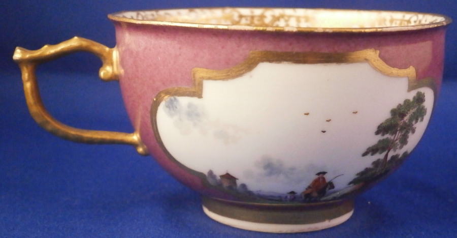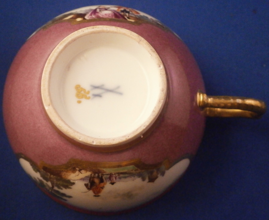 This is an amazing and very early puce or purple (sometimes called Blackberry ) ground cup and saucer made by Meissen in about 1740. Both pieces are hand painted with superb harbor / merchant type scenes as well as this superb mottled purple ground color. The saucer has the entire well painted with a large scene including buildings, ships and people surrounded by a fancy black and gold trim with a touch of what I believe is the famous Boettger luster color in the open areas of the trim on the sides. Fancy gold trim to the edge and puce ground color to the underside rim with a gold line along the outside of the foot. The cup has a really nice scene to the front and back each of which is surrounded by a nicely shaped gold trim, same fancy trim as the saucer to the inside rim, gold trim along the foot ring, gilded nicely shaped handle and another super scene to the bottom inside surrounded by a double red line trim. The set is stunning for sure! The set is in as good a condition as one could hope for with some very minor wear to the gilding and a single spots of wear to the scene of the saucer - on top of the barrel. The only thing worth noting is that the purple ground on the two pieces is not an exact match but they are definitely a set and that color was notorious for being difficult to control and a small temperature change gave it a slightly diffferent hue. The cup is 1.875 inches tall and has a diameter of 3.125 inches. The saucer 1.125 inches tall and has a diameter of 5.25 inches. Each piece is marked with the under glaze blue crossed swords mark from this period underneath as shown and both have a gold 55 mark as well as an impressed number. Please email me for more information or other pictures.