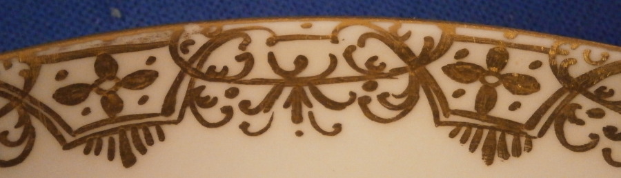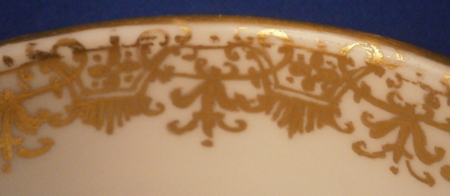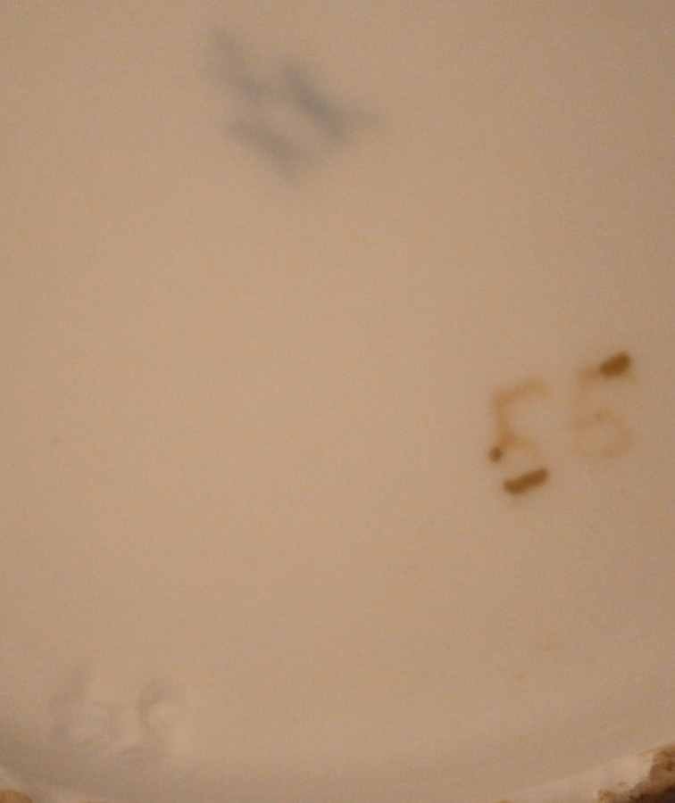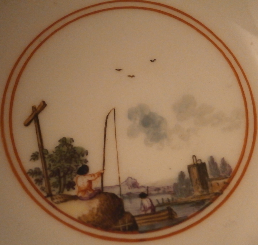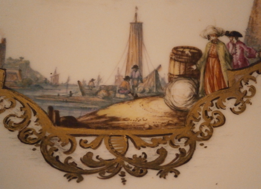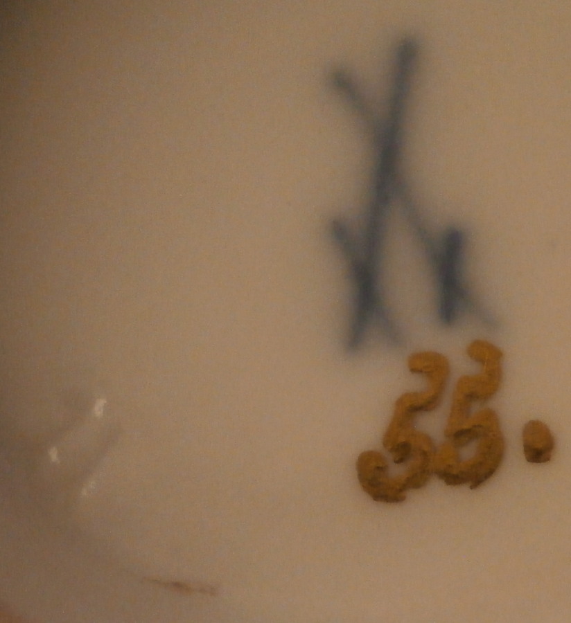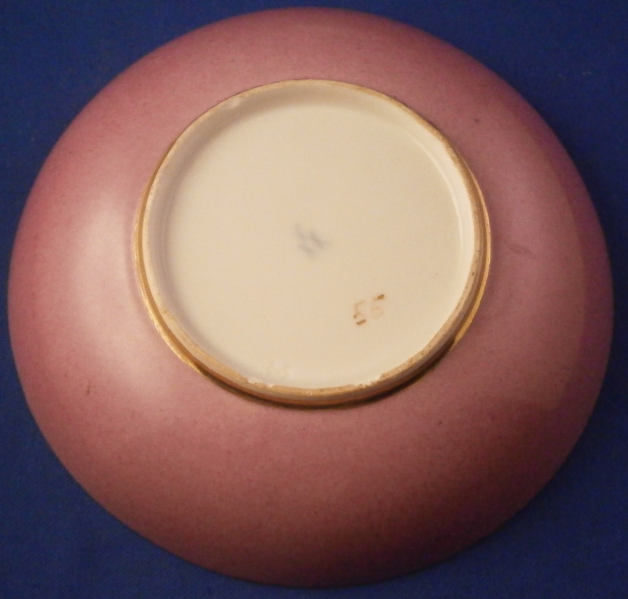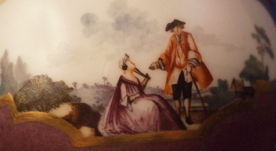 This is an amazing and very early puce or purple (sometimes called Blackberry ) ground cup and saucer made by Meissen in about 1740. Both pieces are hand painted with superb harbor / merchant type scenes as well as this superb mottled purple ground color. The saucer has the entire well painted with a large scene including buildings, ships and people surrounded by a fancy black and gold trim with a touch of what I believe is the famous Boettger luster color in the open areas of the trim on the sides. Fancy gold trim to the edge and puce ground color to the underside rim with a gold line along the outside of the foot. The cup has a really nice scene to the front and back each of which is surrounded by a nicely shaped gold trim, same fancy trim as the saucer to the inside rim, gold trim along the foot ring, gilded nicely shaped handle and another super scene to the bottom inside surrounded by a double red line trim. The set is stunning for sure! The set is in as good a condition as one could hope for with some very minor wear to the gilding and a single spots of wear to the scene of the saucer - on top of the barrel. The only thing worth noting is that the purple ground on the two pieces is not an exact match but they are definitely a set and that color was notorious for being difficult to control and a small temperature change gave it a slightly diffferent hue. The cup is 1.875 inches tall and has a diameter of 3.125 inches. The saucer 1.125 inches tall and has a diameter of 5.25 inches. Each piece is marked with the under glaze blue crossed swords mark from this period underneath as shown and both have a gold 55 mark as well as an impressed number. Please email me for more information or other pictures.